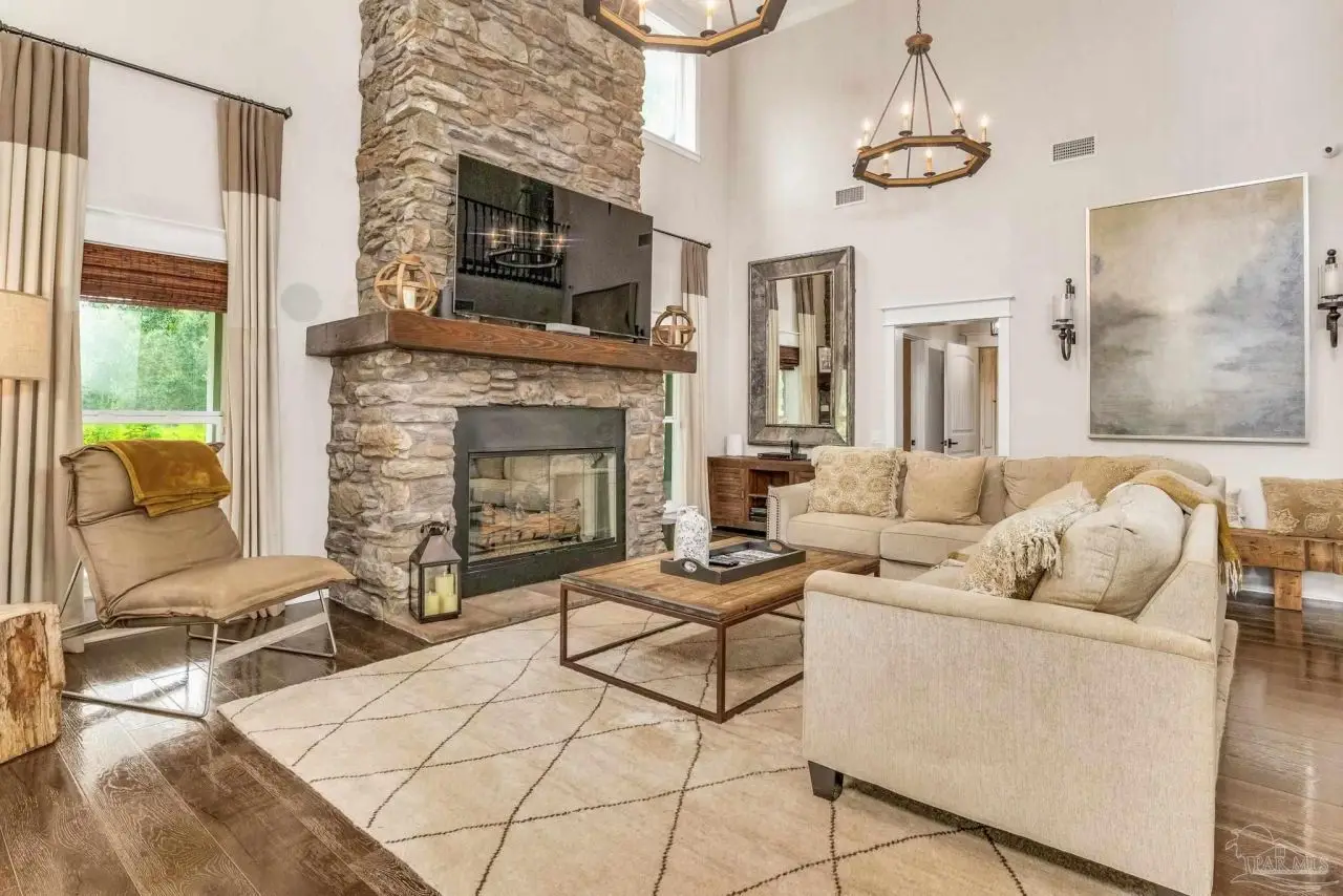 Cathedral ceilings with floor-to-ceiling stone fireplace