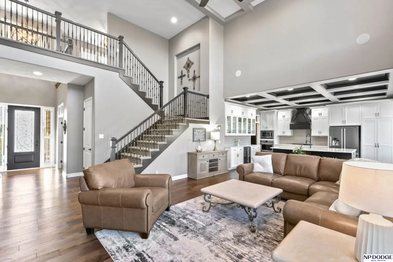 Ashbury Farm - Papillion's most prestigious neighborhood! Custom 1.5-story w/ 4 bd + office & exercise rm, 5 bath, 5,000+ SF. Main-floor primary suite w/ spa-like bath, built-in safe & custom cabinetry. Grand great rm w/ 20' coffered ceilings & stone fireplace. Gourmet kitchen w/ large island, wine fridge & walk-in pantry. Upstairs: 3 bd all w/ private baths & walk-in closets. Lower level made for entertaining - bar, pool/game rm or optional 5th bd, 3/4 bath & exercise rm. Outdoor living w/ covered patio, fireplace, custom firepit & landscaped fenced corner lot. Oversized 3-car garage. Unmatched value - better in person, a must-see!