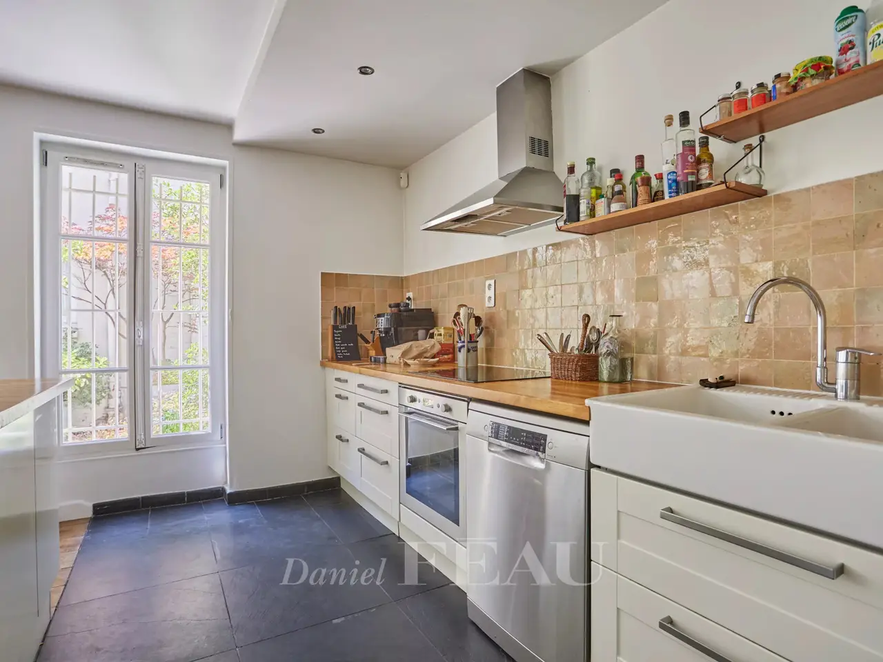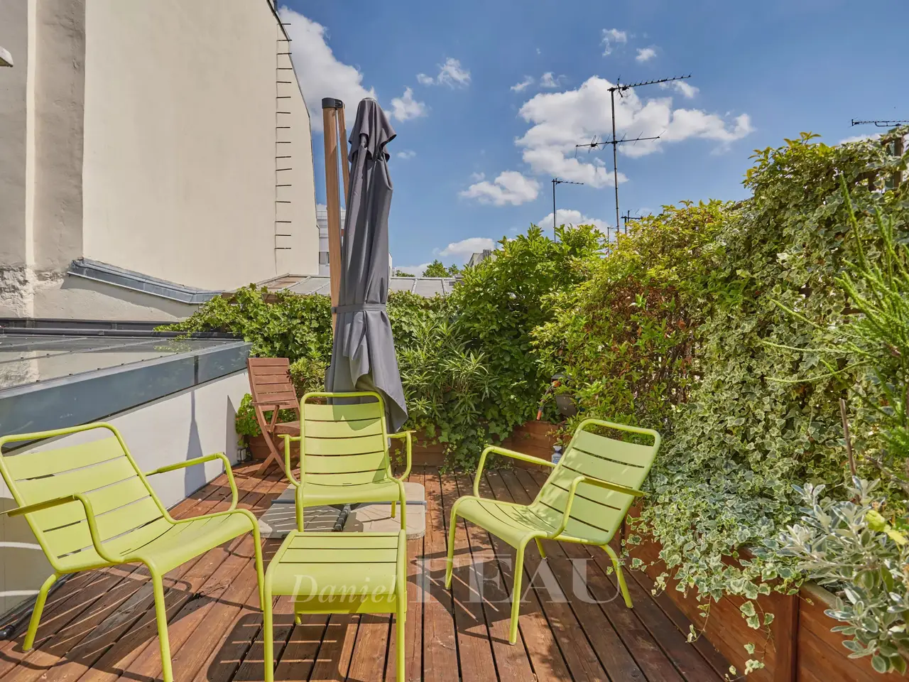 A rare opportunity in a prime location. This entirely renovated 170 sqm period property benefiting from 70 sqm terraces is located in a leafy paved cul-de-sac just a stone’s throw from rue de la Jonquière. It includes a spacious living/reception room, a dining room, an equipped kitchen with a central island, a pantry and a guest wc. Upstairs are a little TV lounge, two bedrooms, and a bathroom with a wc. The top floor comprises two further bedrooms each with a shower room/wc accessing a terrace which leads to a second leafy fitted roof terrace A parking space may be acquired. A 28 sqm two-room apartment in the same street may be acquired for a further 350000€