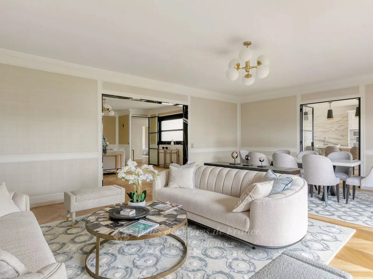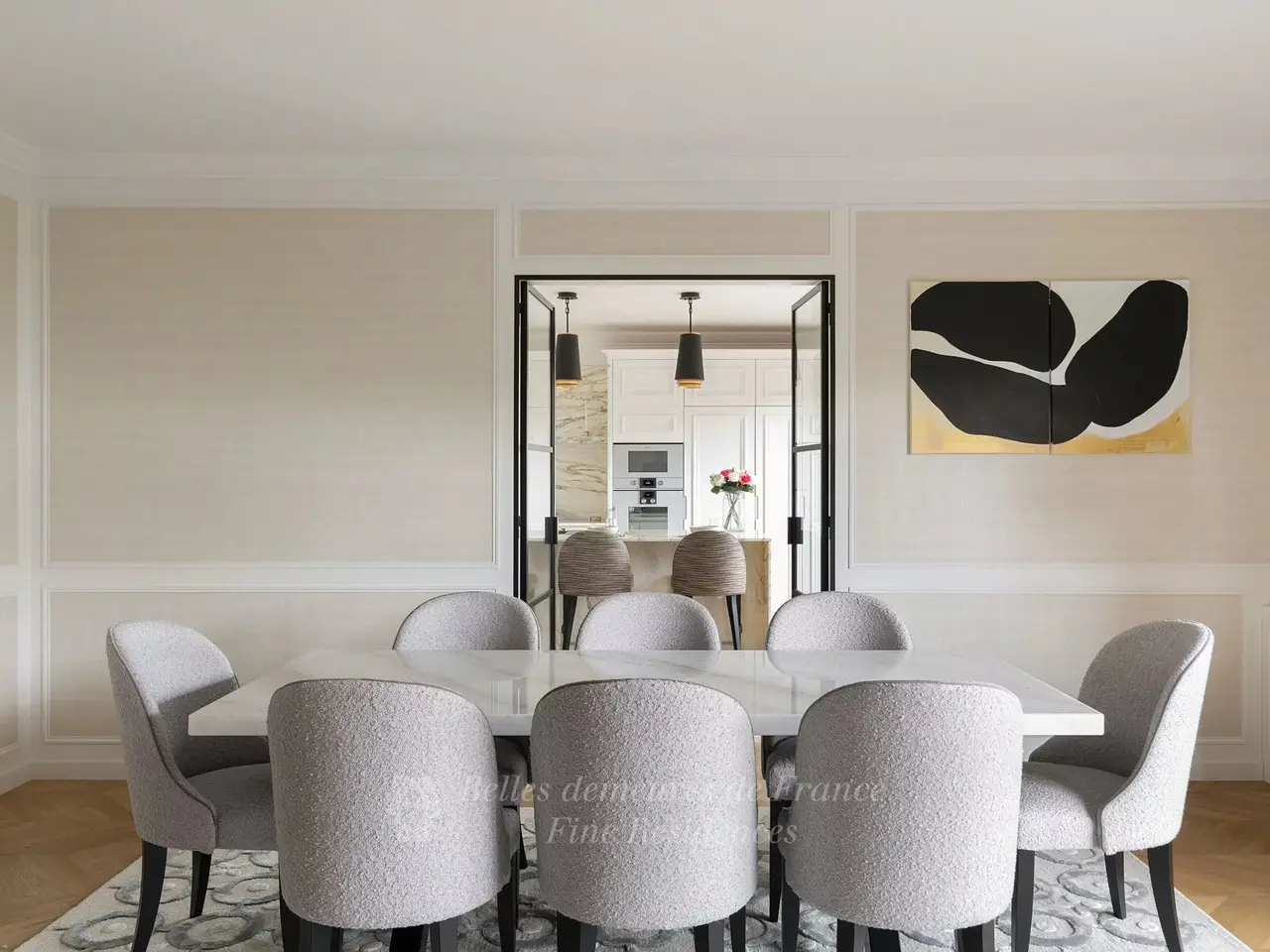 This entirely renovated 260 square meter dual-aspect apartment bathed in sunshine is on the 3rd floor of a magnificent Art Deco building with superb common areas located on the edge of the Champ de Mars. Commanding exceptional views of the Eiffel Tower, it includes a double living/reception room opening onto two balconies, a dining room, a drawing room or study, a kitchen, a utility room, a master suite with a bathroom and dressing room, three further bedrooms and a bathroom. With a near 25 square meter studio apartment, four cellars and a parking space in the building. An exceptional family apartment near the shops and the schools.