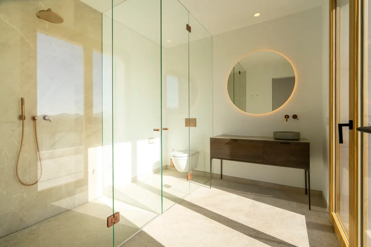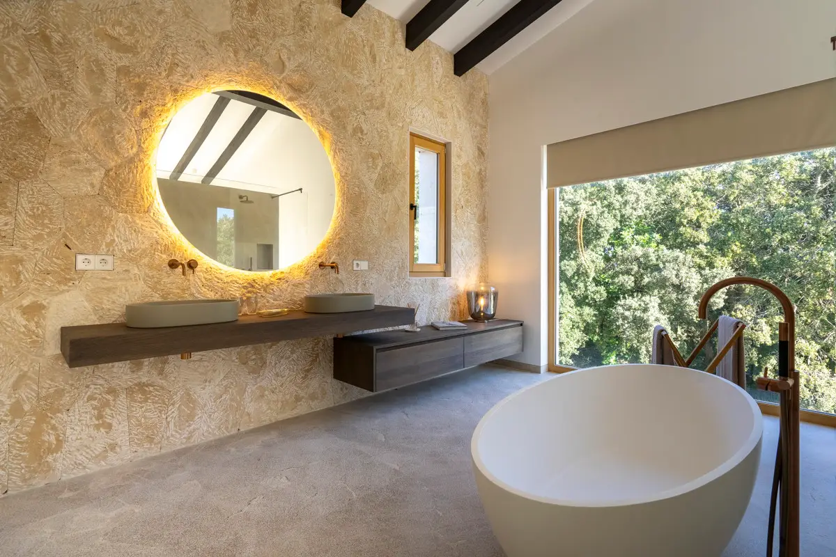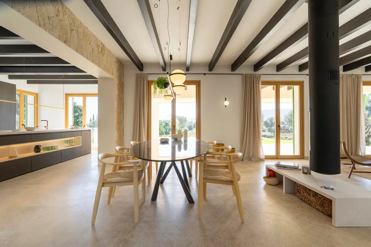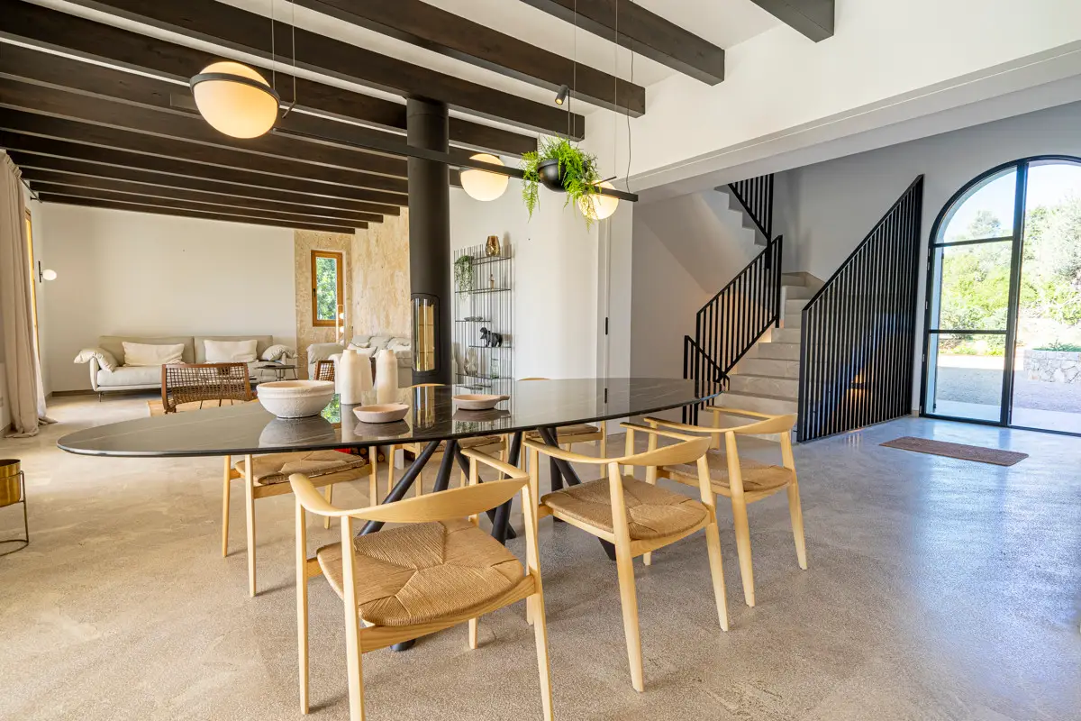 Welcome to "Ca'n Marina" - a luxurious house on a stunning plot near the historic town of Pollensa, in the north of Mallorca. The property extends over a living space of approximately 405 m² and is located on a spacious plot of approximately 14,121 m². With five rooms, four bedrooms and five bathrooms, this property offers enough space for a large family or guests. The construction of the house meets the highest standards in terms of design and technical equipment. The main focus was to perfectly integrate the property into its natural surroundings and offer panoramic views over the surrounding landscape. Inside the house you will find a spacious and well thought out layout. The high entrance hall leads into a bright living room with an adjustable fireplace that separates the dining and living areas. The tailor-made kitchen is an absolute highlight and has high-quality fittings. An en suite bedroom with access to a private terrace, a utility room and a cloakroom complete the ground floor. The first floor houses two further bedrooms with bathrooms as well as a magnificent master suite with dressing area and sauna. From here you have a wonderful view of the surrounding landscape. Two of the bedrooms have direct access to the large balcony which overlooks the garden and pool area. A fully equipped basement with natural stone floors provides additional space for various uses such as a home theater, gym or wine cellar. An outbuilding on the property serves perfectly as a storage or multifunctional room. The impressive property is insulated and has underfloor heating on all three floors, integrated air conditioning and a smart ventilation system. The outdoor area is a true oasis of relaxation. With a swimming pool, several open and covered terraces and a variety of Mediterranean plants, the property invites you to spend time outdoors. The location of the finca is ideal. It is located just half an hour from the city of Palma and the airport, but far enough away to enjoy the peace and privacy of rural life in Mallorca. If you would like further information about this property, please contact us and we will send you our detailed property brochure.