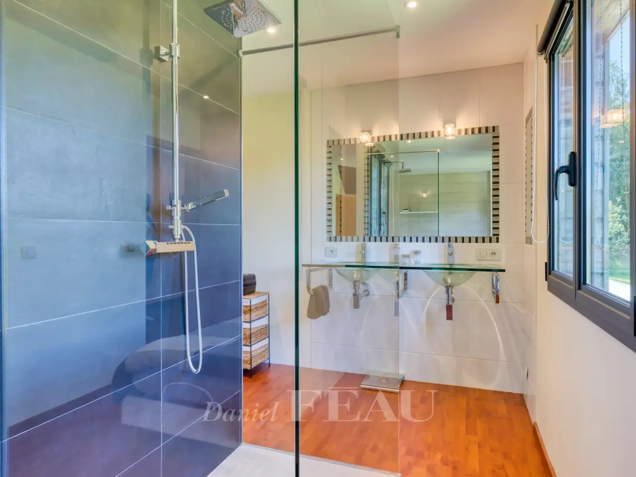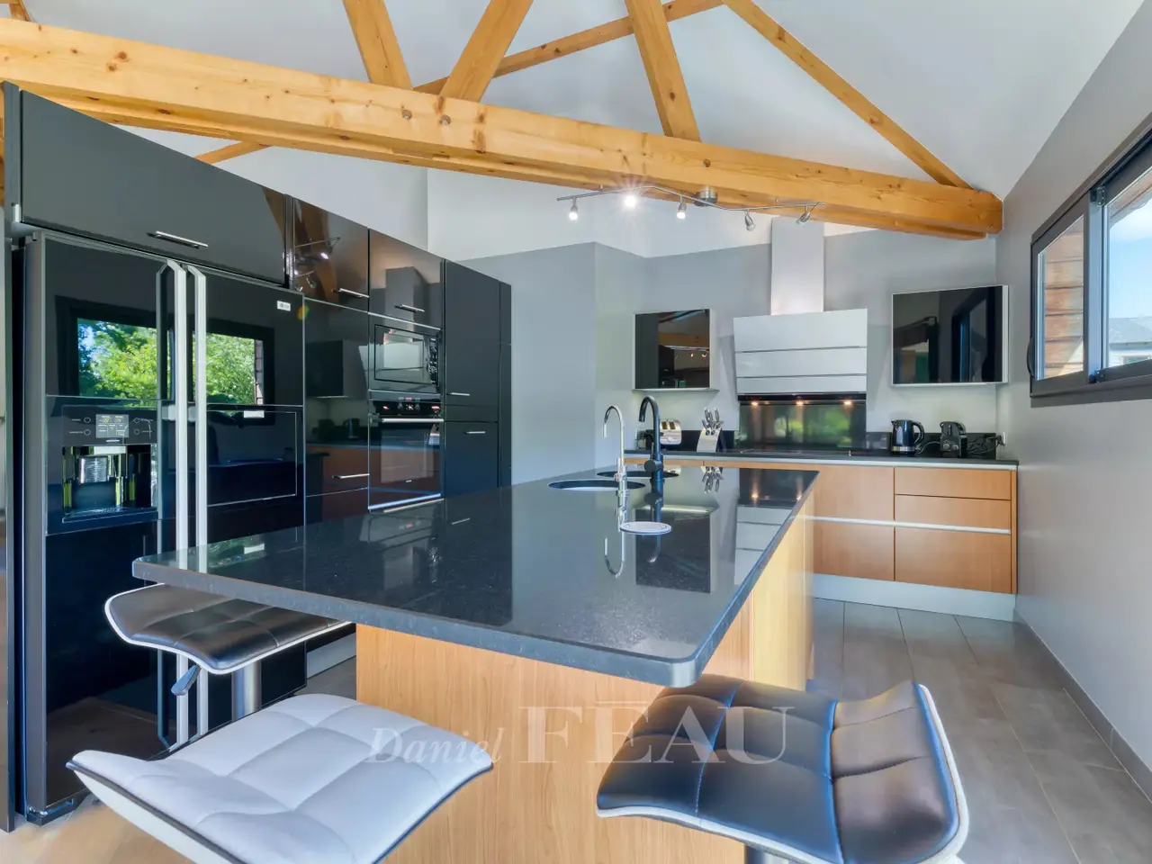 Daniel Féau Deauville presents an architect-designed house built in 2006 in a bucolic setting on 2.5 hectares of land near Pont l'Evêque. First floor: living room - lounge - dining room with central fireplace and cathedral ceiling opening onto a vast south-facing terrace, open-plan fitted and equipped kitchen, toilet with washbasin. Garden level: entrance with checkroom, 3 bedrooms, shower room, 1 master suite with double-sink shower room and wc, gym - spa and Finnish infrared sauna for 4 people and hammam. 1 large room (approx. 65 m²) for conversion. Aerothermal heating, water softener, osmosis system, underground wine cellar. SWIMMING POOL heated by heat pump, electric shutter and wooden deck. 4000-liter water recuperator. Parking space. Wooden outbuilding: carriage house, 3-car garage, upstairs 2-room apartment. All benefiting from a magnificent unobstructed view.