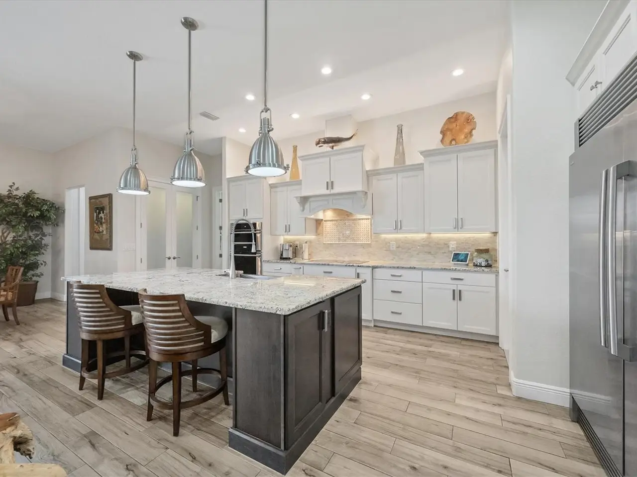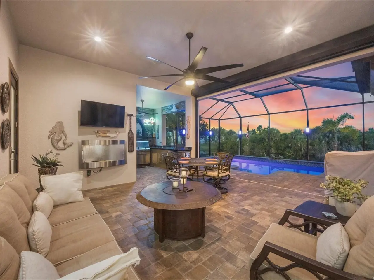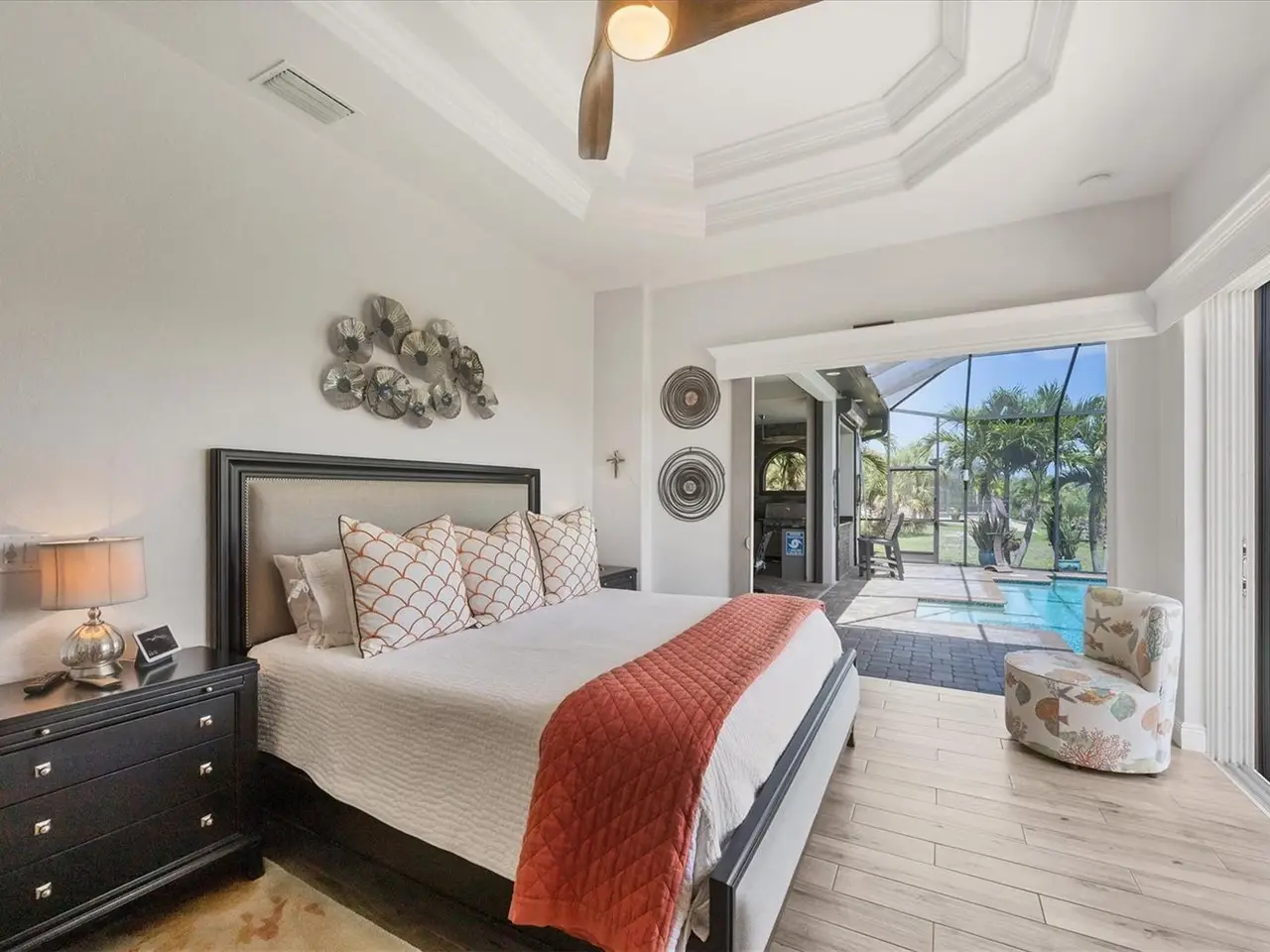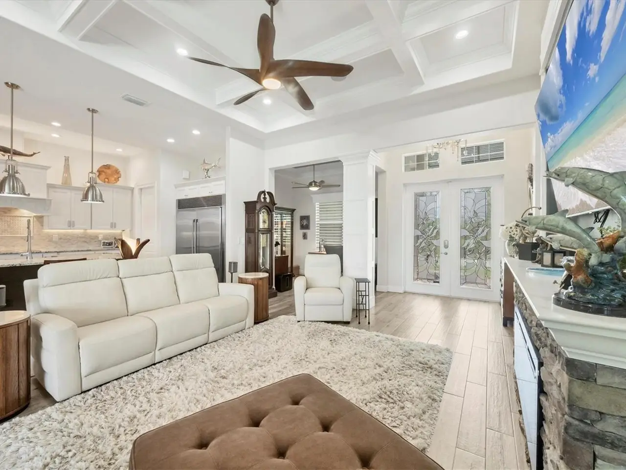 Tucked in a serene Florida waterfront community, this elegant 3-bedroom, 2-bath custom home is the perfect blend of luxury, comfort, and smart design. From the moment you arrive, it’s clear that every inch of this property has been thoughtfully crafted—from the paver driveway and travertine entrance to the gorgeous etched glass double doors that make a striking first impression. Inside, you’re greeted by rich wood-look tile flooring, custom tray ceilings, and a welcoming open layout that flows effortlessly from room to room. The living space is bright and open, with oversized sliders framing stunning water views that never get old. Whether you’re hosting a holiday party or simply relaxing by the electric fireplace with family, this home makes it easy to live beautifully. And the kitchen? It’s a chef’s dream. With a massive 9-foot quartz island, an Electrolux 5-burner induction cooktop, wall ovens, an oversized refrigerator/freezer, and high-end fixtures, cooking becomes a joy — not a chore. You’ll find yourself gathering here often, whether for morning coffee or sunset hors d'oeuvres. The primary suite is a peaceful retreat. Wake up to water views and step directly out to the lanai. The spa-style en-suite bathroom features an oversized walk-through shower, dual vanities, and a 13x8 walk-in closet so spacious it could be its own room. Across the home, two guest bedrooms ensure privacy and comfort for family or visitors. Step out onto the lanai and your private resort awaits. A heated saltwater pool with a soothing water feature invites you in for a dip. Entertain at the fully equipped summer kitchen with a Webber Summit grill and expansive bar space—perfect for laid-back evenings with friends. New pool screens installed in 2023 keep everything fresh and beautiful. And when a storm rolls in? Just press a button—automatic hurricane shutters protect everything, no need to move a single chair. As the sun sets, stroll down the lighted captain’s walk to your private 16-foot composite dock, complete with water and electric hookups and a walk-around 10,000 lb. boat lift—making every boat day easy and effortless. This home is not just beautiful, it’s built for peace of mind. From impact-resistant glass and electric shutters to Icynene insulation, Nest smart home features, and a newly painted exterior (2023), it’s as smart and secure as it is stunning. There are too many extras to list—but one walk through will show you: this is more than a home, it’s a lifestyle. Schedule your private tour today and experience the very best in Florida luxury living.