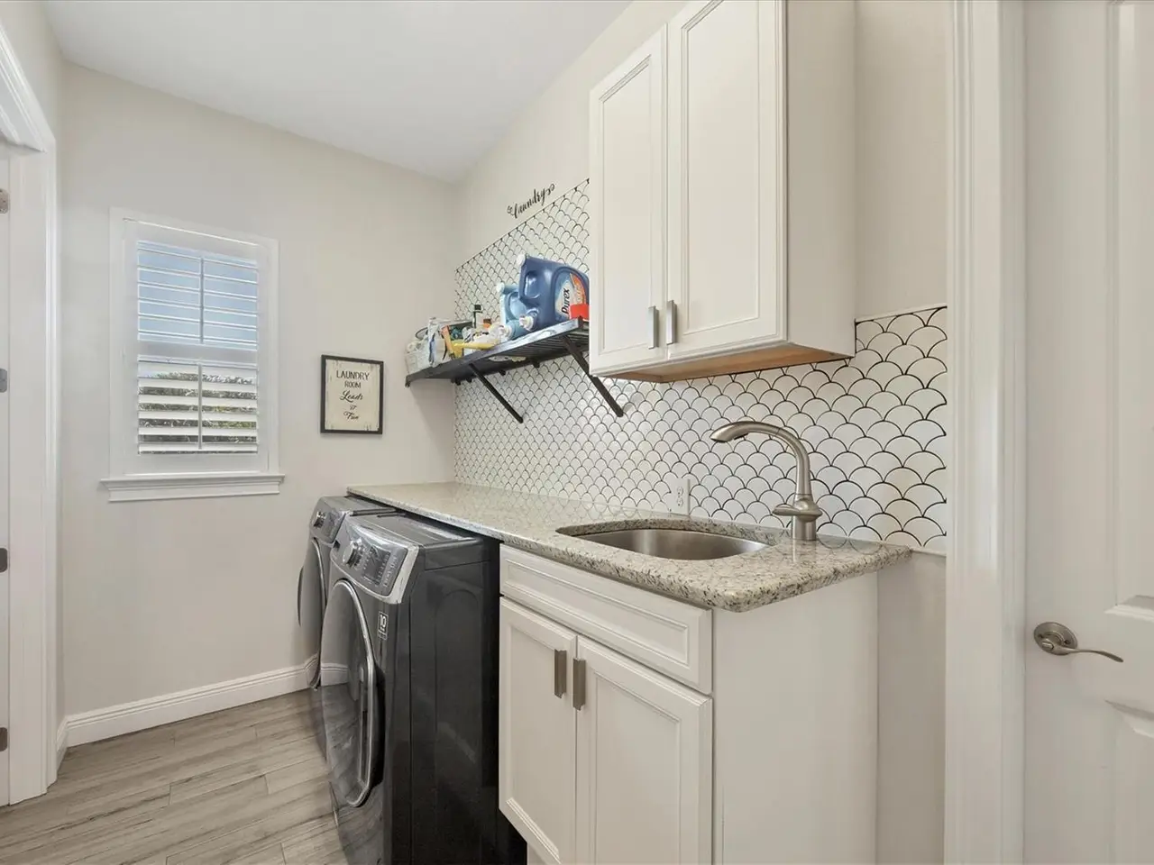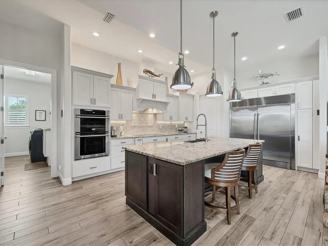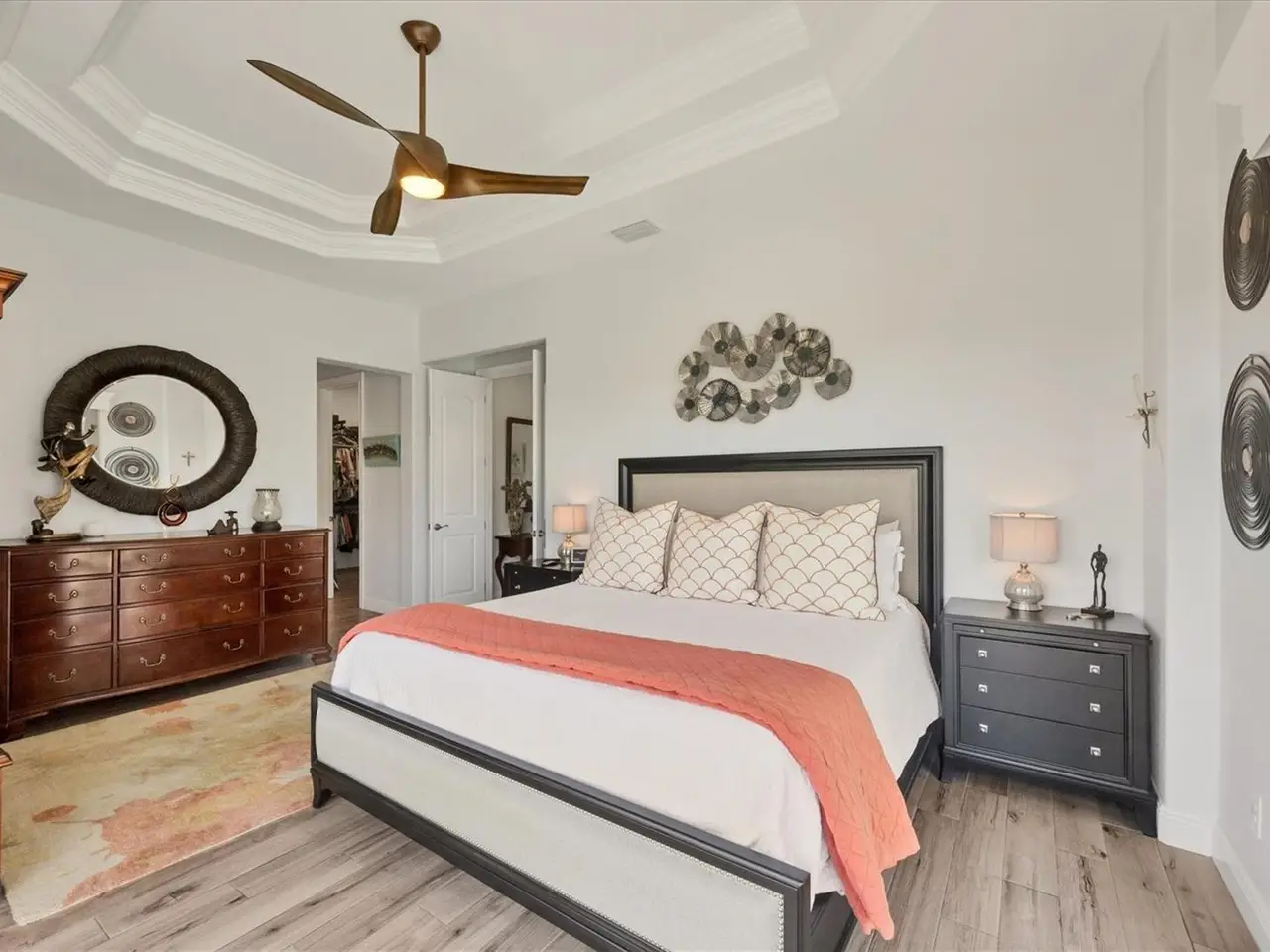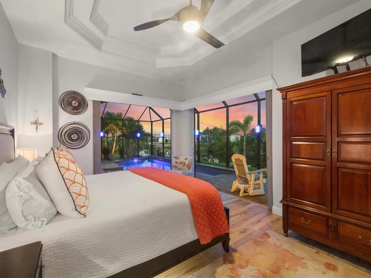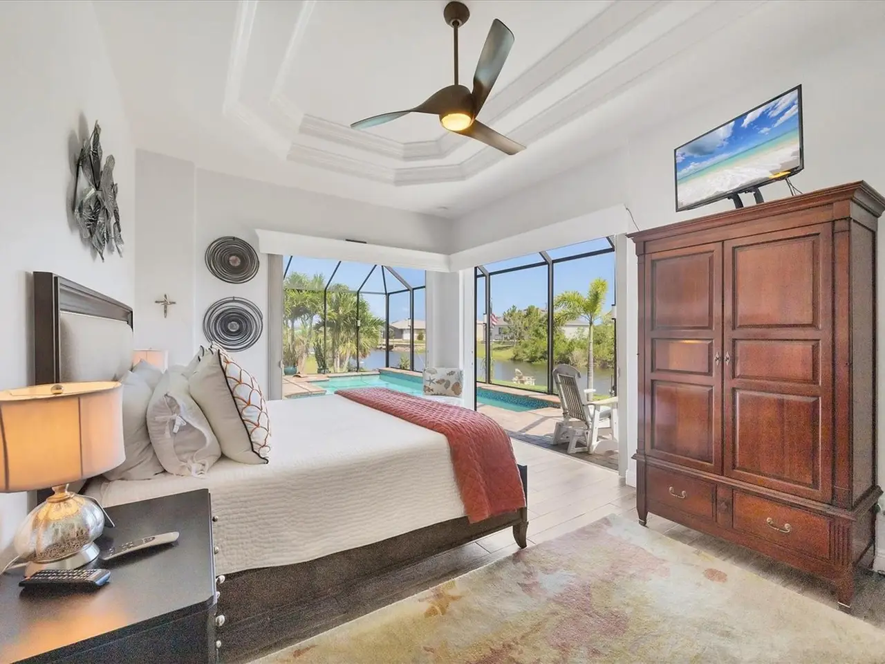 Tucked in a serene Florida waterfront community, this elegant 3-bedroom, 2-bath custom home is the perfect blend of luxury, comfort, and smart design. From the moment you arrive, it’s clear that every inch of this property has been thoughtfully crafted—from the paver driveway and travertine entrance to the gorgeous etched glass double doors that make a striking first impression. Inside, you’re greeted by rich wood-look tile flooring, custom tray ceilings, and a welcoming open layout that flows effortlessly from room to room. The living space is bright and open, with oversized sliders framing stunning water views that never get old. Whether you’re hosting a holiday party or simply relaxing by the electric fireplace with family, this home makes it easy to live beautifully. And the kitchen? It’s a chef’s dream. With a massive 9-foot quartz island, an Electrolux 5-burner induction cooktop, wall ovens, an oversized refrigerator/freezer, and high-end fixtures, cooking becomes a joy — not a chore. You’ll find yourself gathering here often, whether for morning coffee or sunset hors d'oeuvres. The primary suite is a peaceful retreat. Wake up to water views and step directly out to the lanai. The spa-style en-suite bathroom features an oversized walk-through shower, dual vanities, and a 13x8 walk-in closet so spacious it could be its own room. Across the home, two guest bedrooms ensure privacy and comfort for family or visitors. Step out onto the lanai and your private resort awaits. A heated saltwater pool with a soothing water feature invites you in for a dip. Entertain at the fully equipped summer kitchen with a Webber Summit grill and expansive bar space—perfect for laid-back evenings with friends. New pool screens installed in 2023 keep everything fresh and beautiful. And when a storm rolls in? Just press a button—automatic hurricane shutters protect everything, no need to move a single chair. As the sun sets, stroll down the lighted captain’s walk to your private 16-foot composite dock, complete with water and electric hookups and a walk-around 10,000 lb. boat lift—making every boat day easy and effortless. This home is not just beautiful, it’s built for peace of mind. From impact-resistant glass and electric shutters to Icynene insulation, Nest smart home features, and a newly painted exterior (2023), it’s as smart and secure as it is stunning. There are too many extras to list—but one walk through will show you: this is more than a home, it’s a lifestyle. Schedule your private tour today and experience the very best in Florida luxury living.