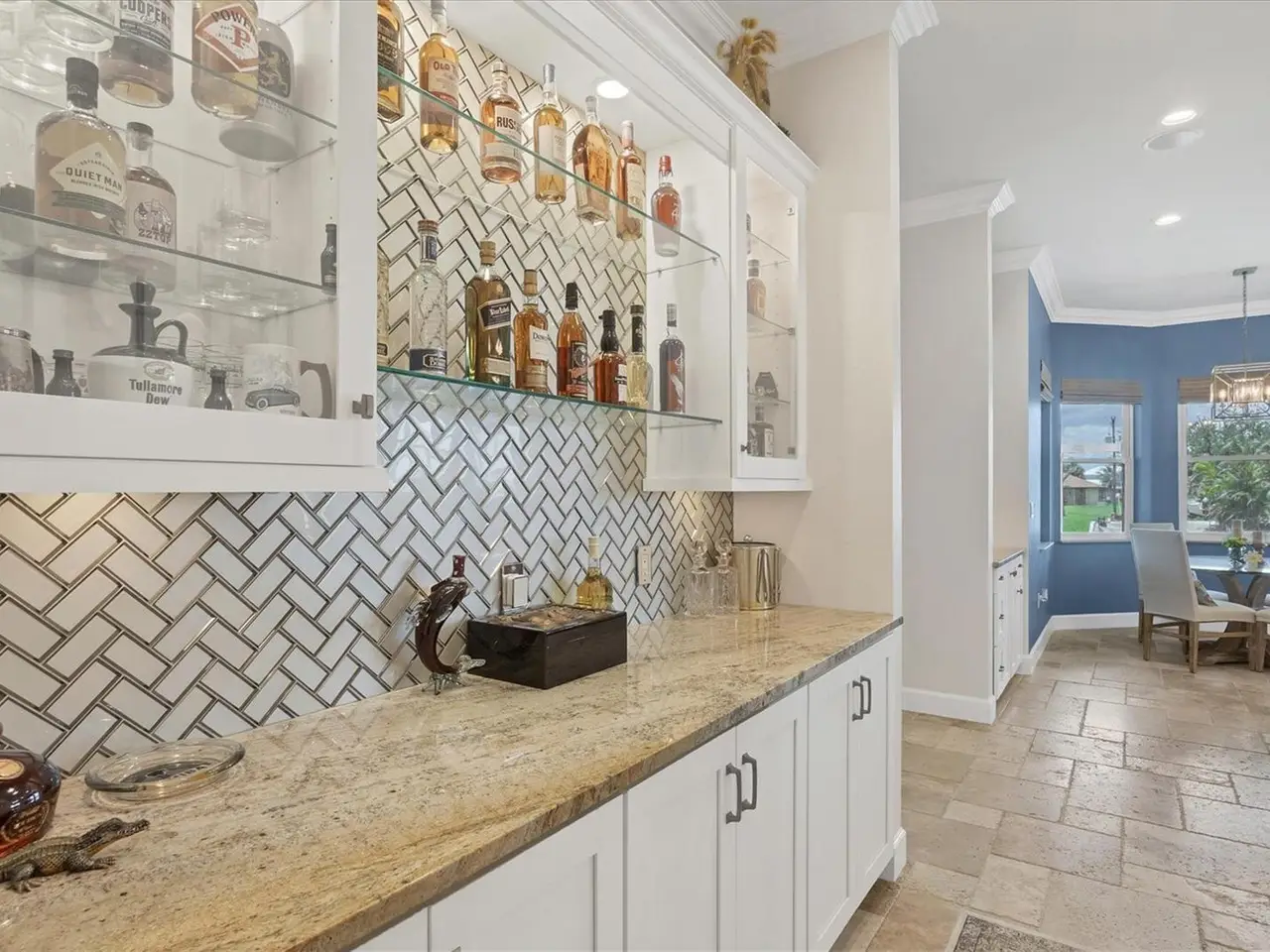 Travertine and engineered wood flooring throughout