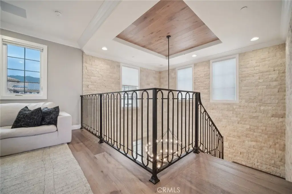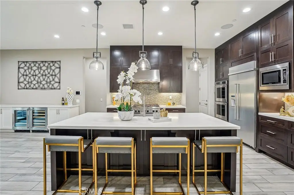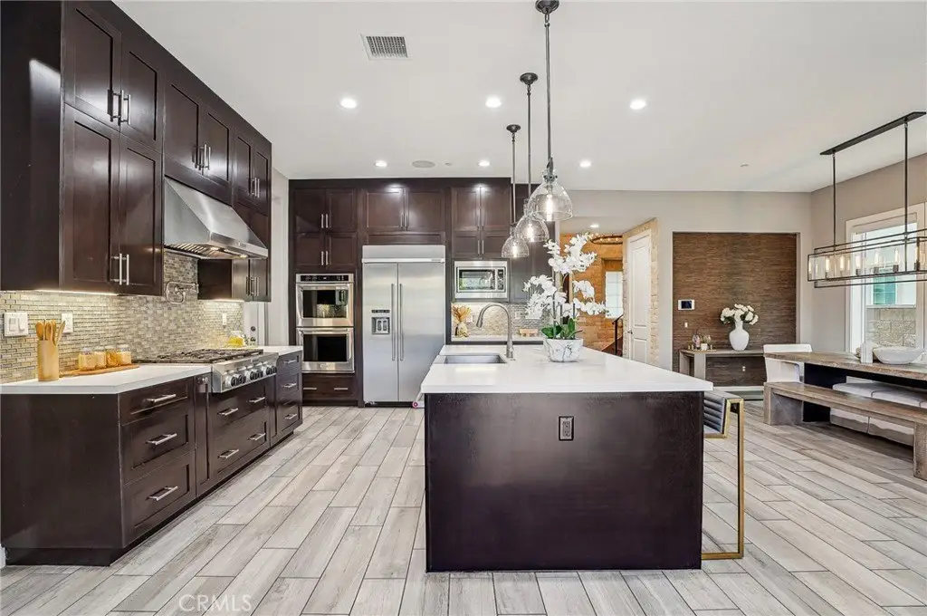 Tauchen Sie ein in zeitlose Eleganz mit diesem meisterhaft gestalteten Anwesen, in dem maßgefertigte Steinwände und eine warme Holzdecke im großen Eingangsbereich einen unvergesslichen ersten Eindruck hinterlassen. Dieses Haus wurde entworfen, um Luxus und Komfort nahtlos zu verbinden und verfügt über 4 geräumige Schlafzimmer, 4 Badezimmer und ein vielseitig nutzbares Loft im Obergeschoss – jeder Raum ist auf moderne Eleganz ausgelegt. Ein beeindruckendes Foyer mit hohen Decken von 3 Metern im Erdgeschoss und 2,7 Metern im Obergeschoss umrahmt eine geschwungene Treppe mit Designergeländern und lädt Sie in den großzügigen, offenen Grundriss ein. Das Herzstück des Hauses ist die Gourmetküche, die mit Quarz-Arbeitsplatten, einem eingebauten Kühlschrank, Soft-Close-Schränken, einer begehbaren Speisekammer und einer übergroßen Kochinsel beeindruckt – perfekt für alltägliche Zusammenkünfte oder große Unterhaltung. Der große Raum lässt sich mühelos durch 4,5 Meter lange Schiebetüren in eine Außenlounge erweitern und schafft so ein echtes Wohnerlebnis zwischen Innen- und Außenbereich. Ein gemütlicher Kamin sorgt für wohlige Wärme, während automatische Jalousien Komfort bieten. Die zweite Etage im Obergeschoss besticht durch edle Holzböden und ein stilvolles Loft mit individueller Tapete. Die Hauptsuite ist ein privater Rückzugsort mit ruhigem Balkon und atemberaubendem Bergblick, einem individuell gestalteten begehbaren Kleiderschrank und einem Spa-ähnlichen Bad mit Doppelwaschbecken, Badewanne, extragroßer Dusche und integriertem Surround-Sound. Diese Residenz bietet zahlreiche durchdachte Modernisierungen: polierte Betonoberflächen im Vorgarten, Hinterhof und in der Garage, Sicherheitsfolien an Glastüren, eine Wasserenthärtungsanlage für das ganze Haus, Tesla Powerwalls für energieeffiziente Energieeinsparung, ein modernes Luftwäschersystem für gereinigte Raumluft und sorgfältig modernisierte Schränke. Die Residenz befindet sich in der renommierten Wohnanlage Avila und bietet den Bewohnern exklusiven Zugang zu einem Pool im Resort-Stil, einem Spa, Cabanas und einem privaten Bankettsaal. Umgeben von erstklassigen Schulen, malerischen Wanderwegen, Parks und erstklassigen Einkaufsmöglichkeiten in The Vineyards at Porter Ranch bietet dieses Haus einen Lebensstil voller Komfort, Sicherheit und unvergleichlichem Luxus.