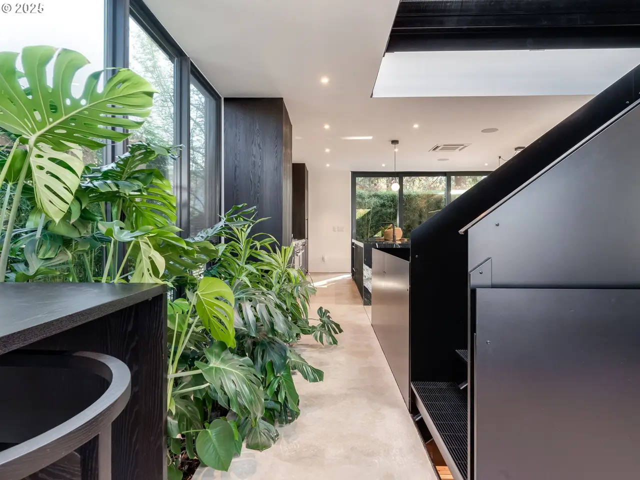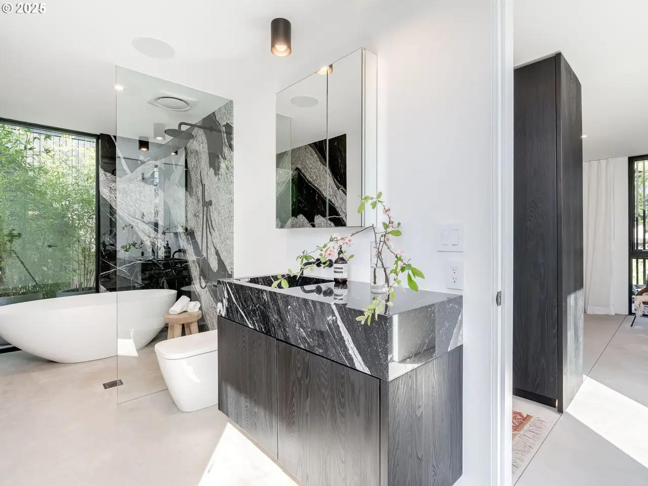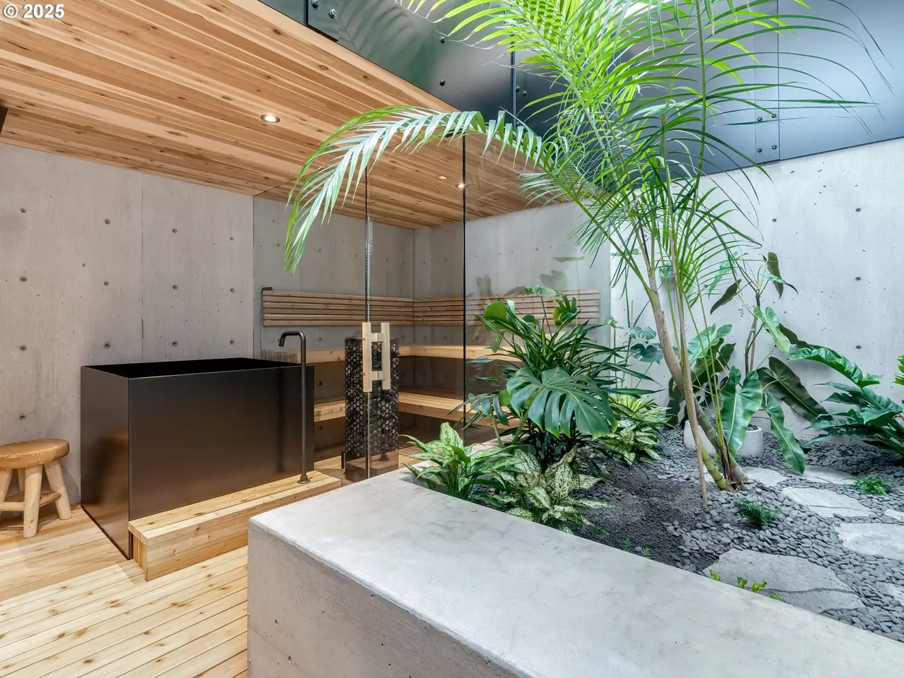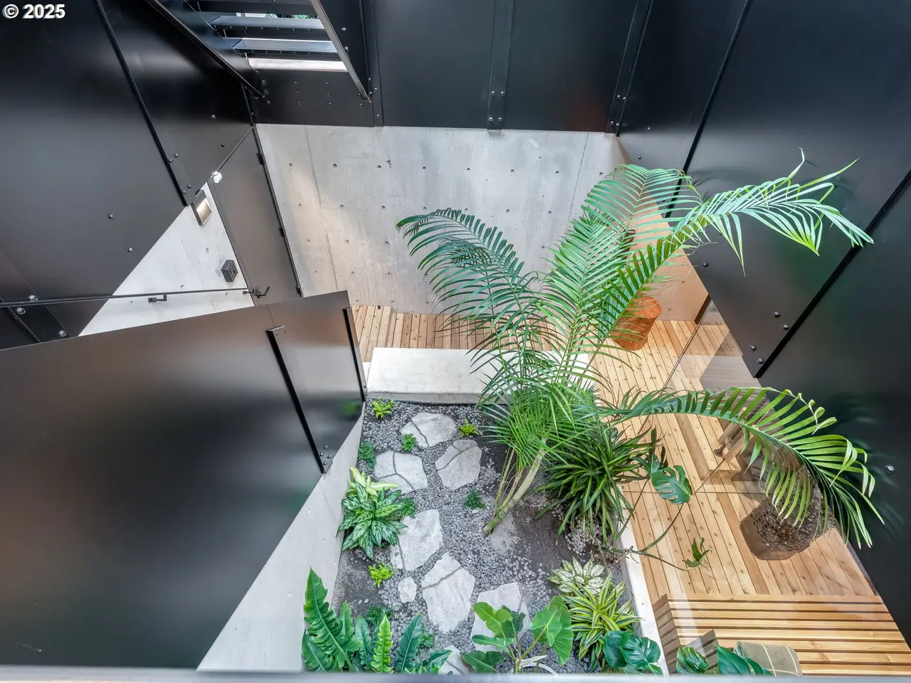 The Atrium House is a rare architectural gem in the heart of the Richmond neighborhood, just blocks off trendy Division Street. This infill project by Capsule Development brings custom-quality design to the Eastside--where creativity, craftsmanship, and nature meet. This modern masterpiece features soaring ceilings, heated concrete floors, and a stunning three-story atrium. Anchoring the living space is a steel staircase, fabricated locally in Portland, spanning all three levels. The lower level boasts a cedar sauna paired with a custom steel cold plunge and shower, creating a private wellness retreat. Lush, curated greenery surrounds the space, enhancing the sense of calm and relaxation. On the main floor, the chef's kitchen is equipped with high-end, built-in appliances from Bertazzoni and Fisher & Paykel. Throughout the home, solid oak custom cabinetry offers enduring beauty and a refined, timeless aesthetic. Luxury materials like Maori Brazilian granite slabs elevate the kitchen and baths. Just off the dining room, sliding doors open to the back patio for seamless entertaining. In the living room, a RAIS rotating wood stove serves as both a cozy heat source and a striking sculptural centerpiece. Upstairs, you'll find all three bedrooms, a dedicated laundry area, and a guest bath. Each bedroom features its own balcony--perfect for enjoying fresh morning air or a relaxing evening breeze. Floor-to-ceiling windows flood the space with natural light, enhancing the open, airy feel throughout. Out front, rolling shutters add a dramatic architectural touch while offering both privacy and adjustable light control. A truly one-of-a-kind property that celebrates thoughtful design and modern living in one of Portland's most sought-after neighborhoods. [Home Energy Score = 8.]