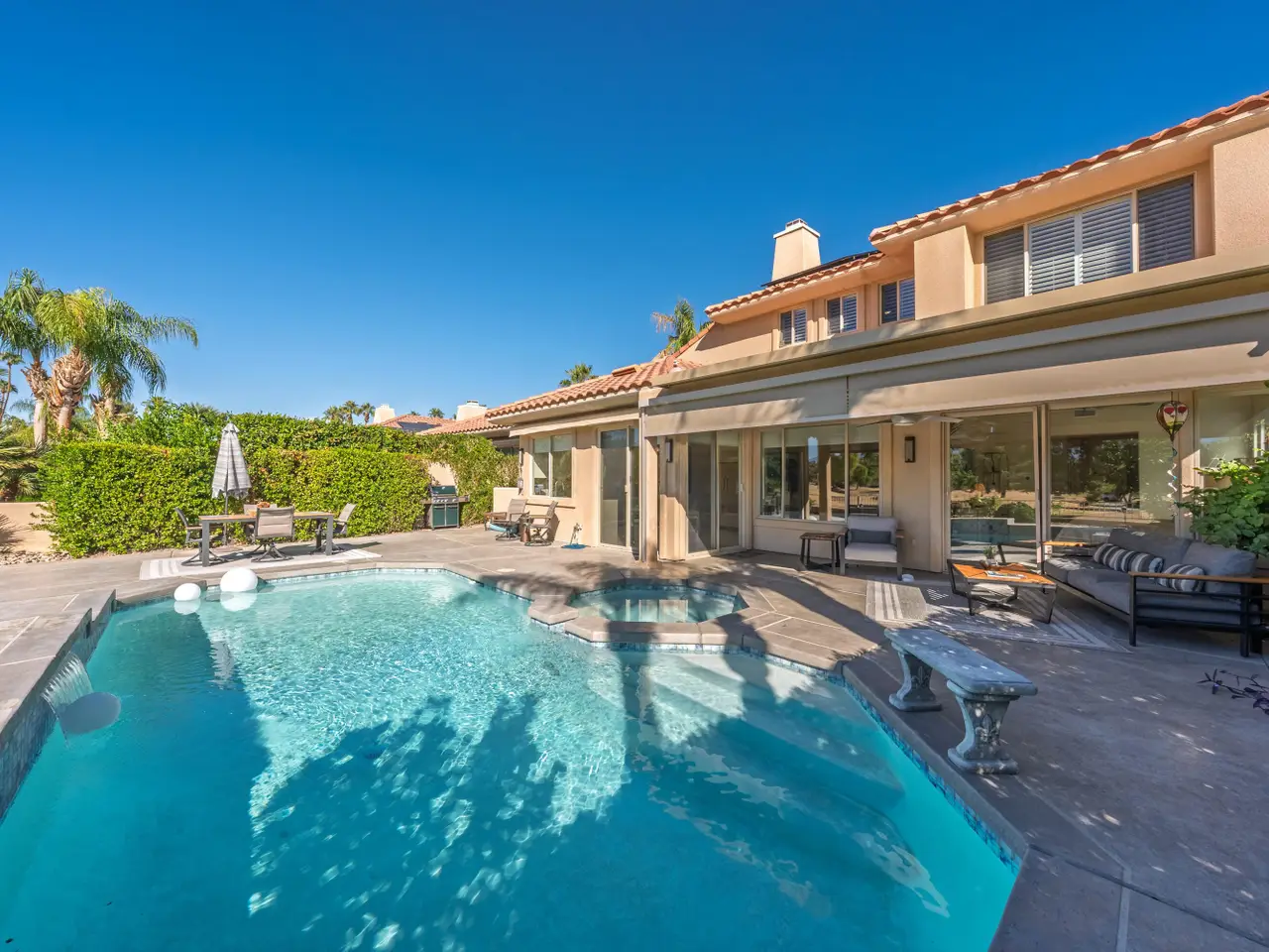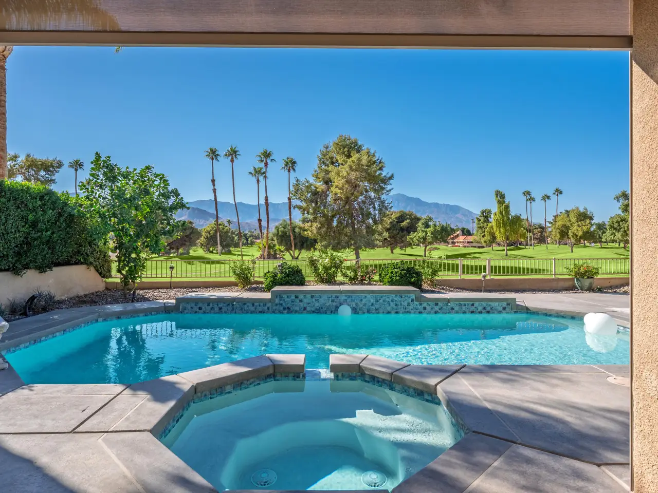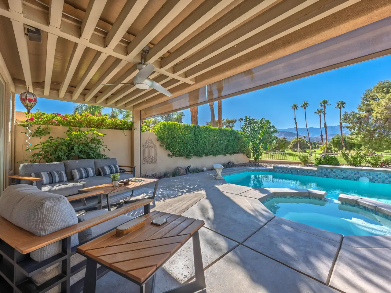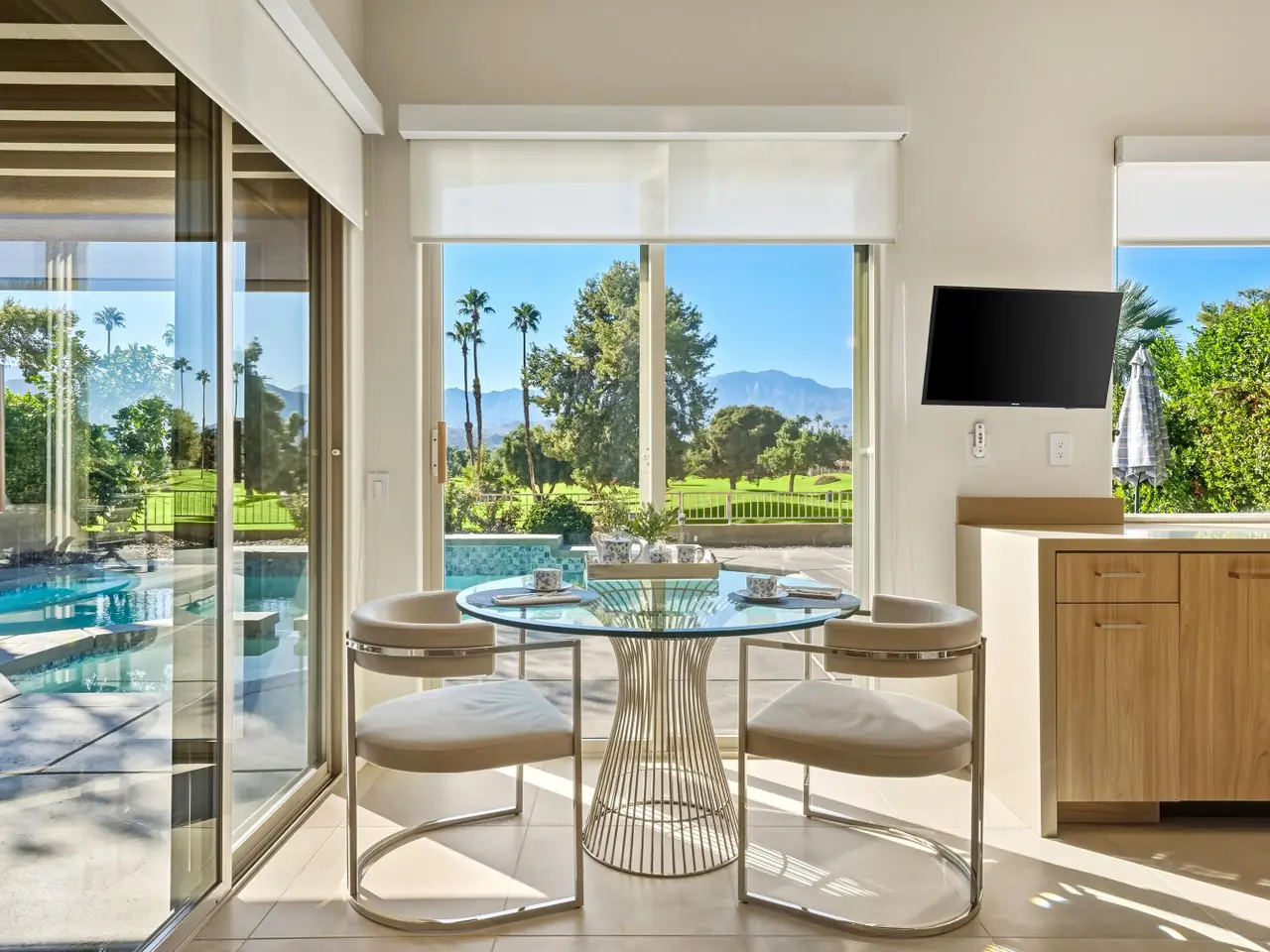 Experience modern luxury and sophisticated design in this fully renovated home, masterfully reimagined by acclaimed designer Steven Cheroske. Perched in an elevated location with stunning views of the San Jacinto Mountains and a beautiful view that overlooks 50 acre green space maintained in a park like condition, this home offers a rare blend of privacy, style, and natural beauty. Featuring three spacious ensuites plus a powder room, the layout is ideal for both comfortable living and upscale entertaining.Inside, you'll find sleek two-foot tile flooring throughout the first level and high-grade new carpeting upstairs and on the staircase. The entire home has been refreshed with designer-grade wallpaper, custom paint, and high-end finishes. The kitchen is a showstopper with modern cabinetry, quartz countertops, a large island with a built-in wine fridge, new appliances, a new sink, and a remote-controlled retractable canopy over the window. Bathrooms have been completely updated with quartz countertops, floating cabinets, custom mirrors, upgraded tile showers, and high-end fixtures. The primary suite features a water closet outlet prepped for a bidet and rebuilt closets with custom shelving and cabinetry.Additional designer touches include custom lighting, new ceiling fans, sleek glass-paneled doors throughout, a dramatic glass-and-metal stair railing, a custom metal wall sculpture in the entry, and a custom-colored glass accent wall flanking the open fireplace. The home also boasts a new built-in TV cabinet, retractable phantom screen doors, and upgraded window coverings in the kitchen, family room, and primary bedroom.Step outside to a beautifully redone cement patio with a new roof cover, a remote-controlled drop-down sunshade, and views that capture the essence of desert living. Mechanical upgrades include a brand-new AC unit (2024), a new pool pump (2025), repaired and serviced AC ductwork, new lighting and switches throughout, a new washer and dryer, and a fully upgraded garage with epoxy floors and custom cabinetry.This is not just a renovation it is a top-to-bottom transformation into a refined desert retreat. Whether you're seeking a luxurious full-time residence, a weekend getaway, or an income-generating vacation home, this designer masterpiece delivers on every level. Come see why We LOVE This Home!!!!