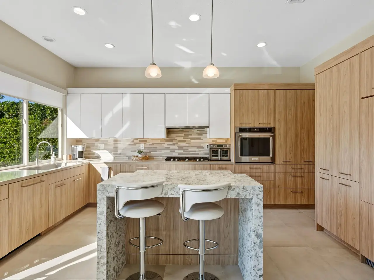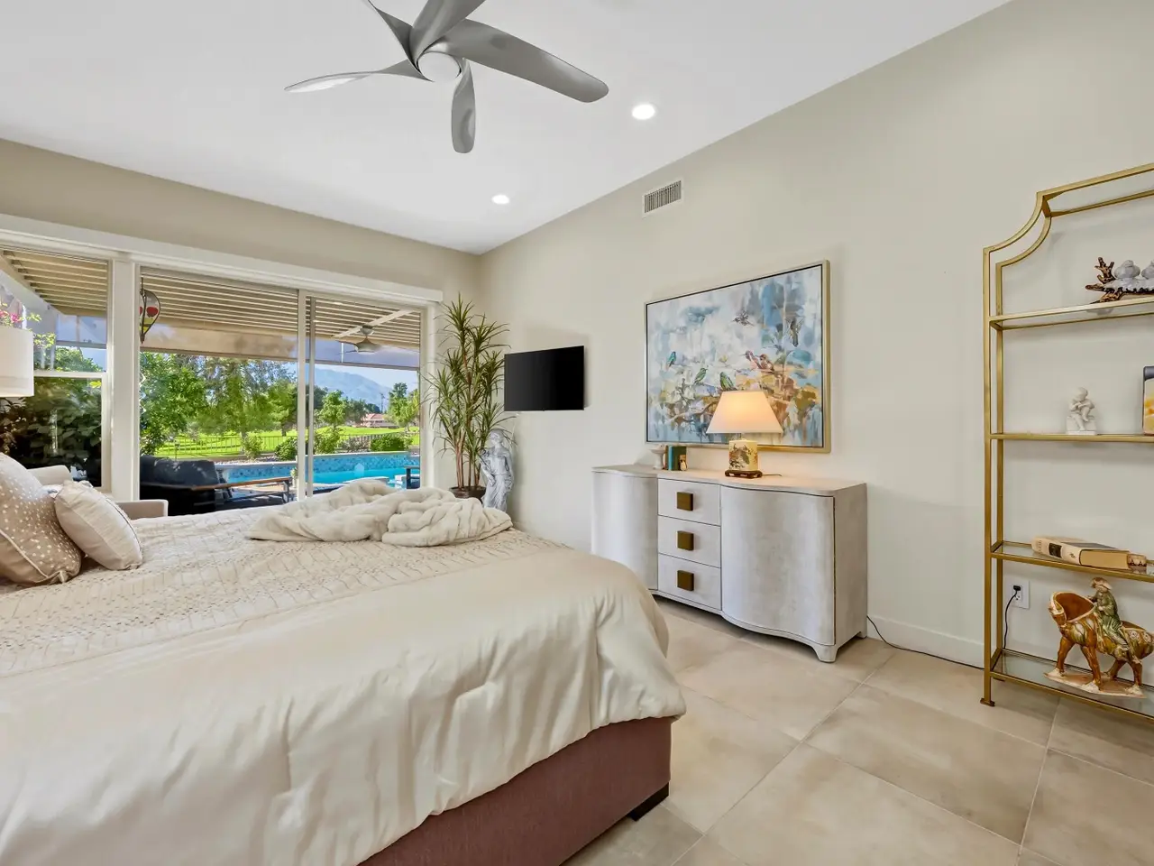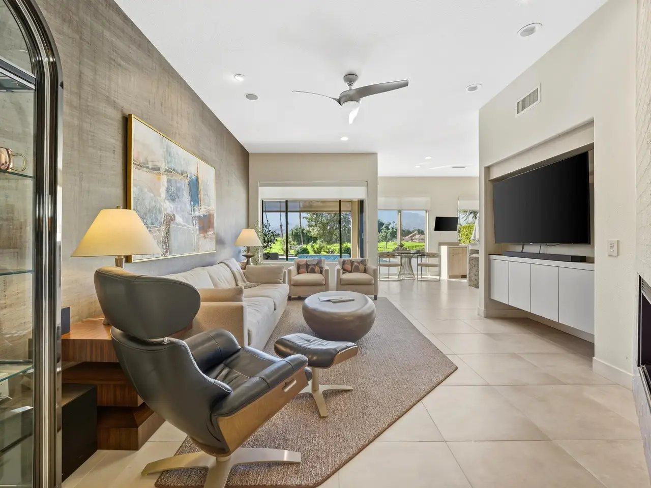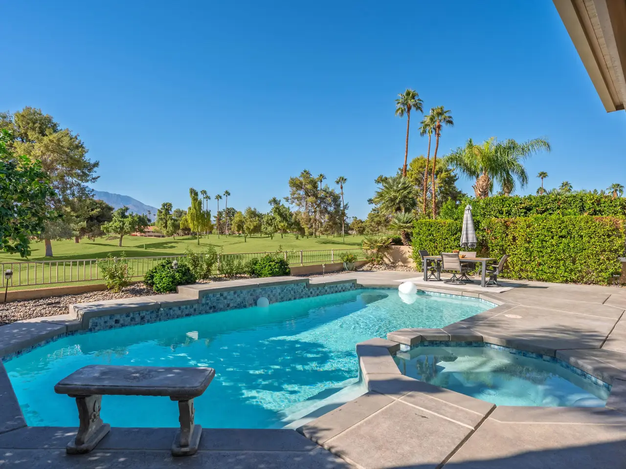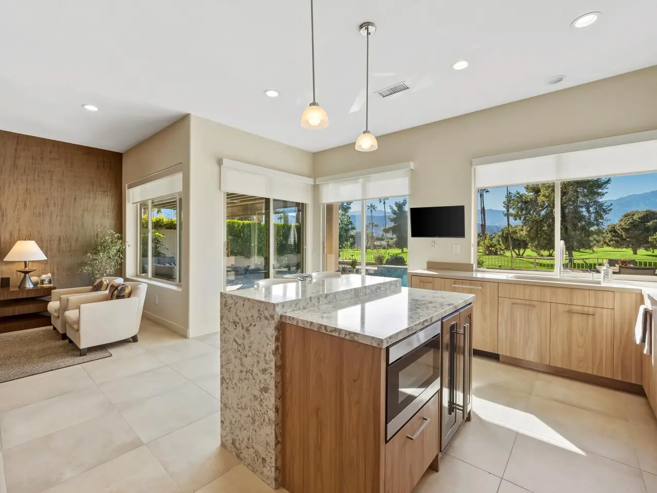 Experience modern luxury and sophisticated design in this fully renovated home, masterfully reimagined by acclaimed designer Steven Cheroske. Perched in an elevated location with stunning views of the San Jacinto Mountains and a beautiful view that overlooks 50 acre green space maintained in a park like condition, this home offers a rare blend of privacy, style, and natural beauty. Featuring three spacious ensuites plus a powder room, the layout is ideal for both comfortable living and upscale entertaining.Inside, you'll find sleek two-foot tile flooring throughout the first level and high-grade new carpeting upstairs and on the staircase. The entire home has been refreshed with designer-grade wallpaper, custom paint, and high-end finishes. The kitchen is a showstopper with modern cabinetry, quartz countertops, a large island with a built-in wine fridge, new appliances, a new sink, and a remote-controlled retractable canopy over the window. Bathrooms have been completely updated with quartz countertops, floating cabinets, custom mirrors, upgraded tile showers, and high-end fixtures. The primary suite features a water closet outlet prepped for a bidet and rebuilt closets with custom shelving and cabinetry.Additional designer touches include custom lighting, new ceiling fans, sleek glass-paneled doors throughout, a dramatic glass-and-metal stair railing, a custom metal wall sculpture in the entry, and a custom-colored glass accent wall flanking the open fireplace. The home also boasts a new built-in TV cabinet, retractable phantom screen doors, and upgraded window coverings in the kitchen, family room, and primary bedroom.Step outside to a beautifully redone cement patio with a new roof cover, a remote-controlled drop-down sunshade, and views that capture the essence of desert living. Mechanical upgrades include a brand-new AC unit (2024), a new pool pump (2025), repaired and serviced AC ductwork, new lighting and switches throughout, a new washer and dryer, and a fully upgraded garage with epoxy floors and custom cabinetry.This is not just a renovation it is a top-to-bottom transformation into a refined desert retreat. Whether you're seeking a luxurious full-time residence, a weekend getaway, or an income-generating vacation home, this designer masterpiece delivers on every level. Come see why We LOVE This Home!!!!