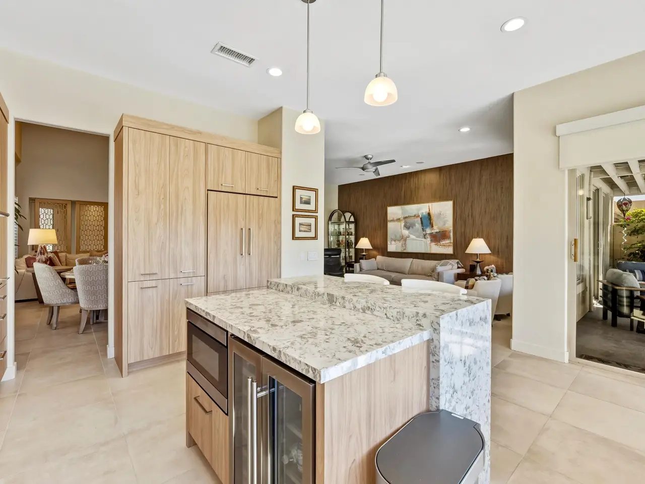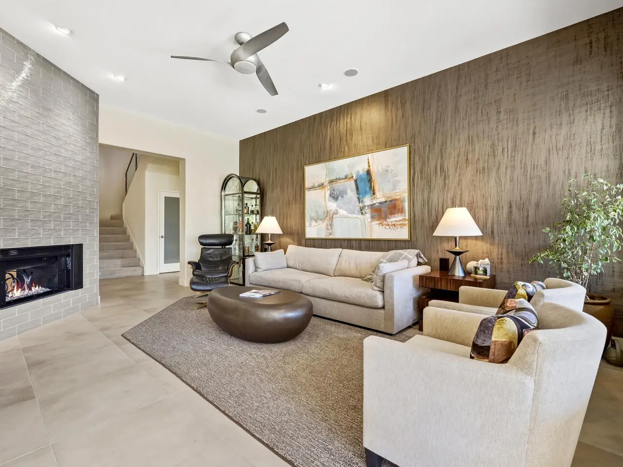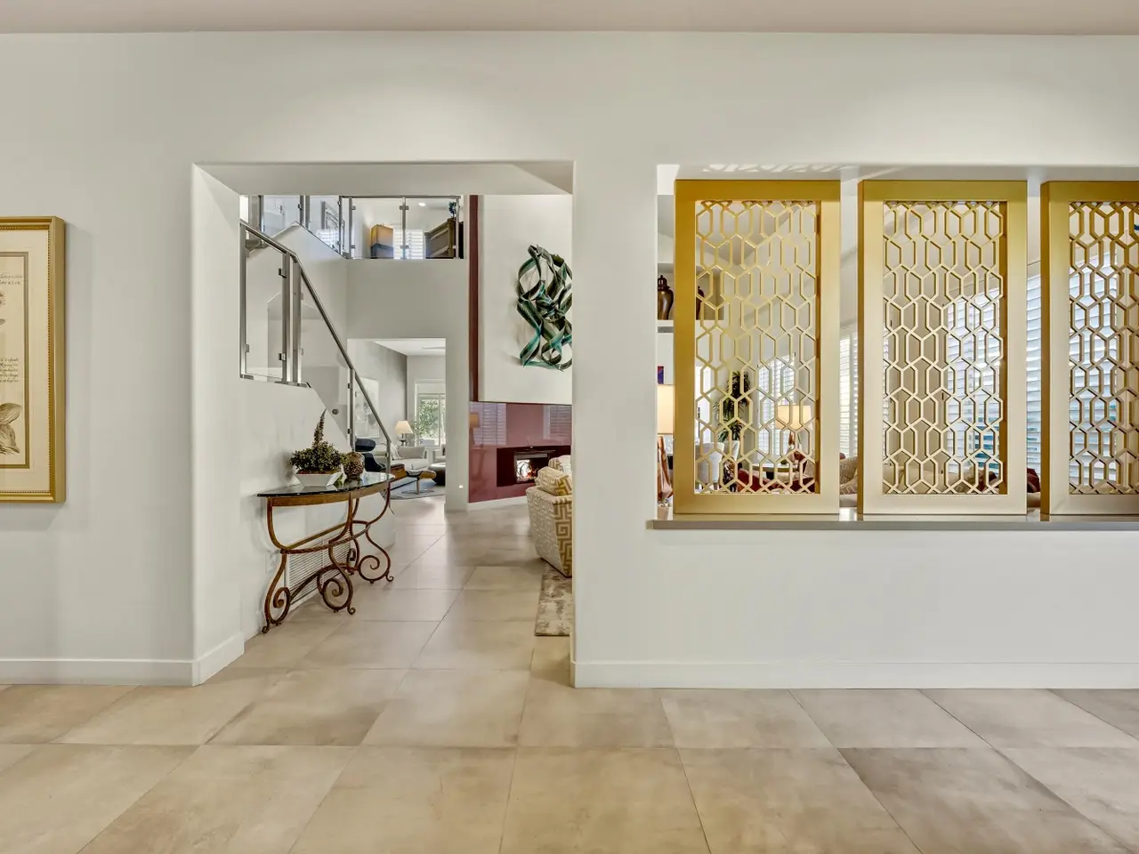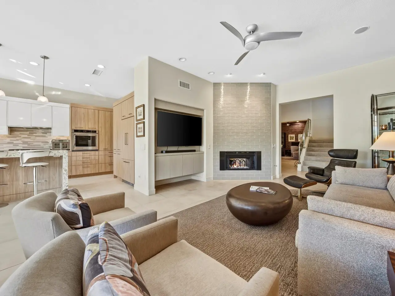 Experience modern luxury and sophisticated design in this fully renovated home, masterfully reimagined by acclaimed designer Steven Cheroske. Perched in an elevated location with stunning views of the San Jacinto Mountains and a beautiful view that overlooks 50 acre green space maintained in a park like condition, this home offers a rare blend of privacy, style, and natural beauty. Featuring three spacious ensuites plus a powder room, the layout is ideal for both comfortable living and upscale entertaining.Inside, you'll find sleek two-foot tile flooring throughout the first level and high-grade new carpeting upstairs and on the staircase. The entire home has been refreshed with designer-grade wallpaper, custom paint, and high-end finishes. The kitchen is a showstopper with modern cabinetry, quartz countertops, a large island with a built-in wine fridge, new appliances, a new sink, and a remote-controlled retractable canopy over the window. Bathrooms have been completely updated with quartz countertops, floating cabinets, custom mirrors, upgraded tile showers, and high-end fixtures. The primary suite features a water closet outlet prepped for a bidet and rebuilt closets with custom shelving and cabinetry.Additional designer touches include custom lighting, new ceiling fans, sleek glass-paneled doors throughout, a dramatic glass-and-metal stair railing, a custom metal wall sculpture in the entry, and a custom-colored glass accent wall flanking the open fireplace. The home also boasts a new built-in TV cabinet, retractable phantom screen doors, and upgraded window coverings in the kitchen, family room, and primary bedroom.Step outside to a beautifully redone cement patio with a new roof cover, a remote-controlled drop-down sunshade, and views that capture the essence of desert living. Mechanical upgrades include a brand-new AC unit (2024), a new pool pump (2025), repaired and serviced AC ductwork, new lighting and switches throughout, a new washer and dryer, and a fully upgraded garage with epoxy floors and custom cabinetry.This is not just a renovation it is a top-to-bottom transformation into a refined desert retreat. Whether you're seeking a luxurious full-time residence, a weekend getaway, or an income-generating vacation home, this designer masterpiece delivers on every level. Come see why We LOVE This Home!!!!
