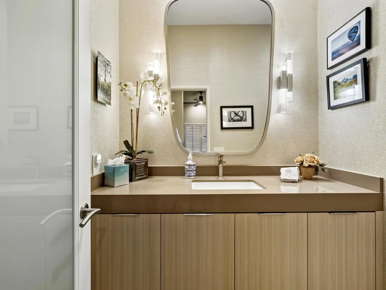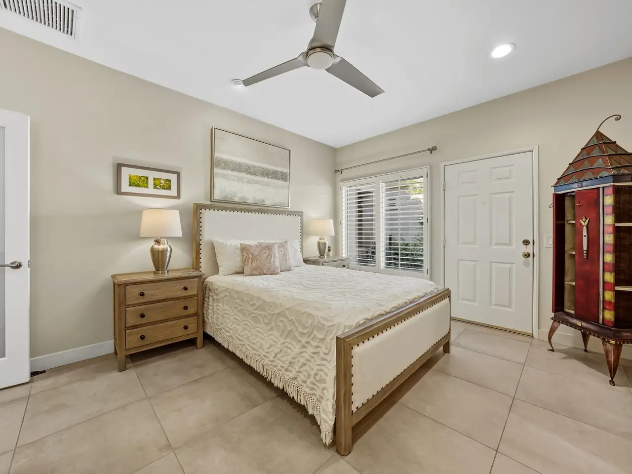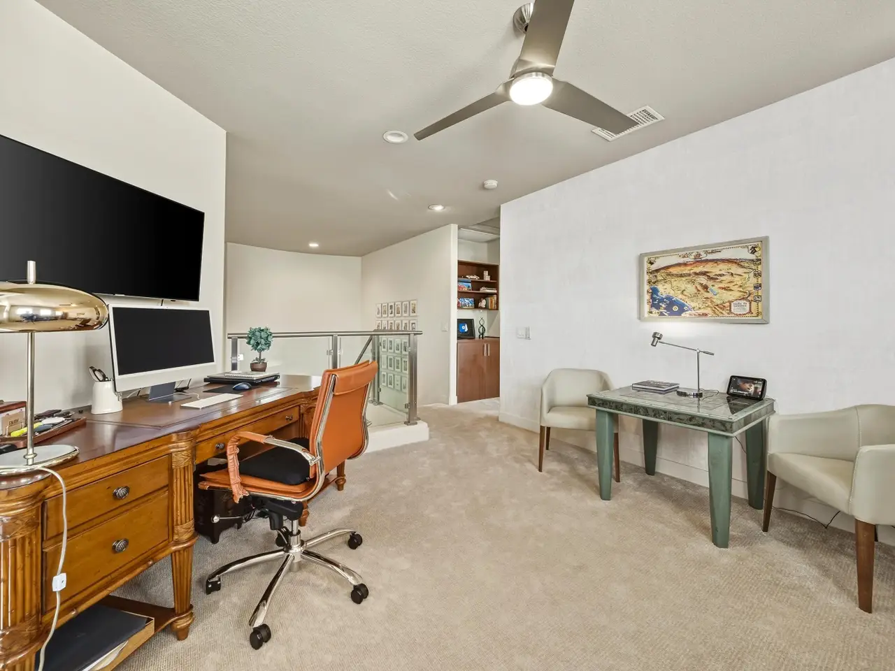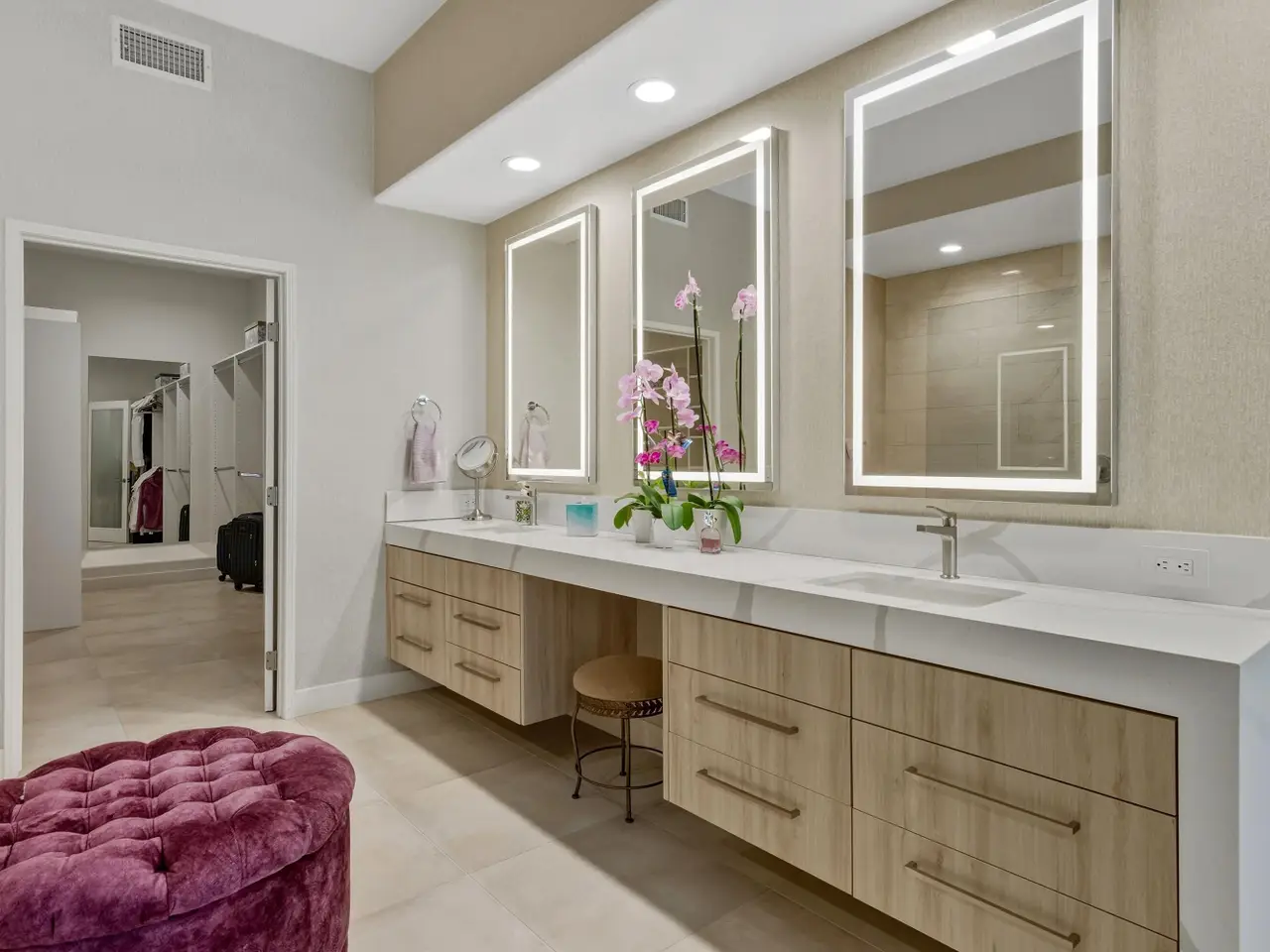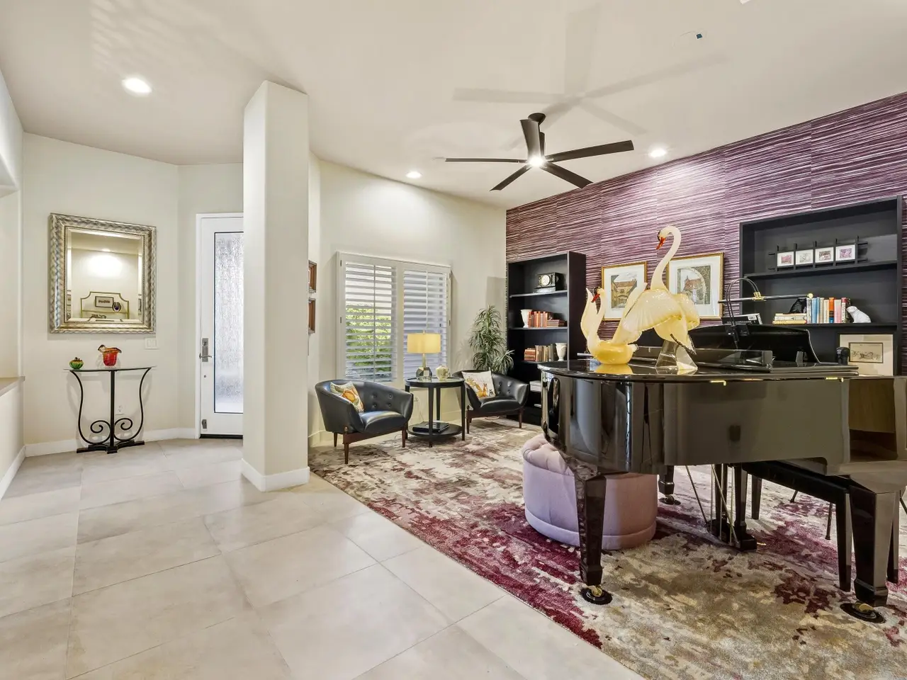 Experience modern luxury and sophisticated design in this fully renovated home, masterfully reimagined by acclaimed designer Steven Cheroske. Perched in an elevated location with stunning views of the San Jacinto Mountains and a beautiful view that overlooks 50 acre green space maintained in a park like condition, this home offers a rare blend of privacy, style, and natural beauty. Featuring three spacious ensuites plus a powder room, the layout is ideal for both comfortable living and upscale entertaining.Inside, you'll find sleek two-foot tile flooring throughout the first level and high-grade new carpeting upstairs and on the staircase. The entire home has been refreshed with designer-grade wallpaper, custom paint, and high-end finishes. The kitchen is a showstopper with modern cabinetry, quartz countertops, a large island with a built-in wine fridge, new appliances, a new sink, and a remote-controlled retractable canopy over the window. Bathrooms have been completely updated with quartz countertops, floating cabinets, custom mirrors, upgraded tile showers, and high-end fixtures. The primary suite features a water closet outlet prepped for a bidet and rebuilt closets with custom shelving and cabinetry.Additional designer touches include custom lighting, new ceiling fans, sleek glass-paneled doors throughout, a dramatic glass-and-metal stair railing, a custom metal wall sculpture in the entry, and a custom-colored glass accent wall flanking the open fireplace. The home also boasts a new built-in TV cabinet, retractable phantom screen doors, and upgraded window coverings in the kitchen, family room, and primary bedroom.Step outside to a beautifully redone cement patio with a new roof cover, a remote-controlled drop-down sunshade, and views that capture the essence of desert living. Mechanical upgrades include a brand-new AC unit (2024), a new pool pump (2025), repaired and serviced AC ductwork, new lighting and switches throughout, a new washer and dryer, and a fully upgraded garage with epoxy floors and custom cabinetry.This is not just a renovation it is a top-to-bottom transformation into a refined desert retreat. Whether you're seeking a luxurious full-time residence, a weekend getaway, or an income-generating vacation home, this designer masterpiece delivers on every level. Come see why We LOVE This Home!!!!