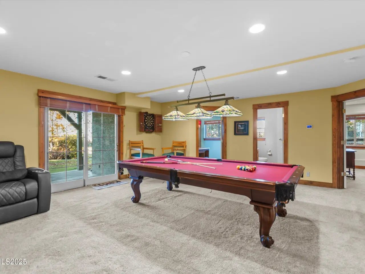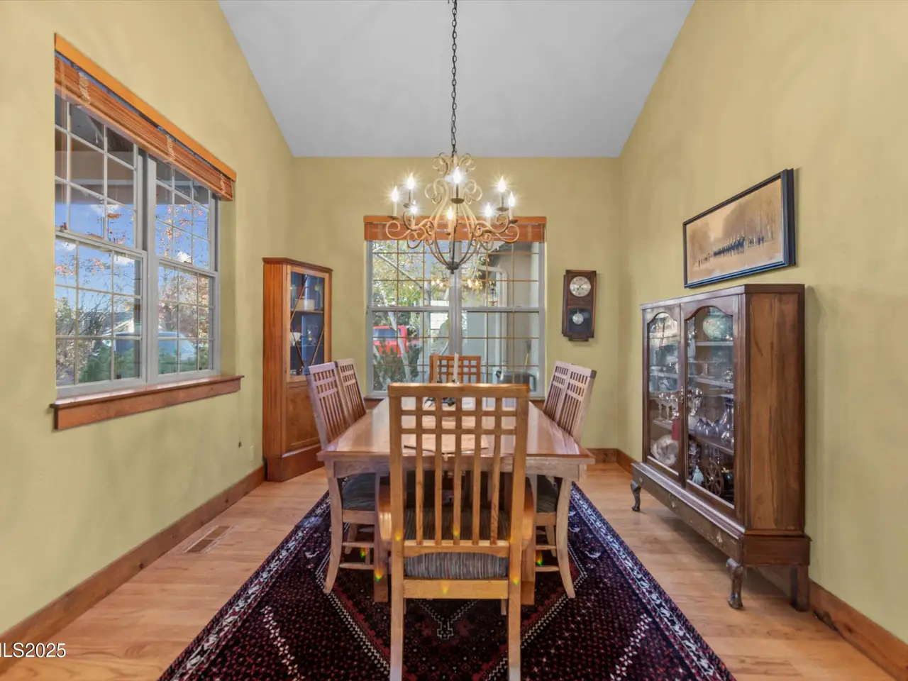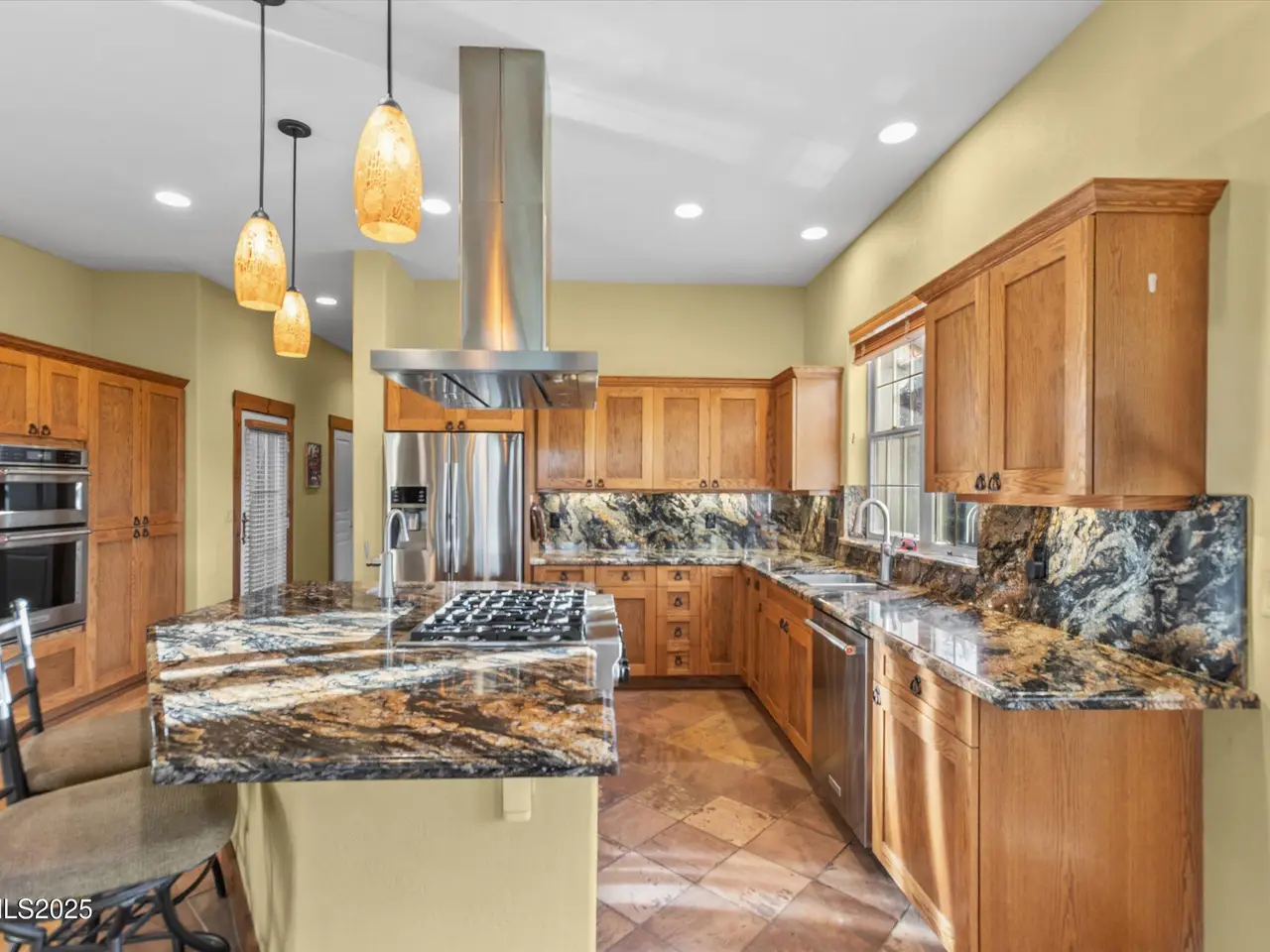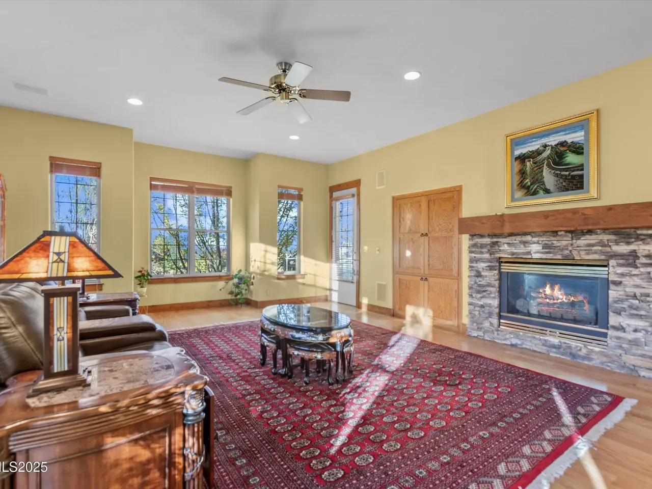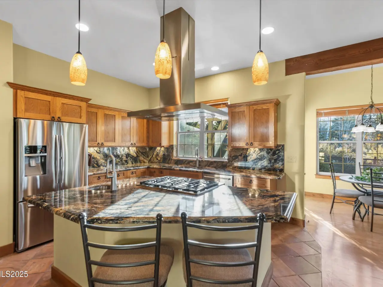 Private cul-de-sac living in Saddlehorn with wide views of Mt. Rose, the Sierra, and the Reno skyline. This custom home blends timeless architecture with a peaceful, elevated setting. Historic reclaimed wood beams from old railroad tunnels deliver distinctive Nevada character. Main-level living features formal living and dining rooms, a welcoming family room, and a well-appointed kitchen with custom cabinetry and excellent storage. The primary suite is also on this level for comfort and ease. Downstairs, two additional bedrooms and a large bonus/media room open to outdoor living areas surrounded by mature landscaping and natural scenery. Saddlehorn parkland borders the property on two sides, providing added privacy, improved sun exposure, and enhanced views. A rare 4-car garage offers outstanding space for vehicles and gear. Residents enjoy walking trails, parks, and community recreation close by, with Galena hiking and shopping minutes away. Mt. Rose Ski Area is just 11 miles up the road. A quiet, scenic location paired with respected custom design. Strong architecture. Everyday convenience. Ready for what's next.