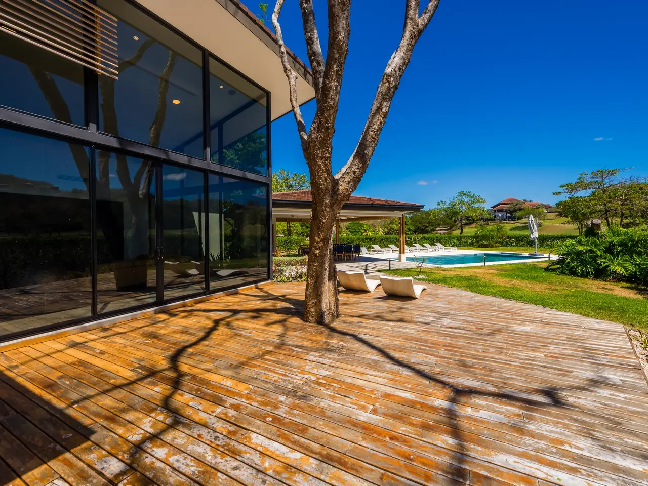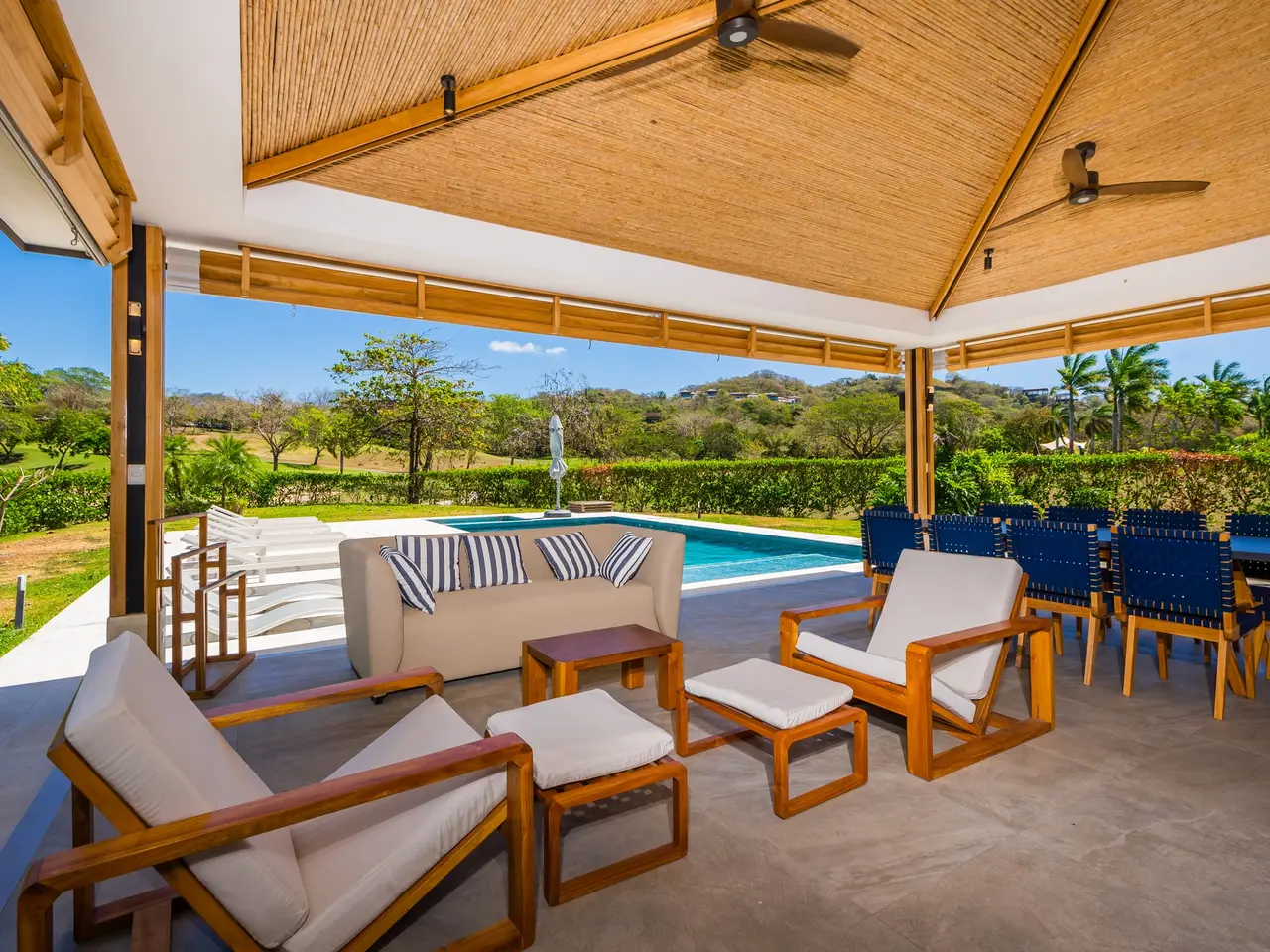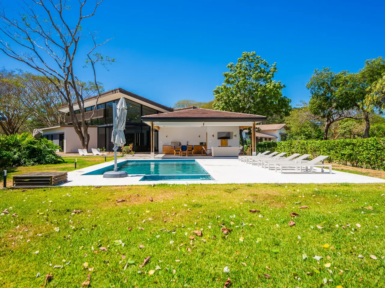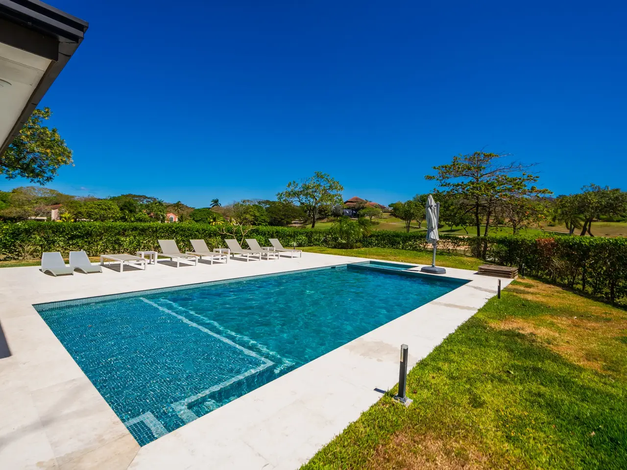 Located within the exclusive Llama del Bosque homes in Reserva Conchal, this single-story masterpiece epitomizes modern architectural elegance. Its strategic positioning alongside the enchanting golf course seamlessly integrates the residence with the vibrant natural surroundings, offering a privileged connection to Playa Conchal—one of the world's most renowned beaches. The interior unfolds to reveal four generously appointed bedrooms, including two luxurious master suites and two comfortable double bedrooms, all featuring private bathrooms and air conditioning. The open design of the social areas creates a harmonious, sunlit environment, blending the kitchen, living room, and dining area. High ceilings amplify the sense of spaciousness, offering breathtaking views of mountains, terraces, gardens, and the inviting pool. Beyond aesthetics, the residence is thoughtfully designed for convenience and luxury. Highlights include a covered terrace with a BBQ, TV, and outdoor furniture set, a swimming pool, jacuzzi, and well-maintained gardens with picturesque views. Practical features such as a laundry area, spacious pantry, storage room, covered garage for three cars, and parking for four vehicles enhance the overall functionality of the home. Situated on the pristine white sands of Playa Conchal, Reserva Conchal spans 2,300 acres and is a premier luxury gated community in Guanacaste, Costa Rica. Its A+ amenities cater to diverse interests, offering a PGA-level golf course, tennis courts, a modern fitness center, hiking and biking trails, and a Beach Club with multiple pools, paddleboards, kayaks, and bikes. Access to 13 bars, restaurants, and two spas at discounted rates, along with proximity to expat schools and the Liberia international airport, make Reserva Conchal a haven for families, retirees, and vacation rentals. Embark on the journey to tropical paradise and embrace the dream lifestyle that Reserva Conchal offers!