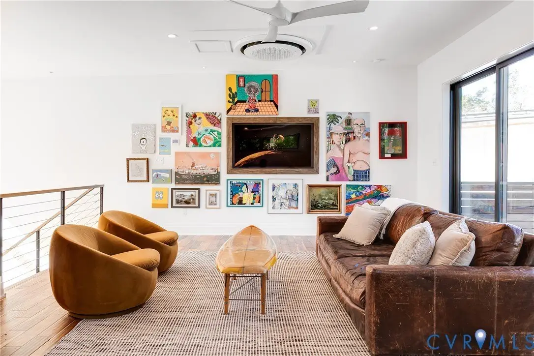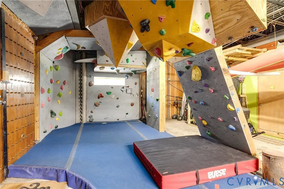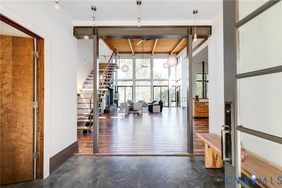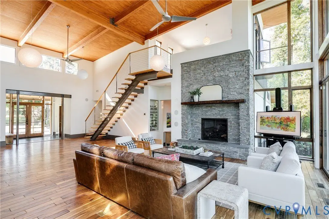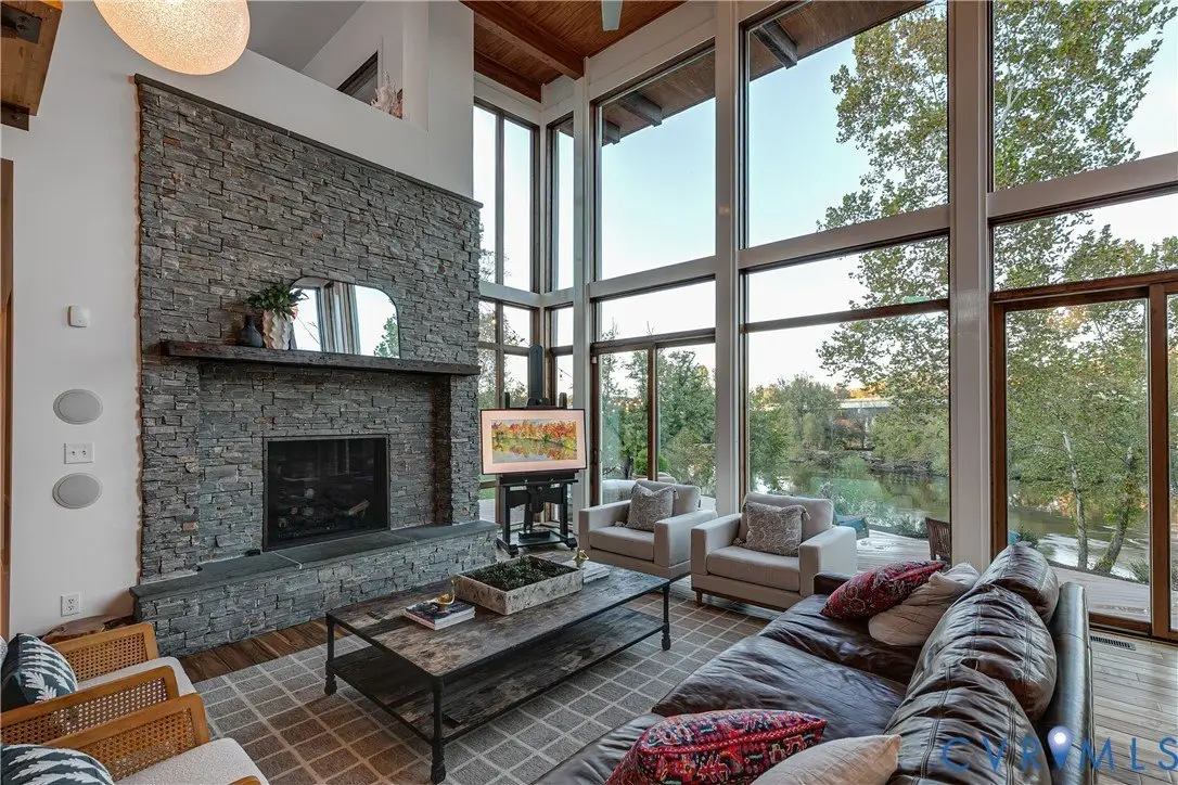 ""Extraordinary riverfront contemporary home with rare private access to the James River! This architectural gem blends dramatic design with comfortable living and stunning natural views. This home known as ""The Igloo House"""" was originally created by artist Demetrios Mavroudis and was masterfully reimagined with thoughtful additions and modern luxury while preserving its artful history. Walls of glass, vaulted ceilings with exposed beams, marble floors from the Federal Trade building, architectural details from the University of Richmond and open living spaces capture the light and the river from nearly every room. The chef's kitchen features SubZero and Wolf, quartz counters and an oversized island - perfect for entertaining. The spacious primary suite offers panoramic river views, spa bath with heated floors and exceptional custom cabinetry in the large walk-in closet. There is an additional en-suite bedroom/bath combo, 2 additional bedrooms with a hall bath to share, a 5th possible bedroom with a full bath and a large main floor laundry room. There are 2 additional versatile offices and studio spaces, which provide flexibility for modern living. The oversized former garage houses amazing storage, a huge workshop, an office and an incredible climbing wall gym with """"sprung"""" floor. This space could easily be repurposed to a parking garage again. Outdoor spaces include expansive decks and balconies, a koi pond, stone fire pit and direct access to the flatwater for kayaking and canoeing. Set on over 2 acres with landscaped gardens and spectacular sunsets over Bosher's Dam, this home is a one-of-a-kind Richmond landmark featured in RHome, Modern Home, and HGTV. Every stone, beam and piece of metal tells a story in this home. What began as a park ranger's home, then became an artist's studio and now stands as a deeply loved riverfront retreat for a family. It is now your turn to start your new lifestyle and write your next chapter in this exceptional and special place.""