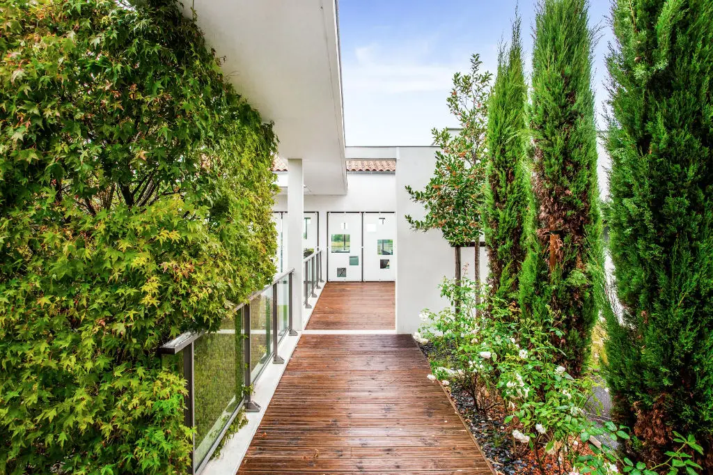 Diese 2013 erbaute Villa im modernistischen Stil zeugt von ausgeprägtem Geschmack für Design und Inszenierung. Hell, ergonomisch und elegant gelegen, befindet sie sich in idealer Lage in einem Wohngebiet vor den Toren von Royan. Vom über 2000 m² großen Hanggrundstück bietet sich ein Blick auf die Felder und das Dorf Mornac. Das Gebäude bietet auf 565 m² Wohnfläche vielfältige Möglichkeiten – ob als Familienhaus oder zur professionellen Nutzung. Der vom oberen Bereich zugängliche Eingangsbereich mit Ankleidezimmer und Gäste-WC überrascht mit einem spektakulären Blick auf den Weinkeller im Untergeschoss. Das großzügige, 92 m² große Wohnzimmer ist größtenteils verglast und profitiert somit von viel Tageslicht. Es ist mit grafischen Edelstahlpaneelen verkleidet und bemalt, wodurch verschiedene, die umgebende Natur öffnende Bilder entstehen. Der angrenzende Raum, der derzeit als Küche genutzt wird, ließe sich problemlos in eine komfortable Master-Suite verwandeln. Auf dieser Ebene befinden sich drei schöne, raffiniert eingerichtete Schlafzimmer mit jeweils einem Badezimmer und einer privaten Terrasse. Die untere Ebene mit Blick auf den hinteren Garten bietet verschiedene Wohnbereiche und einen Weinkeller, der Weinliebhaber dank seiner Ausstattung begeistern wird! Angrenzend an das Hauptgebäude, aber unabhängig, profitiert ein zweites Haus von einem schönen Wohnbereich mit offener Küche, drei Schlafzimmern und einem Badezimmer. Ideal für ein Gästehaus oder ein Miet-Cottage. Die Nebengebäude sind nicht zu übertreffen, mit einem großen Carport, der bei Bedarf geschlossen werden kann und mit seinem Werkstattbereich Platz für Autos, Motorräder und Fahrräder bietet. Das bebaubare Grundstück mit Swimmingpool bietet weiterhin großartige Aussichten! 3 Kilometer vom malerischen Dorf Mornac, 8 km vom Markt von Royan und 7 km von den Stränden entfernt, wird dieses Anwesen Liebhaber moderner Linien und ausgewählter Materialien begeistern. Vollständiger Fotobericht auf unserer Website „Espaces Atypiques La Rochelle – Royan“. ENERGIEKLASSE: D / KLIMAKLASSE: B. Geschätzter durchschnittlicher jährlicher Energieverbrauch für Standardnutzung, basierend auf den Energiepreisen für das Jahr 2021: ZWISCHEN 1.290 EUR UND 1.800 EURREF. EALR2103Zusätzliche Informationen* 9 Zimmer* 6 Schlafzimmer* 4 Duschräume* 1 Etage im Gebäude* Außenfläche: 2150 m²* Parken: 15 Parkplätze* Grundsteuer: 2 624 €Energieausweis Primärenergieverbrauch d: 208 kWh/m2.JahrHochleistungswohnungen*A*B*C*208kWh/m2.Jahr6*kg CO2/m2.JahrD*E*F*G Sehr schlechte Wohnleistung* Davon Treibhausgasemissionen b: 6 kg CO2/m2.JahrGeringe CO2-Emissionen*A*6kg CO2/m2.JahrB*C*D*E*F*G Sehr hohe CO2-Emissionen Geschätzter durchschnittlicher Betrag der jährlichen Energieausgaben für Standardnutzung, ermittelt aus den Energiepreisen für das Jahr 2021: zwischen 1290 € und 1800 €Agenturgebühren Die Gebühren verstehen sich inklusive Mehrwertsteuer und sind vom Verkäufer zu zahlen Mediator Mediation Franchise-Consommateurswww.mediation-franchise.com29 Boulevard de Courcelles 75008 Paris Informationen zu den Risiken, denen diese Immobilie ausgesetzt ist, finden Sie auf der Website Geohazards: www.georisques.gouv.fr