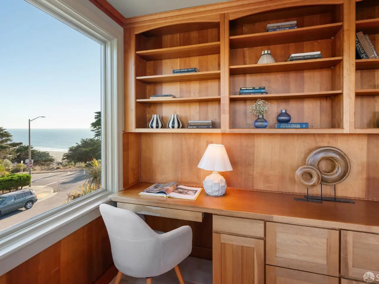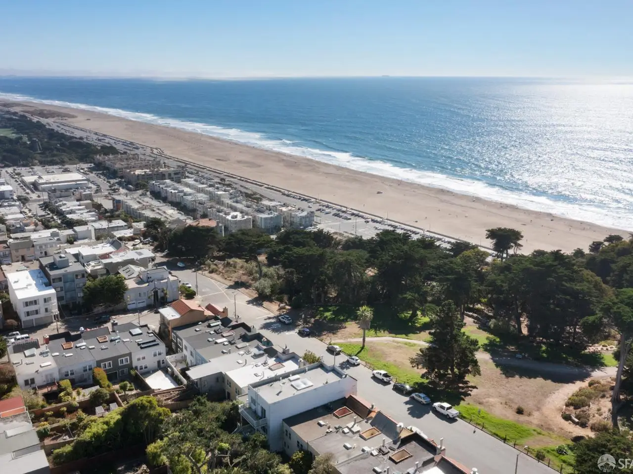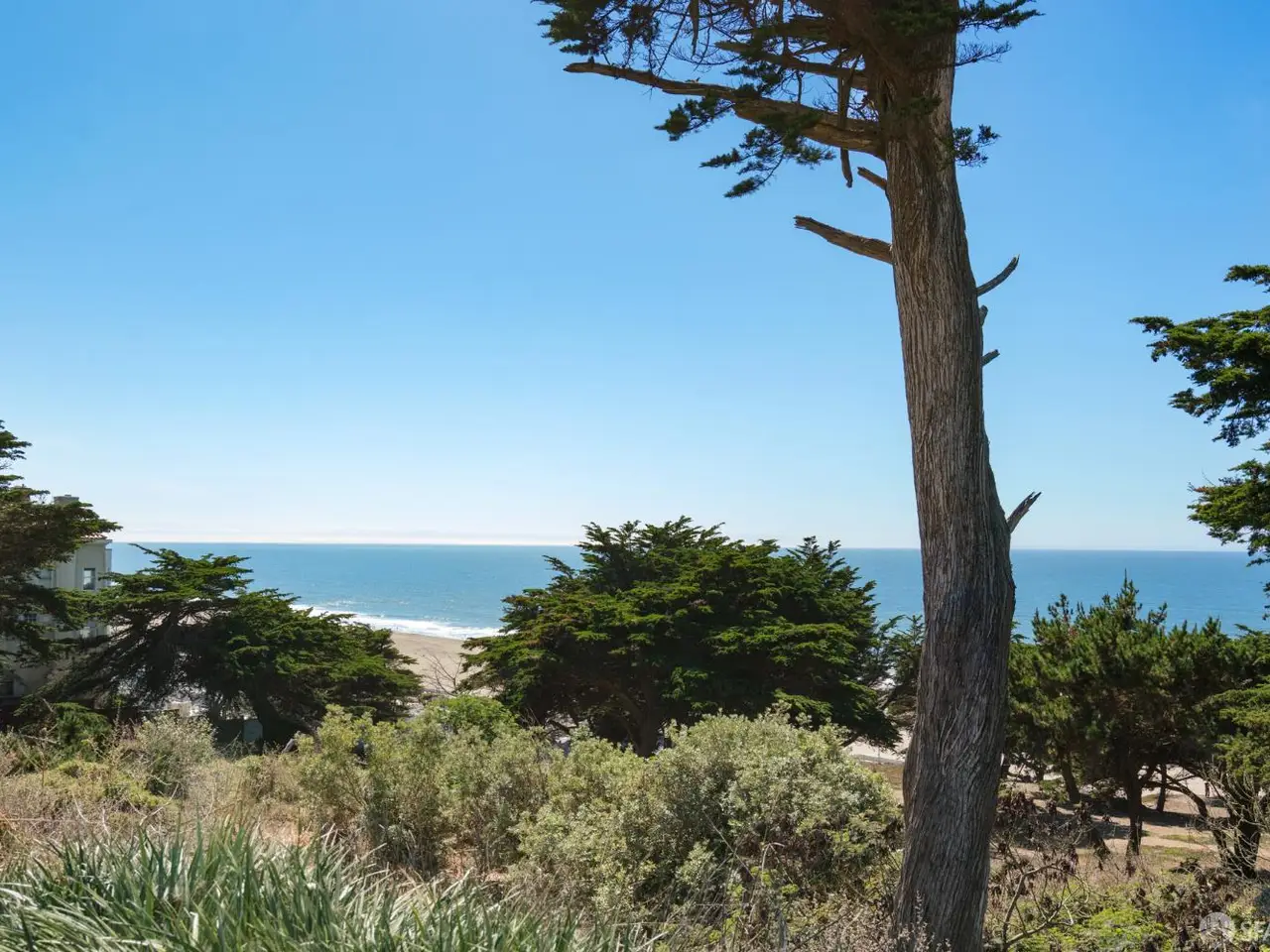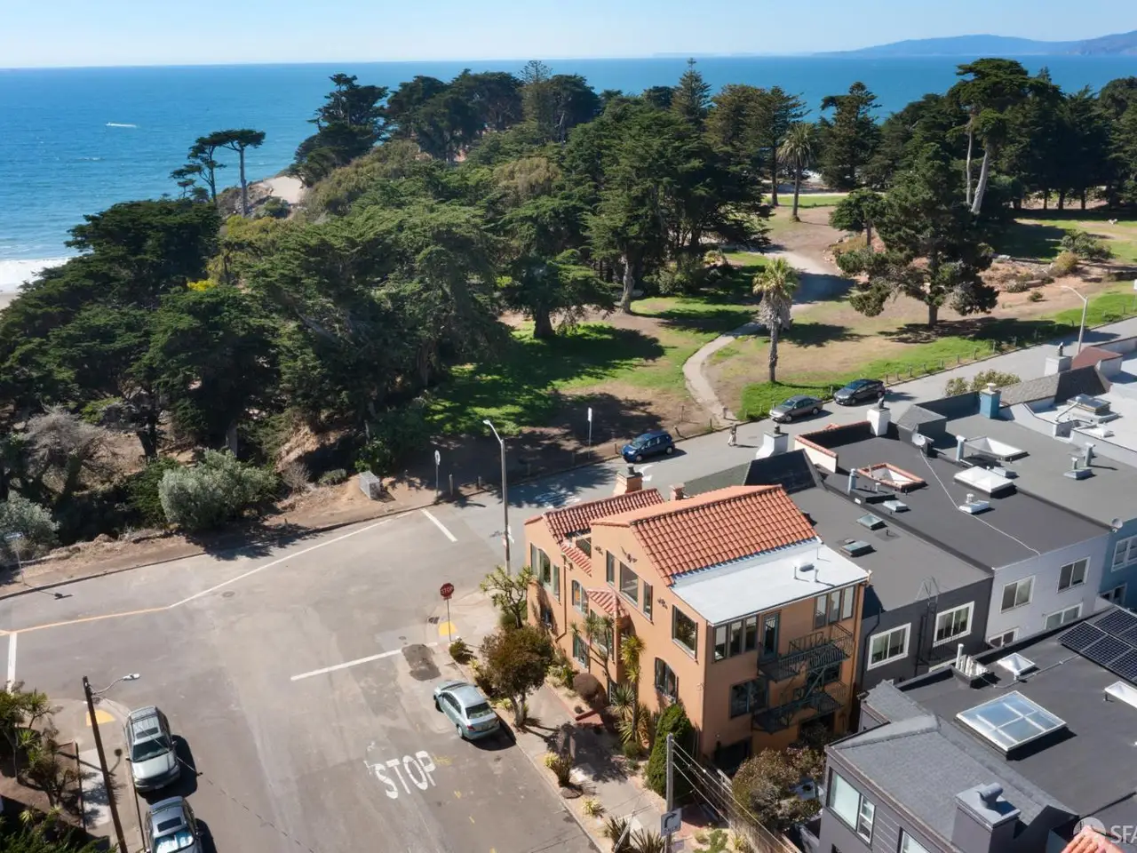 This stately, semi-detached residence, expanded and beautifully remodeled in 2003, occupies a commanding corner across from Sutro Park with sweeping views of the Pacific Ocean, Ocean Beach, and Sutro Park. Underground power lines ensure premium views. The light-filled main level showcases an open floor plan with oversized picture windows, inlaid wood floors, and beamed ceilings. A chef's kitchen with stone countertops, premium stainless appliances, and a cozy breakfast nook overlooks the ocean. Two bedrooms and a full bath complete this level. Upstairs, the grand primary suite impresses with vaulted, beamed ceilings, a private ocean-view terrace, spa-inspired en-suite bath, and a dedicated home office with custom cabinetry. The lower level offers a generous family/media room with a wet bar, built-in cabinetry, and a third full bath. French doors open to a private garden patio, perfect for entertaining. A large garage with storage and laundry adds convenience. With its unrivaled location across from Sutro Park, the home provides easy access to great schools, Land's End trails and views, Ocean Beach, the Sunset dunes, the Beach Chalet, and Golden Gate Parkplus nearby Safeway, cafs, and public transit.