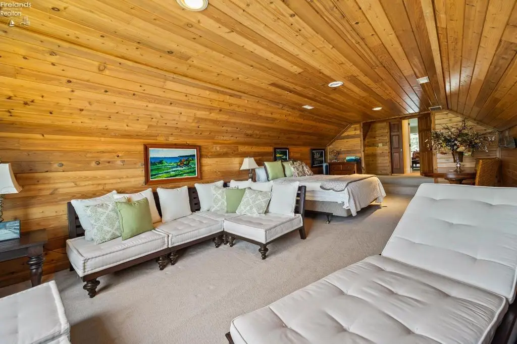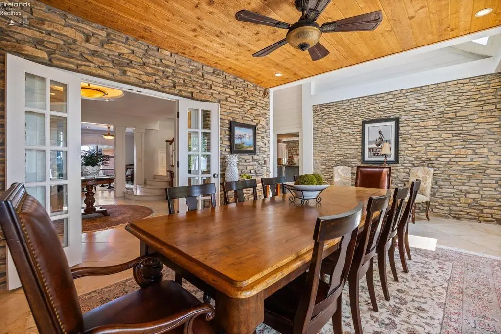 Exquisites Luxusanwesen am Wasser – Blick auf Sonnenauf- und -untergänge / über 600 m² / über 460 m² Willkommen in Ihrem privaten Rückzugsort am Wasser – wo Luxus, Erholung und Natur vereinen. Dieses individuell gestaltete Anwesen aus Ziegeln bietet einen atemberaubenden Blick auf Sonnenauf- und -untergänge, 41 m unberührtes Seeufer und 44 m geschützte Bucht, eingebettet in ein über 600 m großes, wunderschön angelegtes Grundstück. Genießen Sie ein Leben im Resort-Stil mit Sandstrand, privatem Volleyballplatz, Minigolfplatz und großzügigen Außenbereichen, die sich perfekt zum Entspannen und Unterhalten eignen. Versammeln Sie sich am Gaskamin, erkunden Sie die Cabana mit Vollbad oder starten Sie direkt von Ihrer privaten Bootsrampe ins Wasser. Im Inneren erwarten Sie über 460 m² sorgfältig gestaltete Wohnfläche mit 4–5 Schlafzimmern, vier Vollbädern und zwei Gäste-WCs sowie hochwertiger Ausstattung. Der abgeschlossene Haupteingang sorgt für absolute Privatsphäre. Der große Wohnbereich ist ein echter Hingucker und besticht durch maßgefertigtes Mauerwerk, einen gemütlichen Kamin und einen offenen Übergang zur Gourmetküche mit Sitzinsel sowie Holz- und Steinakzenten. Elegante peruanische Travertinfliesen ziehen sich nahtlos durch die Hauptwohnbereiche. Ein eigener Weinverkostungsraum mit Kühlbox lädt zu ruhigen Momenten oder geselligen Zusammenkünften ein. Die großzügige Master-Suite im Erdgeschoss verfügt über ein eigenes Spa-Bad, eine ebenerdige Dusche, Doppelwaschbecken, einen maßgefertigten begehbaren Kleiderschrank und Zugang zur Terrasse. Ein Arbeitszimmer im Erdgeschoss mit Kamin sorgt für einladende Wärme. Im Obergeschoss befinden sich ein geräumiges Loft, drei weitere Schlafzimmer und zwei Badezimmer – ideal für Gäste oder Familie. Ob Sie Gäste am Wasser unterhalten, einen ruhigen Abend am Kamin genießen oder den Panoramablick genießen – dieses Anwesen bietet Urlaubsfeeling pur.