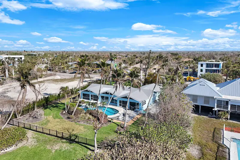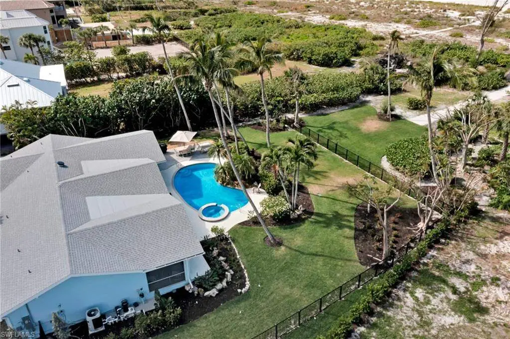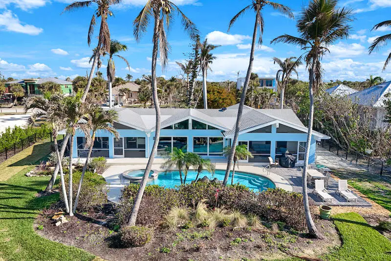 Gulf frontage. This coastal oasis with a mid-century modern feel boasts an acre of tranquil privacy in a garden-like setting with a meandering path to the water's edge to play in the warm sand or enjoy the gulf waters. The rear chateau like elevation is complimented by a large patio area providing room for outdoor dining/seating, a sparkling pool and spa perfect for a cooling swim, sunbathing poolside, or spending the evening in the spa soaking up the warmth and breathtaking sunset views. This home has been completely remodeled down to the studs and features a newer roof, impact glass windows and doors, pool scheduled to be resurfaced in Summer 2025 and much more. Ideal setting for entertaining, you will appreciate the inviting main gathering area with vaulted cypress tongue and groove ceiling, new flooring, three arches in the home, sliding doors from each room with western exposure and chic furnishings to compliment the ultimate Island retreat. This stately neighborhood of Chateau Sur Mer offers just 70 home sites, casual elegance and privacy. Exterior images are pre-Milton and landscaping is in the process of being nurtured or replaced. Great rental; future bookings to be honored.
