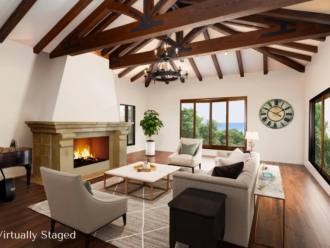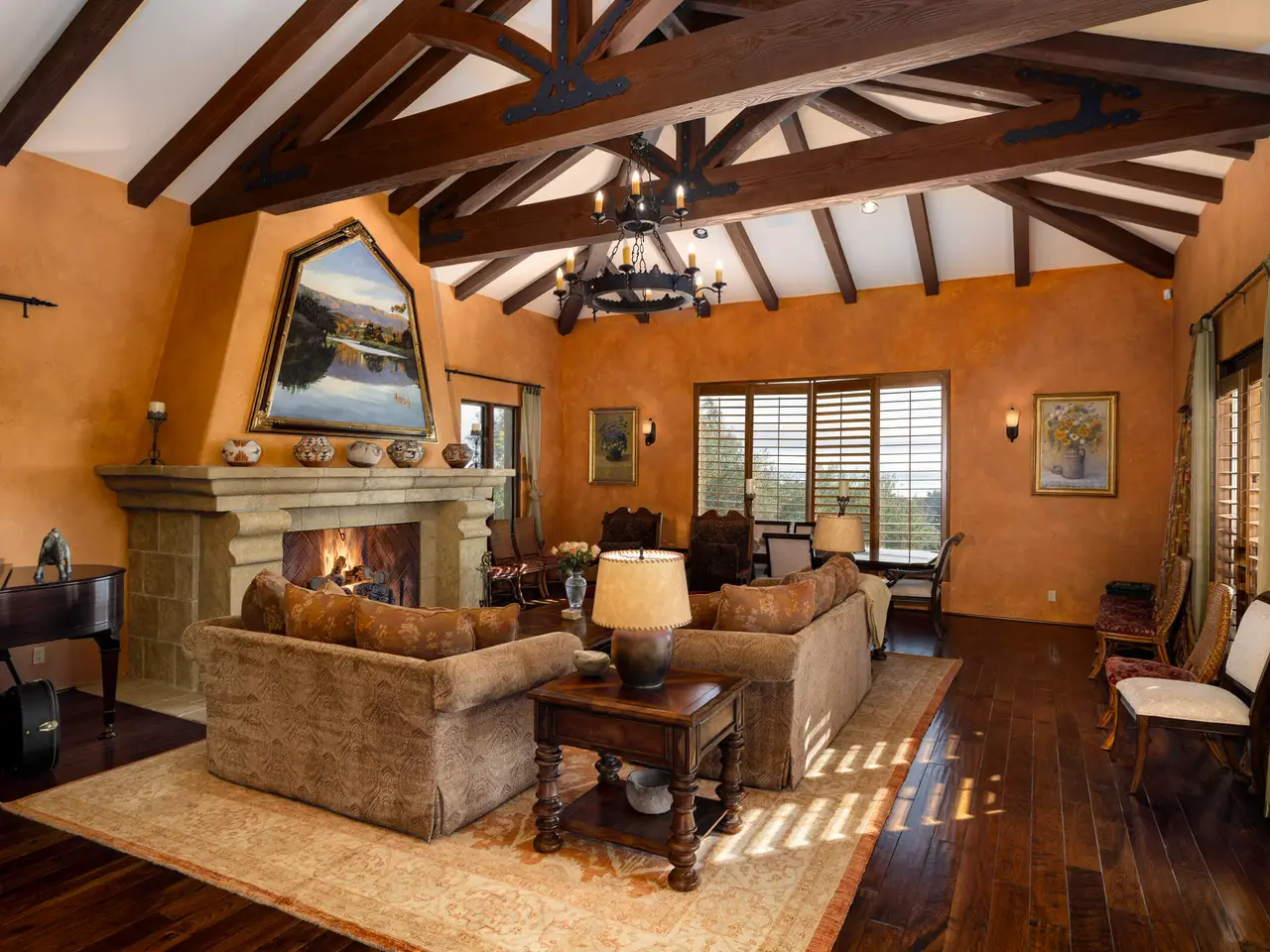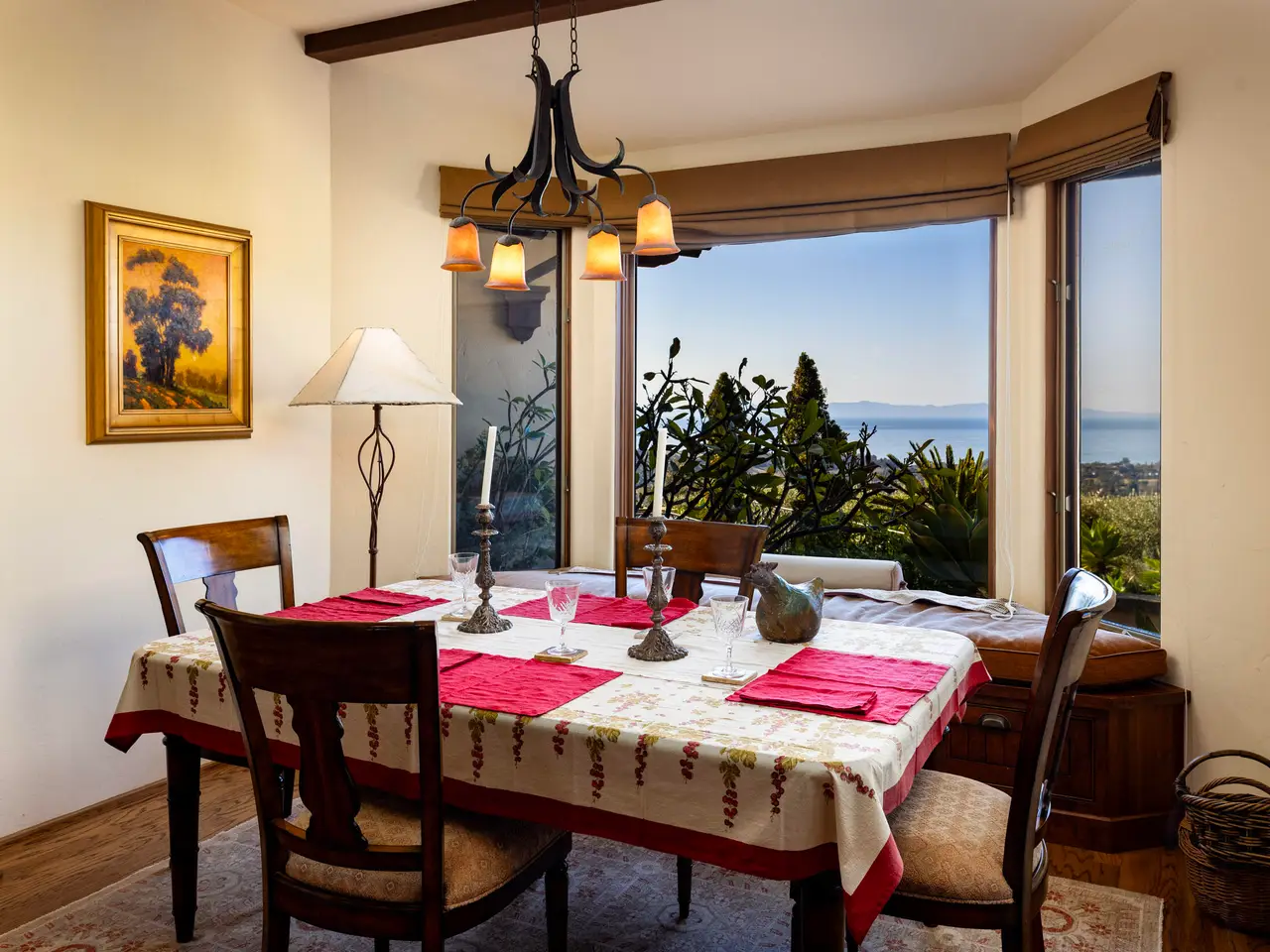 Defined by its vast ocean, island, & harbor views stretching over the Pacific, this estate offers an ever-changing panorama of tranquil horizons. The ocean's beauty fills every room with natural light & serenity. Grand arched entryway, intricate wrought iron door, soaring ceilings with exposed beams, & stone floors evoke the charm of a European villa. A magnificent stone fireplace stands as the core of the grand living room. This space is large enough for several seating areas all flowing out to the pool terrace and /or gardens. The Formal Dining Room opens to both the Living Room and has a private terrace complete with a fountain and lush landscaping. Expansive Gourmet Kitchen with View Breakfast room. The Kitchen features Stainless steel appliances as well as a large island with seating Commodious storage in the adjacent walk-in pantry and separate butler's pantry. Family Room flows from the Kitchen space to a covered entertaining terrace complete with barbeque. The Family Room has a custom fireplace as well as a full wet bar with bar seating and an exceptionally large temperature controlled Wine Cellar. A Library features a fireplace, built-ins as well as a full bathroom. Library/office has direct access to the gardens and terraces. The Grand Staircase leads to the Primary suite as well as 4 additional suites with several opening out to view terraces. The gracious Primary Suite is in its own wing and offers a sitting area w/fireplace, beamed ceilings as well as several ocean/harbor view terraces. The Primary Suite Bath features an enormous steam shower, separate jacuzzi style tub, dual vanities and commode closet. Two very large walk-in closets with custom built-ins complete the space. An additional custom spa is reached off the bedroom wing. Additional features include a gated entry, an oversize three car garage with storage, a Full Home generator, Car charging station, Private shared well for irrigation as well as a private gym room off the pool. This property also features numerous terraces, large lawn area, numerous fruit trees, and a glistening pool with spa and water feature.