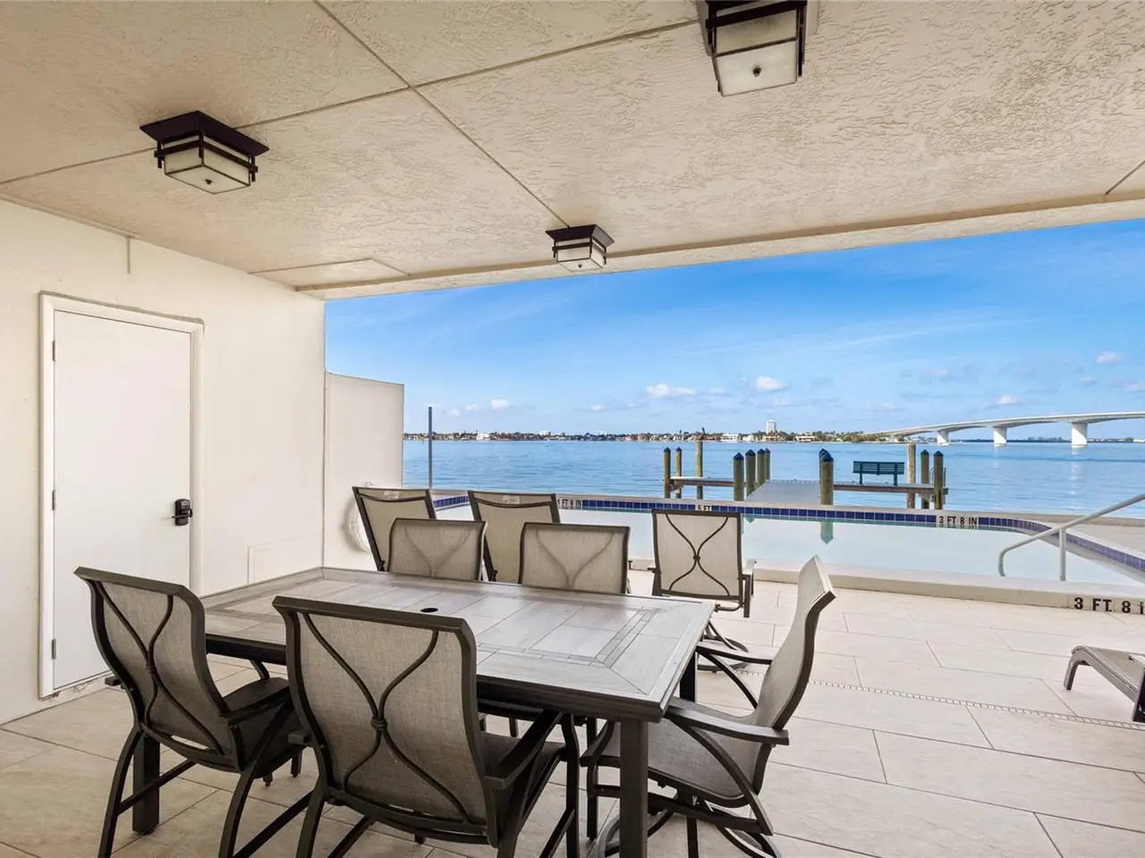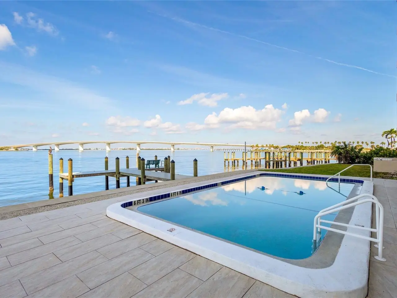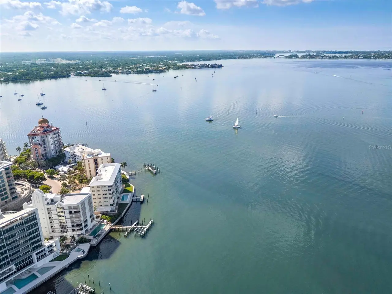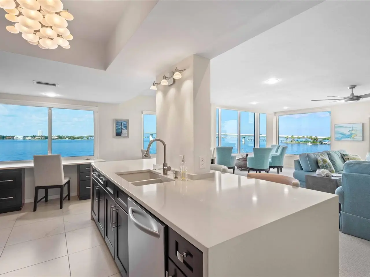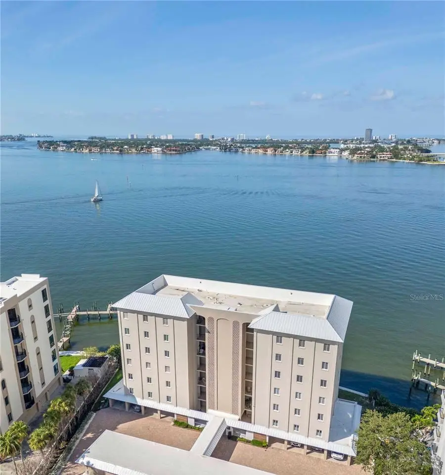 Coastal living at its finest, the panoramic and breathtaking views from this Golden Gate Point residence offer an unparalleled yet attainable opportunity to live the sought-after waterfront lifestyle. This elegantly renovated corner unit boasts walls of impact-rated PGT windows (2024) that perfectly frame sweeping views of Sarasota Bay, Bird Key, and the iconic John Ringling Bridge, offering a front-row seat to jaw-dropping sunsets and endless natural beauty. The open-concept kitchen has been thoughtfully redesigned with a quartz waterfall island, soft-close cabinetry, built-in desk, and a seamless flow into the living and dining areas - ideal for both entertaining and everyday living. The spacious great room enjoys phenomenal north and west-facing vistas, with the unit uniquely set in front of the neighboring building to maximize natural light and privacy. Throughout the residence, you'll find custom interior doors, a neutral color palette, thoughtfully renovated bathrooms, and elevated finishes that reflect refined taste. Both bedrooms feature serene bay vistas, and the expansive 18' x 12' primary suite allows space for a sitting area or workspace plus separate reach-in and walk-in closets in the vestibule leading to the primary bathroom. Storage is abundant, with a large entry closet, full-size hallway closet, a generous 8' x 7' laundry/utility room, and a 6' x 5' private storage room conveniently located just outside the front door. Residents of this boutique community enjoy exceptional amenities, including a heated bayfront pool (34' x 17'), day dock, outdoor shower, and renovated poolside bath. Assigned covered parking and ample guest parking provide convenience. Set on the prestigious Golden Gate Point peninsula with its tree-lined and brick-pavered street, this residence is minutes from downtown Sarasota's dining, arts, and cultural attractions, as well as the shops and restaurants of St. Armands Circle and the world-famous beaches of Lido Key. This is a rare opportunity to live the waterfront lifestyle in one of Sarasota's most exclusive neighborhoods.