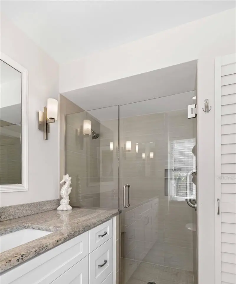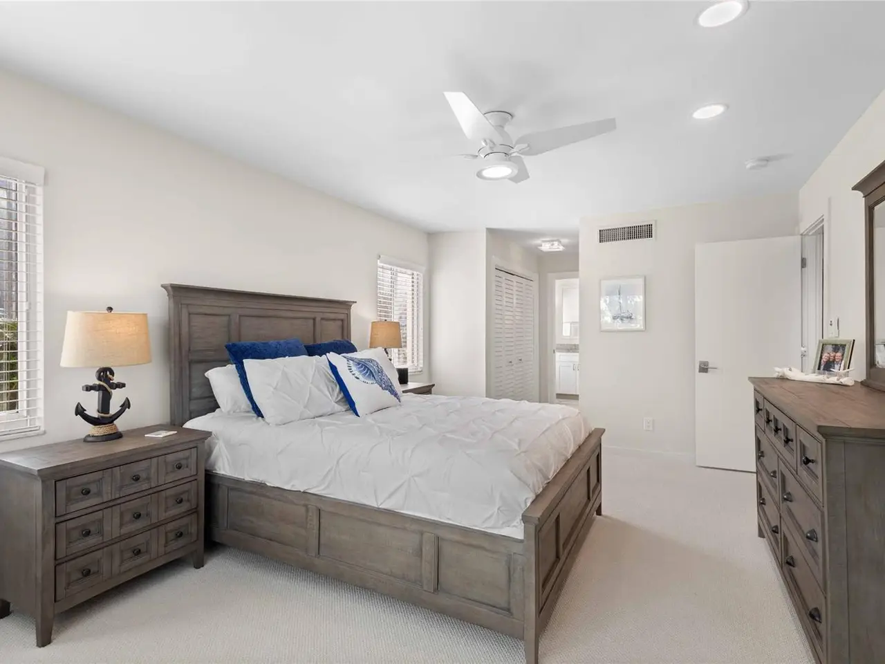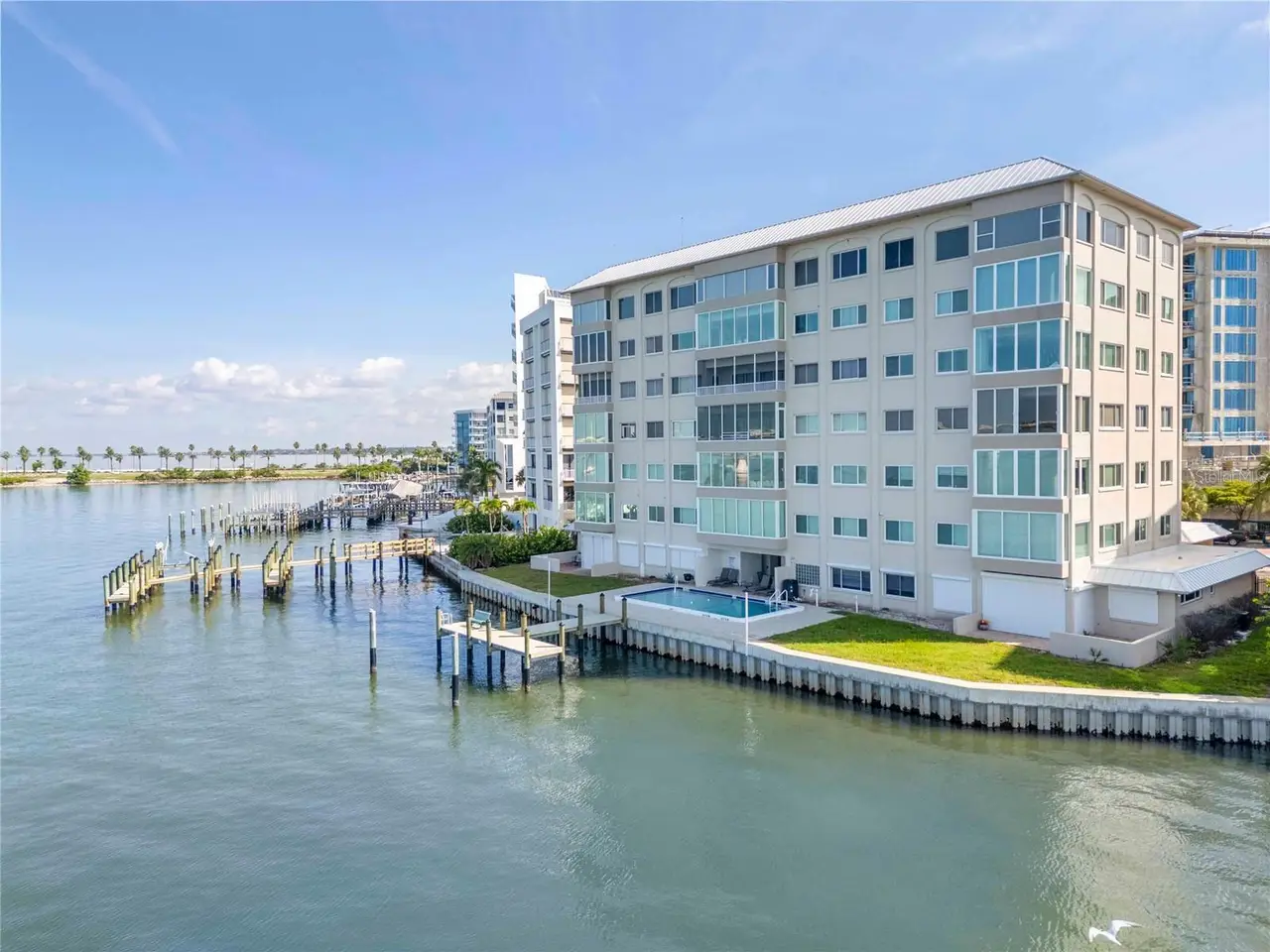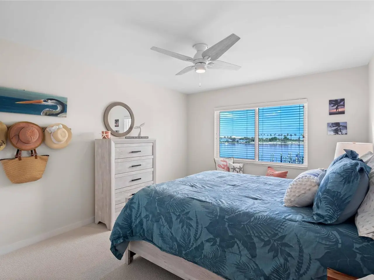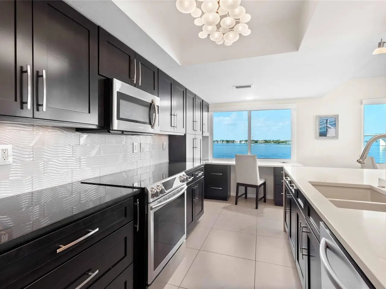 Coastal living at its finest, the panoramic and breathtaking views from this Golden Gate Point residence offer an unparalleled yet attainable opportunity to live the sought-after waterfront lifestyle. This elegantly renovated corner unit boasts walls of impact-rated PGT windows (2024) that perfectly frame sweeping views of Sarasota Bay, Bird Key, and the iconic John Ringling Bridge, offering a front-row seat to jaw-dropping sunsets and endless natural beauty. The open-concept kitchen has been thoughtfully redesigned with a quartz waterfall island, soft-close cabinetry, built-in desk, and a seamless flow into the living and dining areas - ideal for both entertaining and everyday living. The spacious great room enjoys phenomenal north and west-facing vistas, with the unit uniquely set in front of the neighboring building to maximize natural light and privacy. Throughout the residence, you'll find custom interior doors, a neutral color palette, thoughtfully renovated bathrooms, and elevated finishes that reflect refined taste. Both bedrooms feature serene bay vistas, and the expansive 18' x 12' primary suite allows space for a sitting area or workspace plus separate reach-in and walk-in closets in the vestibule leading to the primary bathroom. Storage is abundant, with a large entry closet, full-size hallway closet, a generous 8' x 7' laundry/utility room, and a 6' x 5' private storage room conveniently located just outside the front door. Residents of this boutique community enjoy exceptional amenities, including a heated bayfront pool (34' x 17'), day dock, outdoor shower, and renovated poolside bath. Assigned covered parking and ample guest parking provide convenience. Set on the prestigious Golden Gate Point peninsula with its tree-lined and brick-pavered street, this residence is minutes from downtown Sarasota's dining, arts, and cultural attractions, as well as the shops and restaurants of St. Armands Circle and the world-famous beaches of Lido Key. This is a rare opportunity to live the waterfront lifestyle in one of Sarasota's most exclusive neighborhoods.
