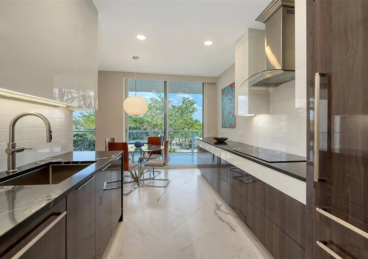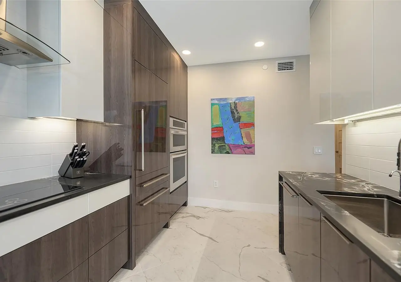 Sleek European cabinetry and high-end appliances