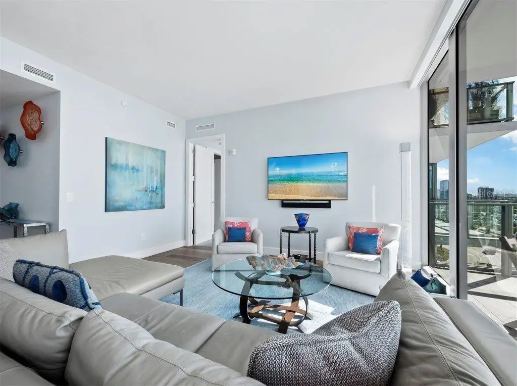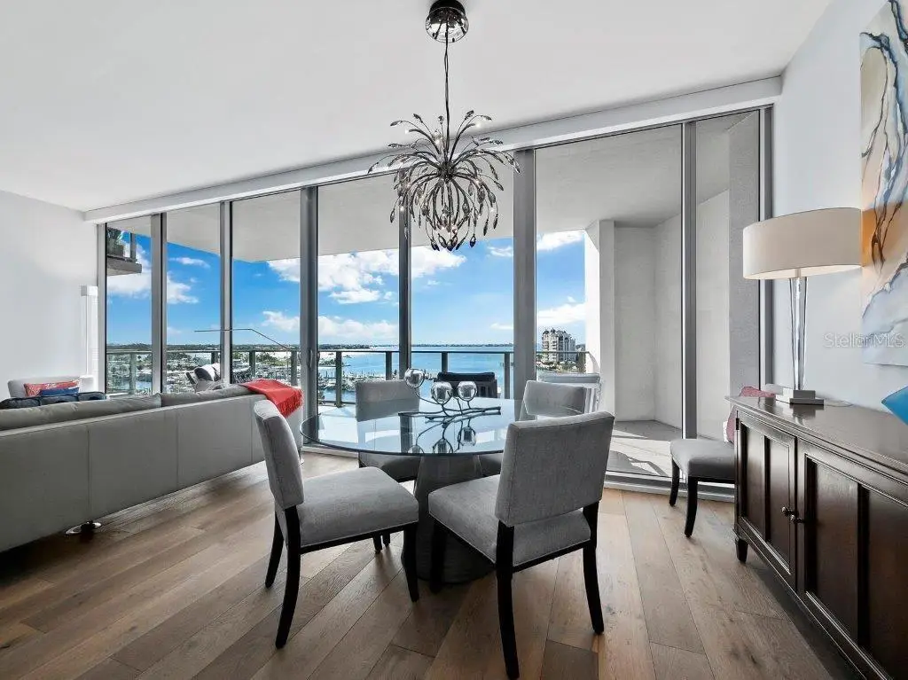 A fabulously appointed designer residence in a coveted, amenity-rich building, VUE 703 offers the pinnacle of luxury living in the heart of Sarasota's cosmopolitan downtown. Now available turnkey with luxury furnishings and accessories. Renowned for its exceptional resort-style living and elegant contemporary style, VUE is an incredible high-rise building with enviably curated amenities that extend from the valet service and concierge to plush resident lounges and facilities, all within steps of Sarasota's world-class cultural scene and thriving hub of shops, restaurants, and galleries. This elevated residence with private elevator access is a spacious retreat that blends the sleek modern style of the building with exquisite design elements that lend warmth and enhance the luxurious comfort. Premium upgrades include elegant wide-plank wood floors, designer lighting and decor-both by Creston; high-end built-in audio video system, water filtration by Aqua, while tall 10" ceilings throughout accentuate absolutely stunning water views. From the front door, unobstructed site lines showcase spectacular southwest vistas across Sarasota Bay and the keys to the Gulf of Mexico beyond. Thoughtfully designed to maximize the views, the home features an airy, open layout with a full wall of floor-to-ceiling sliding impact glass doors that extend the central living space to a deep private terrace with glass railings. Overlooking the dining and central living spaces, the gourmet kitchen with beautiful Italian cabinetry and stainless appliances wraps around a large quartz-clad island with abundant prep and storage space as well as additional seating for guests. The open plan living room and dining area are perfect for entertaining, flowing seamlessly to a private terrace that spans nearly 300 square feet with protective shade and picture-perfect views overlooking the waterfront and marina. The owner's suite enjoys its own floor-to-ceiling wall of windows for spectacular water and sunset views, with a resort-style bathroom that features extra-long double vanity, enviable storage, glass-enclosed walk-in shower, and separate water closet. Two separate walk-in closets add to the owner's luxury. Near the home's entry, a spacious second bedroom offers en suite comfort and ample closet space, and a separate den accommodates a private office or media lounge. The additional half bath is luxuriously outfitted with haute design elements including crystal sconces and a carved onyx sink. A generous, separate utility room with washer and dryer adds to the exceptional in-home conveniences. The residence comes with deeded, secure storage space and two assigned parking spaces that are gated and enclosed. Ideally located across from Sarasota's celebrated waterfront and within steps of Downtown's cosmopolitan core, VUE is a highly sought after address with a dazzling array of premium amenities including heated pool and spa with a spectacular pool deck that encompasses multiple lounge areas, fire pit, and enormous pergola with gourmet grill station. Additional amenities include fitness center, dedicated pet recreational area, concierge and security. Offered by the original owners, meticulously maintained and upgraded, VUE 703 is a valuable opportunity to enjoy a lifestyle of ultimate comfort and style.
