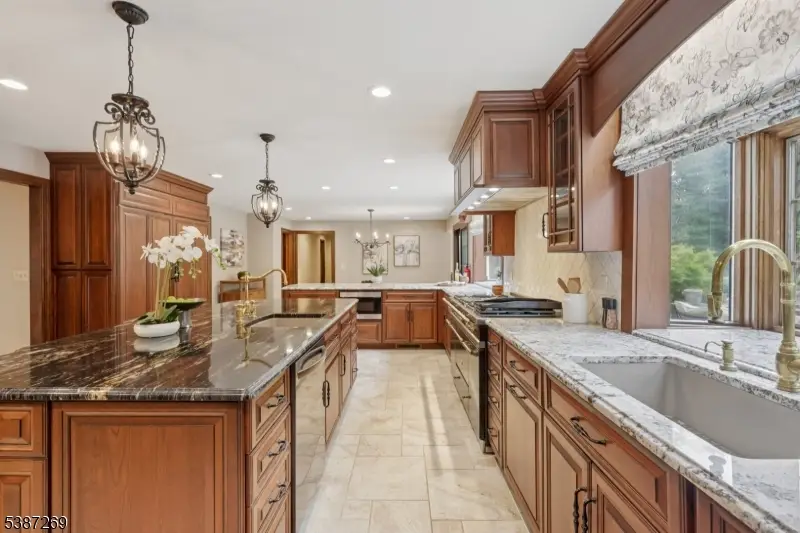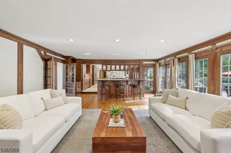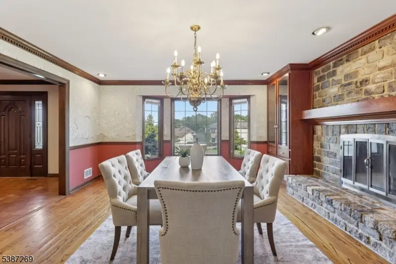 This exceptional 5-bedroom, 5.1-bath estate is a rare find, blending architectural interest with inspired design and functionality. Nestled on a quiet cul-de-sac in one of Scotch Plains' most desirable neighborhoods, it sits on 1.34 park-like acres with amenities for entertaining and everyday living. A striking stone exterior opens to expansive rooms, hardwood floors, five fireplaces, and a dramatic two-story living room with a spiral staircase to a wrap-around library. The chef's kitchen, renovated in 2019, features a 60" Lacanche range imported from France, dual Sub-Zero refrigerators, two dishwashers, and custom cherry cabinetry. The luxurious primary suite offers dual walk-in dressing closets, a spacious sitting area retreat with fireplace, and a private spiral staircase to a loft, creating a true spa-like escape. Multiple formal and informal living spaces make gathering easy. The third floor and finished lower level provide additional retreats, including two bedrooms, a full kitchen, wet bar, full bathroom, entertainment areas, game rooms, exercise room, and separate garage entrance. Outdoors, enjoy a heated in-ground pool and spa, three patios, a gazebo with lighting and integrated sound system, professional landscaping, and privacy on all sides. Two garages accommodate five cars, with the detached garage offering a workshop and additional storage.