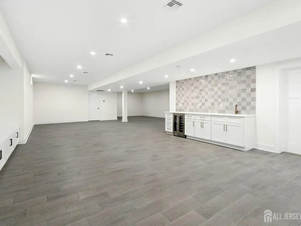 Sprawling entertainment area with custom bar