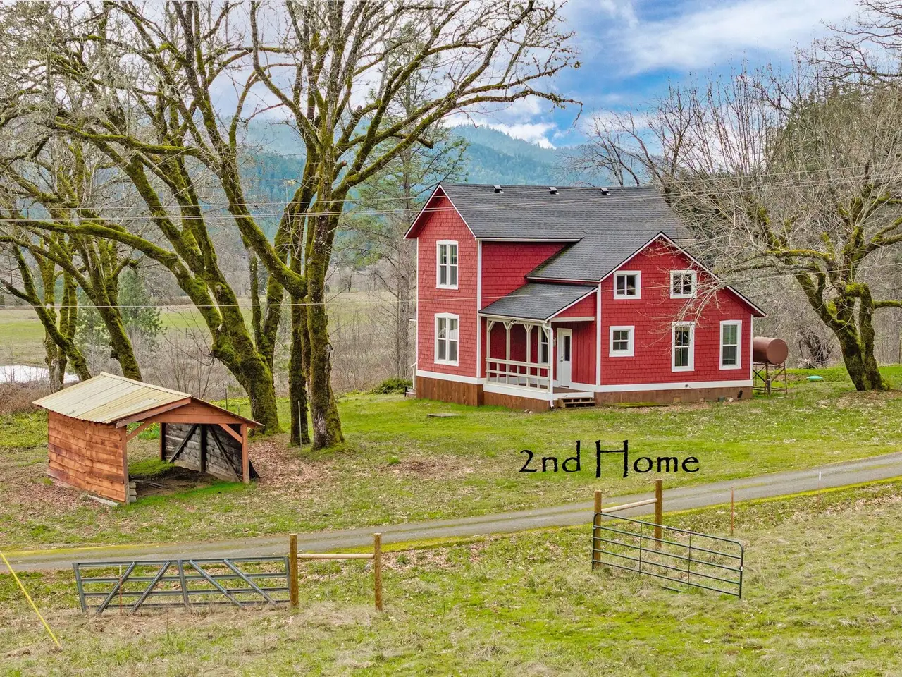 Southern Oregon Dream Ranch on just over 76 Acres located just 1 hour from the Medford International Airport and 1.5 Hours to the Coast. Stunning Mt views. 2 homes, 1 Studio, 2 Barns, Shop, carport, pond, pasture, springs & over 14 irrigated acres. Main home has had recent updates, 4 bdrms + office/den, 3.5 baths, 3976 SQ FT. Slate tile entry, new windows, trim, 2 newer HVAC, and flooring. Open beam wood ceilings, lg kitchen w/butcher Block Island, gas propane cooking and new s/s appliances. Primary suite w/French doors to deck with views, woodstove, updated bath w/ heated floors, quartz counters, soaking time & tile shower. 2nd Home is the original 1800's Farm House w/2 bdrms, 1 bath, 1526 SQ FT w/new windows, roof, foundation, front porch & more! Living rm w/French door to deck overlooking the pond. Shop w/water heater, full and half bath and w/d hook ups. Studio and Office off the shop. Backs to BLM on 1 side property is fenced w/a paved road and gated entry.