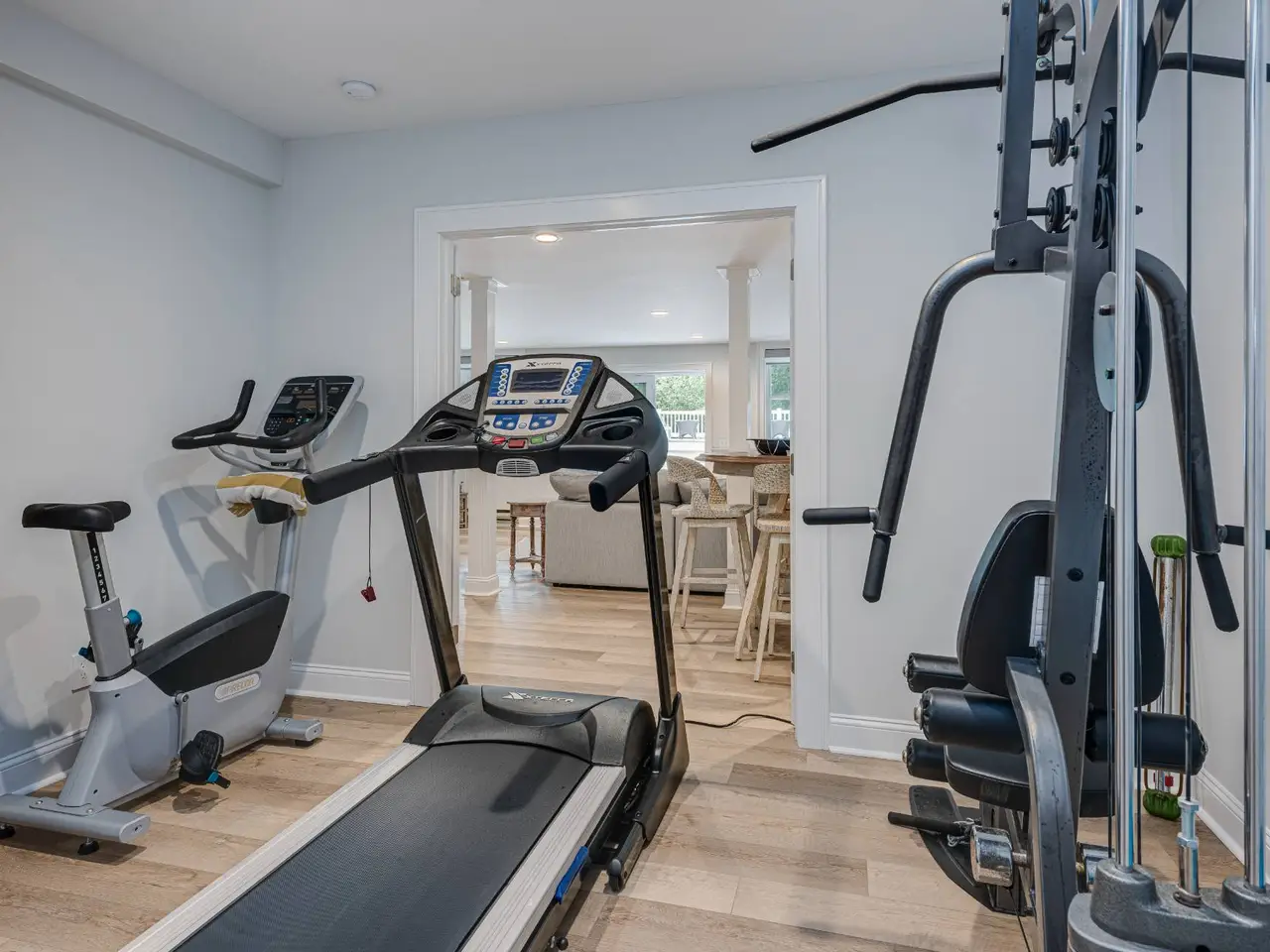 RP250274. On a quiet cul-de-sac, this beautifully renovated, three-level home offers a mature landscaped, private setting on 1.8 acres surrounded by a Peconic Land Trust reserve. 4,000 sf of Ipe decking leads to your tennis court, heated pool, outdoor dining and significant entertaining space.With the rear yard facing east, you are ensured of brilliant sun from dawn to late afternoon. The spacious, open floor plan on the main level offers a sun-drenched great room, a separate den, a junior master suite, dining area and chef's kitchen featuring top of the line appliances, wine/beverage fridge, double ovens and much more. Walk out onto your beautiful deck from both the kitchen and living areas. On the top level you'll find a very spacious master bedroom and bath with two additional guest bedrooms joined by a double sink, jack and jill bathroom. Down to the walk-out, lower level you'll find a large sitting/entertaining space, a separate office and a gym outfitted with professional grade equipment including a treadmill, bicycle and weight machine. Also, on the lower level you'll find the 5th bedroom and bathroom. This is the complete Hampton's package! The only thing you'll need to bring is your suitcase, and don't forget your toothbrush! Listing ID: 754635