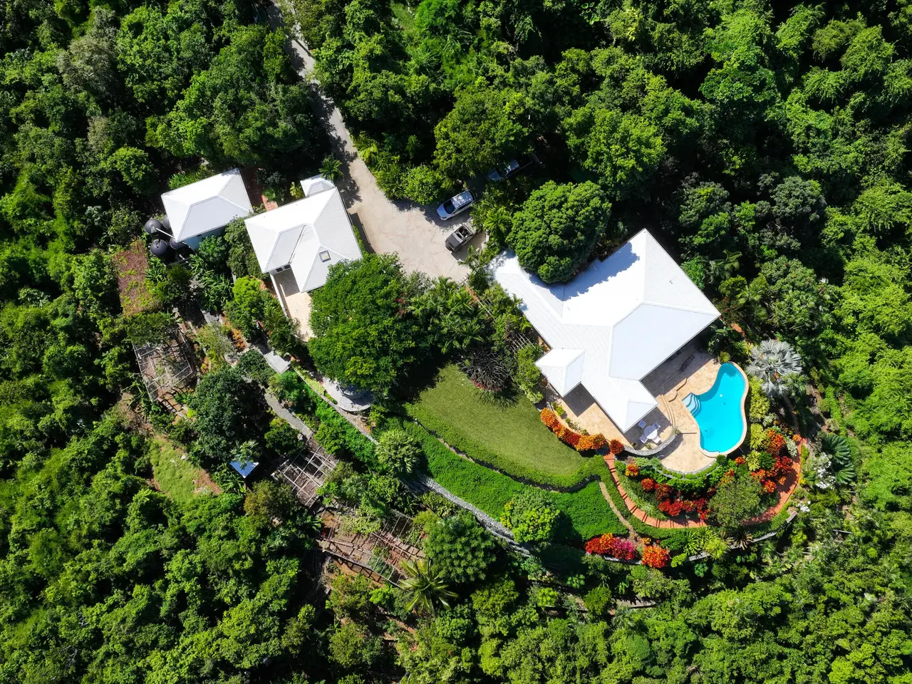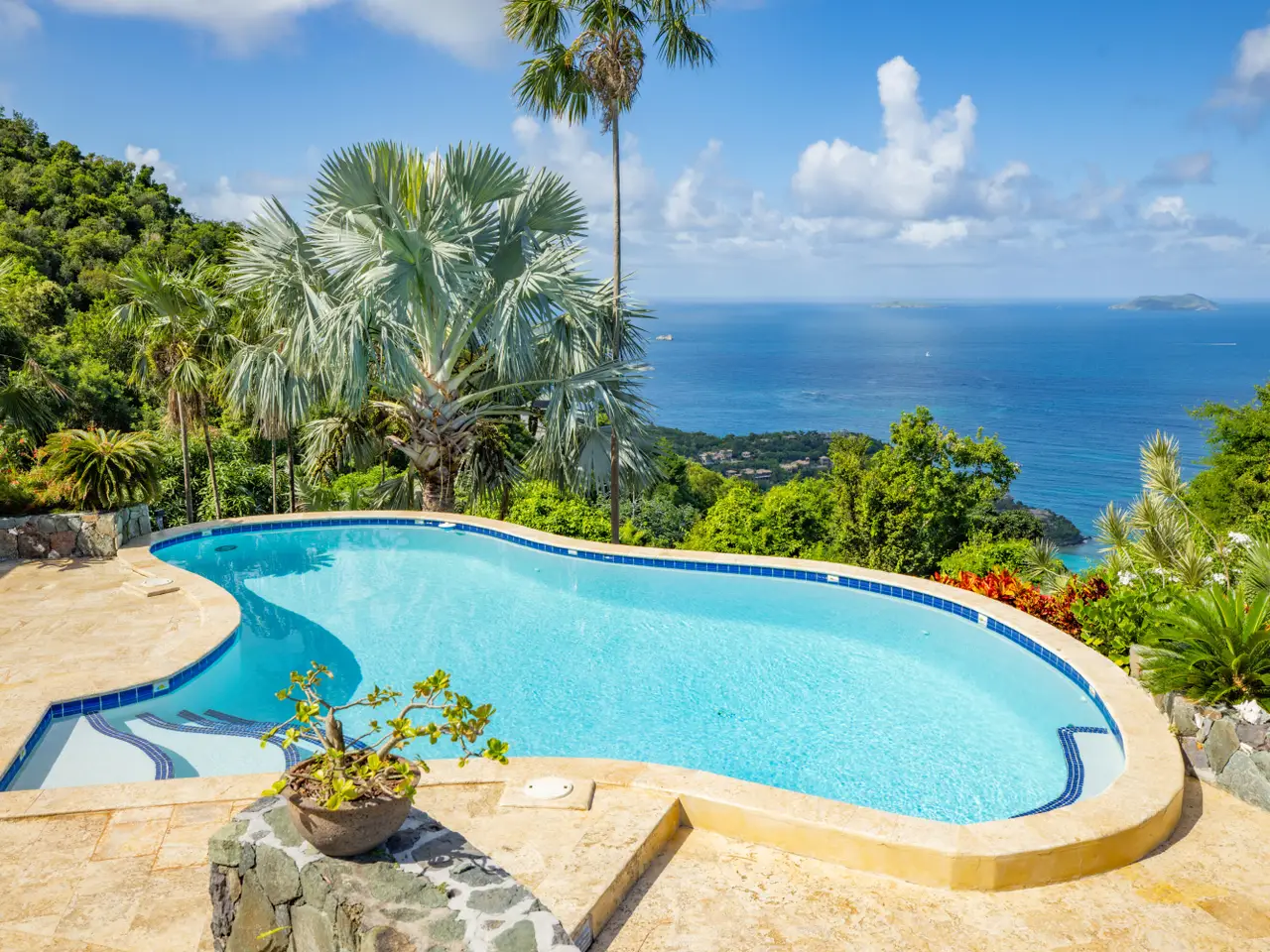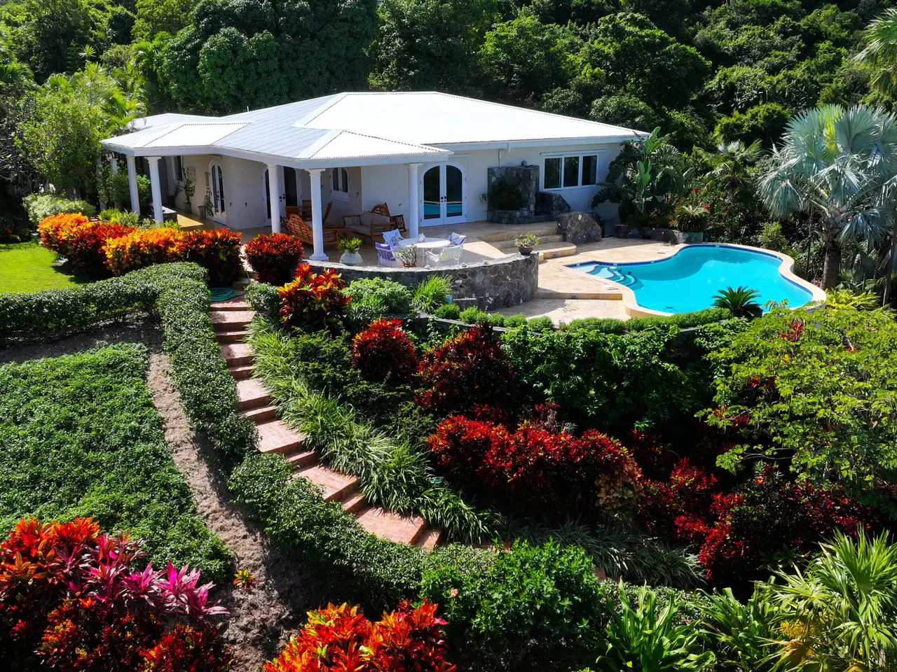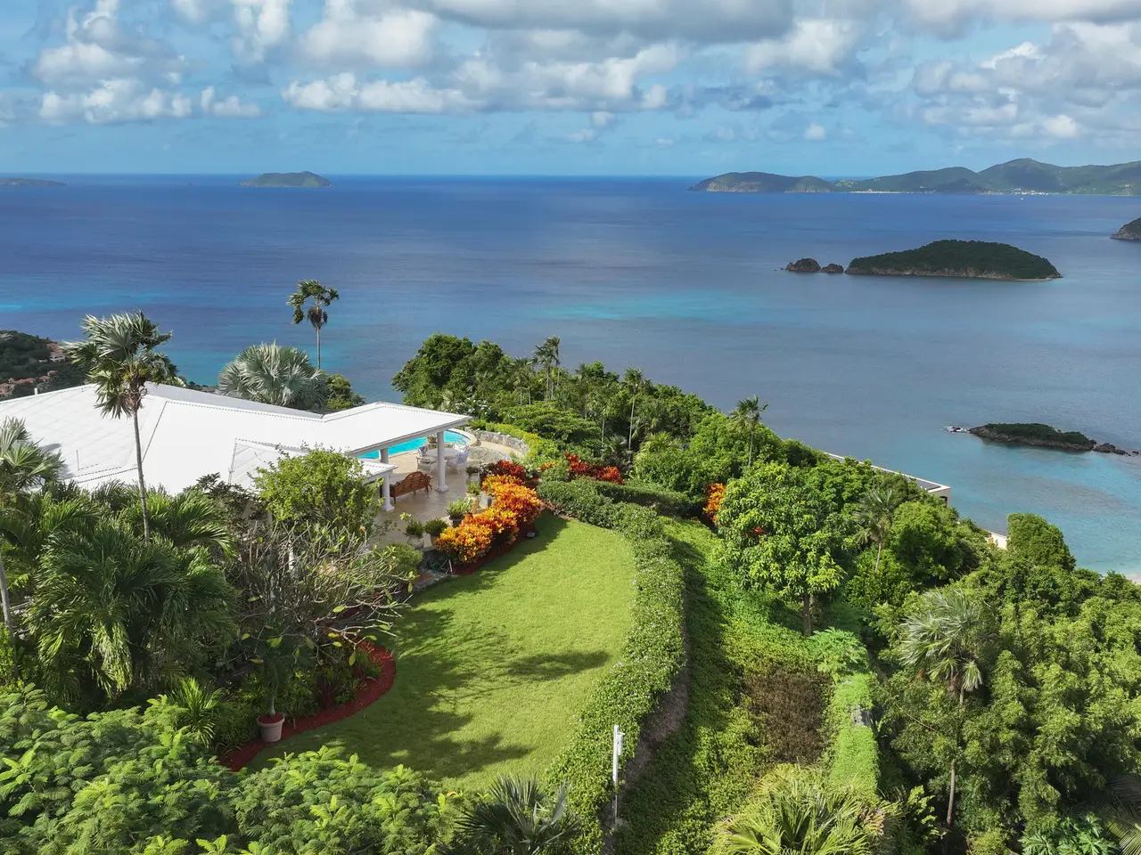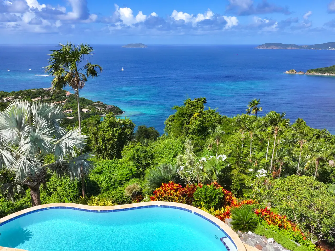 Rare opportunity to own an ultra-private, gated and secure compound situated in over two acres of the prestigious Catherineberg neighborhood. Bordering St. John's National Parkland and perched over 700 ft. above sea level, this exclusive estate offers fall-away views of the famed north shore beaches, the BVI's and beyond. Level entry through tropical gardens to sparkling pool, lawn with hot-tub gardens and sprawling terraces that highlight the sweeping vistas allowing for effortless indoor-outdoor living. An entertainer's dream. A half a mile of meandering stone walkways invites tranquil strolls through the terraced grounds of fruit trees. The sky is truly the limit for customizing this unique property into your ideal island escape.An extraordinary opportunity awaits to own an ultra-private, gated, and secure compound sprawled across over two acres of fenced property in the prestigious Catherineberg neighborhood. Nestled along the border of St. John's National Parkland and perched over 700 feet above sea level, this exclusive estate offers breathtaking fall-away views of the renowned north shore beaches, the British Virgin Islands, and beyond.