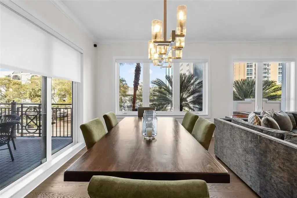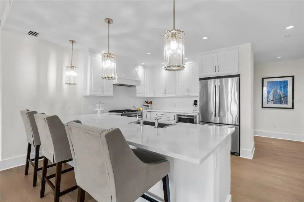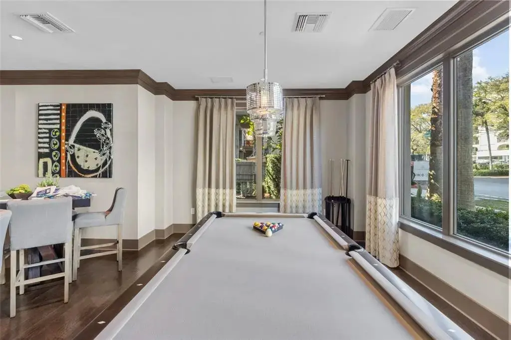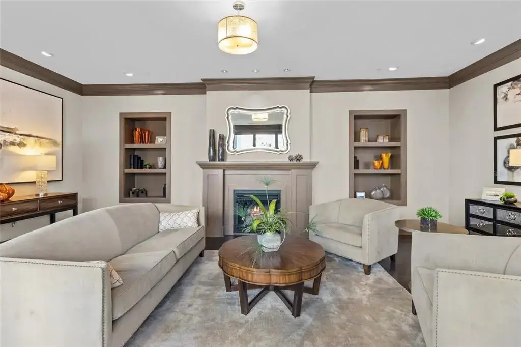 One or more photo(s) has been virtually staged. This is It! A rare opportunity for a front-facing corner residence with a private garage in Rowland Place—an Art-Deco–inspired boutique building by JMC (2015) with only 17 homes, set a half-block from Beach Drive NE in downtown St. Petersburg. Residence 302 offers 1,998 sq ft, 2 bedrooms, 2.5 baths, and a den/study that functions as a 3rd bedroom (built-ins + Murphy bed), plus a balcony. Light-filled great room and dining area open to the corner balcony. The chef’s kitchen features shaker wood cabinetry, quartz counters, stainless JennAir appliances including a five-burner gas range/oven, and a large double-door pantry. Interior finishes include genuine hardwood plank floors, designer lighting, and expansive hurricane-impact picture windows. The immense primary suite provides two walk-in closets and a spa-style bath with dual vanities, a large glass-enclosed shower, and a private water closet. Additional features in the condo include Hunter Douglas motorized/manual shades, abundant closet space, and an interior laundry room with Whirlpool front-load washer/dryer, cabinetry, and sink. Parking is exceptional—an oversized private single-car garage with ample storage area plus a second assigned space in the secure building garage. Rowland Place amenities include a rooftop deck with grill/lounge seating and views of the Vinoy Basin and Tampa Bay, and elegant lobby/club room spaces with fireplace and billiards. Rowland Place is a secure access building located mere steps from beautiful waterfront parks, the Pier, the Vinoy Resort, museums, galleries, restaurants, and shopping – everything the vibrant city of St. Pete has to offer!