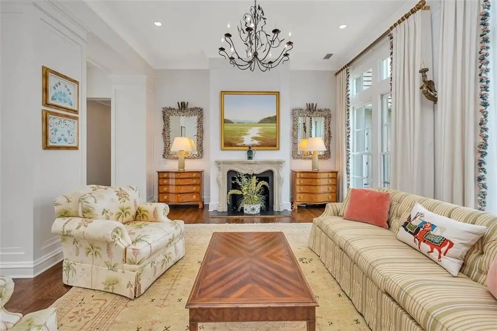 Stately stone fireplace in formal living room