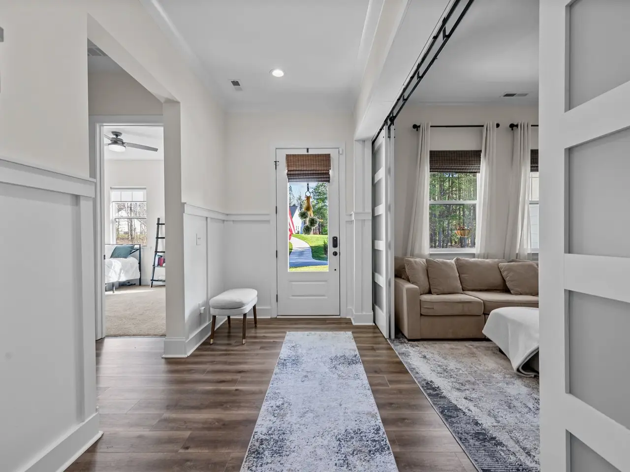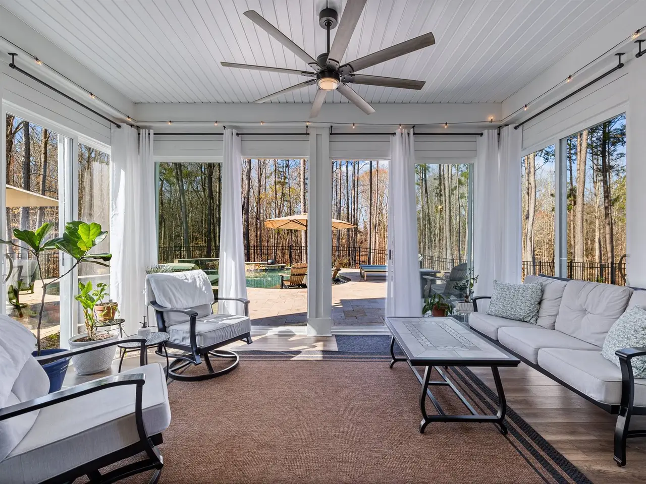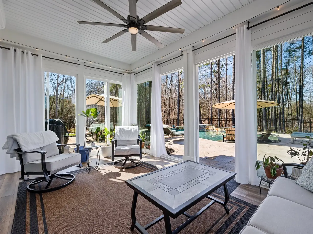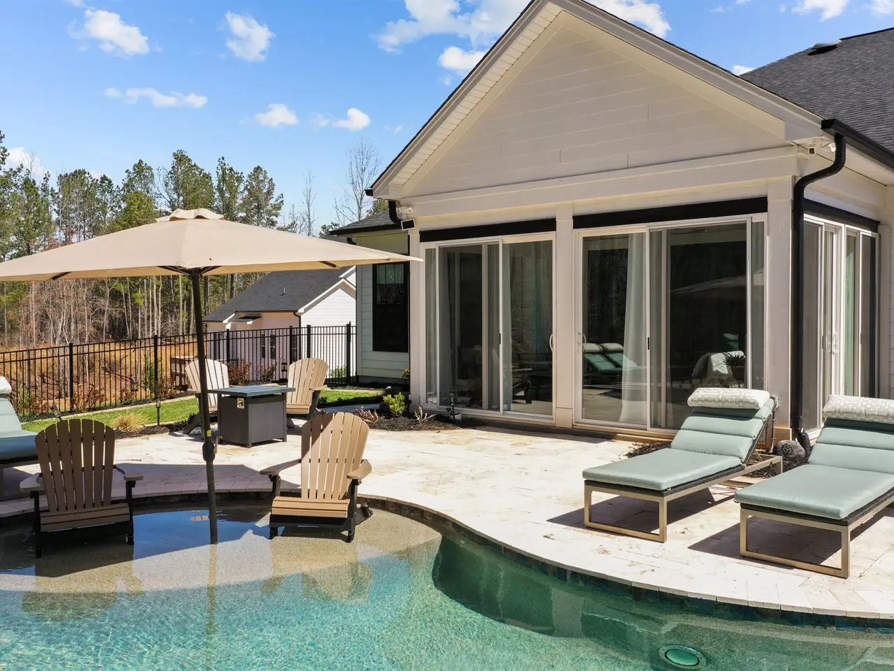 Indulge in the finest luxury living with this exceptional ranch home built in 2022 on over an acre, blending elegance, comfort, and modern convenience. The stunning primary suite offers a private retreat with a soaker tub and massive tile shower & large closet. With a flex room and a bonus room currently used as a 3rd guest bedroom, it offers versatile space for your family or guests. A bright all-season sunroom invites year-round enjoyment, with sliding doors throughout that lead you to a travertine deck and saltwater pool with a cascading waterfall, all surrounded by lush, manicured landscaping. The gourmet kitchen boasts a large quartz island and leathered granite countertops, custom built-ins, and a wine fridge, perfect for entertaining. Thoughtful upgrades include a whole-house 24kW generator, custom window treatments, an extended third-car driveway, and a security system with cameras. A truly sophisticated sanctuary, this home defines the lifestyle you're looking for.