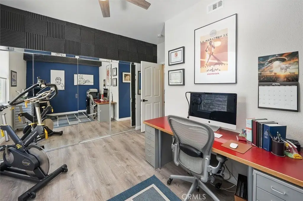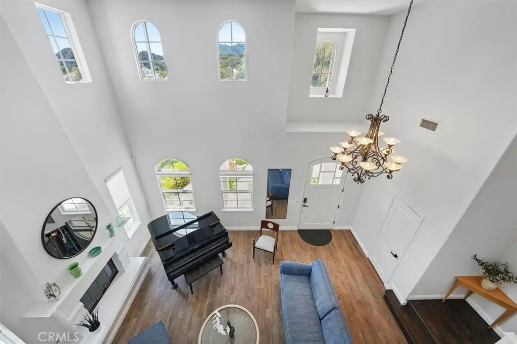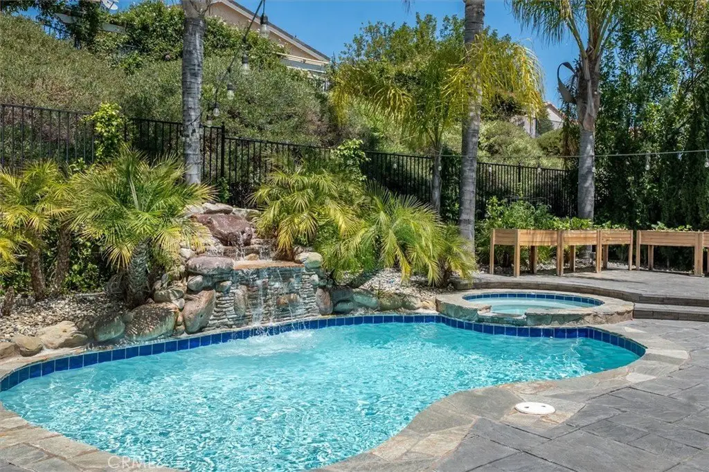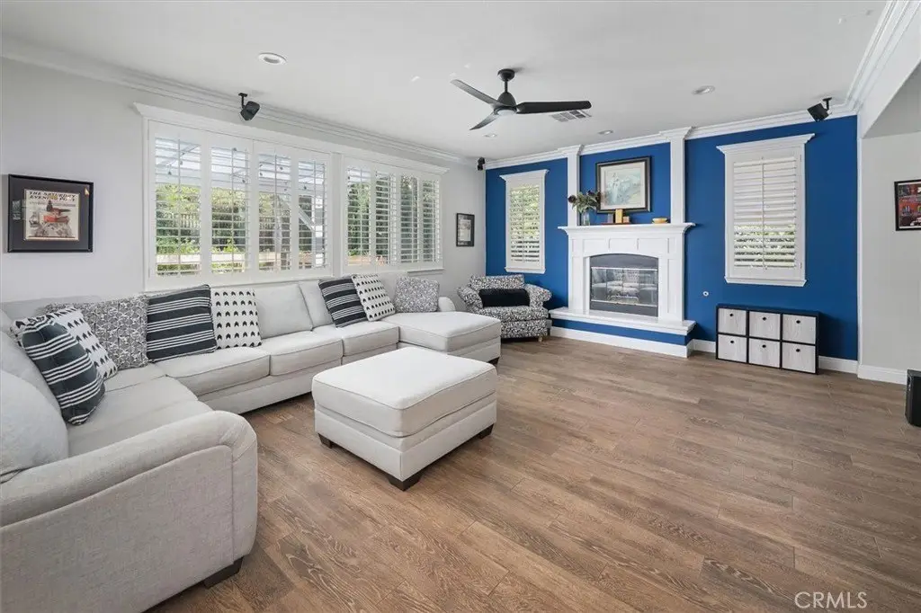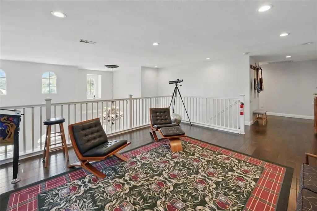 Nestled in a tranquil cul-de-sac, with stunning mountain views, this preeminent executive home offers a wonderful balance of elegance, comfort, and seamless indoor/outdoor living. Located in one of Stevenson Ranch's most coveted neighborhoods the home has superb curb appeal and a huge lot. Located just minutes from award-winning schools (including West Ranch High School), scenic parks, premier shopping, dining, and easy freeway access. From the moment you enter the door, the grand two-story formal living room impresses you with its soaring ceilings, abundant natural light, gorgeous fireplace and architectural details. Custom archways invite you into the family room with its cozy fireplace, sophisticated dining room, and designer-remodeled kitchen—a true chef’s delight. The kitchen features custom cabinetry with soft-close drawers, stainless steel KitchenAid appliances, and a built-in media cabinet. Elegant designer lighting highlights the expansive center island, perfect for gatherings. Upstairs, a spacious loft with breathtaking mountain views is an ideal setting for a media lounge, game room, or additional living space. The primary suite is a luxurious retreat, with vaulted ceilings and a spa-like en-suite bathroom with soaker tub, separate walk-in shower, full-wall linen closet with mirrored doors, and generous walk-in closet. One upstairs bedroom serves as a secondary primary suite with its own full, private bath, while two additional large bedrooms feature fresh paint and spacious walk-in closets. The downstairs fifth bedroom includes a three-door mirrored closet—perfect for a home office, guest bedroom or gym. The downstairs remodeled half-bath is plumbed for an additional shower. Designer wide-plank tile flooring, rich dark walnut hardwood, custom lighting, crown molding, window shutters, upgraded ceiling fans and elegant sconce fixtures create an ambiance of warmth and sophistication throughout the home. Step outside into a private refuge designed for year-round enjoyment. This is more than a backyard—it's an oasis. A patio cover frames the newly refinished sparkling pool and spa, while a brand-new built-in BBQ kitchen and outdoor firepit make entertaining a joy. This home features a leased solar power system (with battery backup) ensuring significant energy savings, reduced utility bills and peace of mind during power outages.