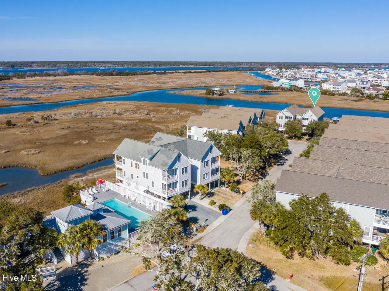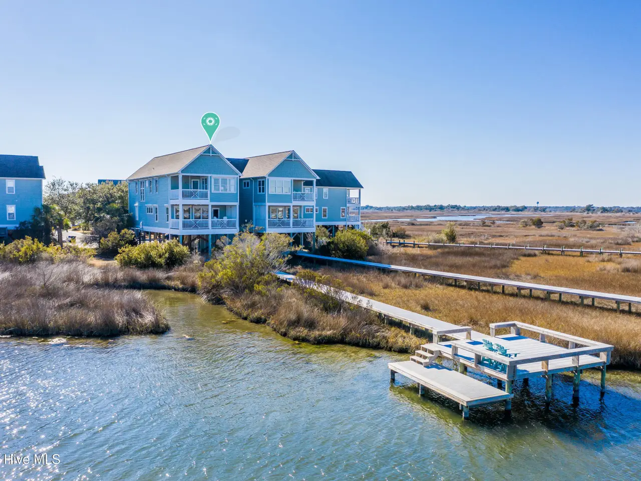 Stunning 4-bedroom, 4-bathroom Sound side waterfront townhome with 2,656 square feet of open living space. Standout features of this home are the incredible views from multiple decks and every room throughout the home, along with the expansive private dock with a spacious sun deck ideal for enjoying sunsets & hosting gatherings by the water. Inside, you'll find luxurious details such as custom living area built-in cabinetry installed in March 2025, 9-ft ceilings, wood flooring, a gas fireplace, and large windows that enhance the natural light. The gourmet kitchen area features granite countertops & bar with seating, stainless steel appliances, and a pantry. The living room and dining room are blended into one, and a large table makes it the perfect place to host. The primary suite is a true sanctuary, with amazing water views from inside & the private balcony. With a walk-in closet and an updated bath complete with a stand-alone tub, tiled shower, and dual vanity, this room is truly exquisite. The additional two upstairs bedrooms include an en-suite bathroom, and the first-floor bedroom/office offers additional versatility.Designed with coastal living in mind, there are new custom hurricane shutters providing peace of mind and protection throughout the year. The home also includes an outdoor shower, and access to a community pool/clubhouse with more fantastic marsh and water views. Located in a cul-de-sac setting, the property is close to public beach accesses, local dining, and shopping, which offers both privacy and convenience. Sold furnished with some exceptions. No short-term rentals allowed.