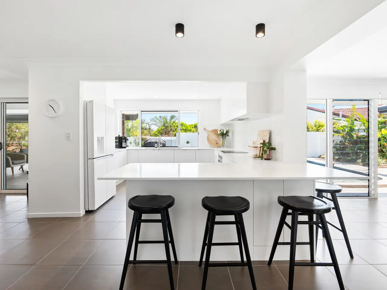 Designer kitchen with pool outlook