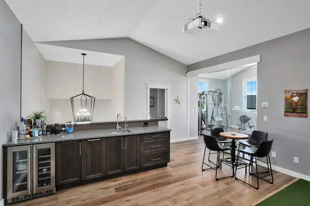 This extraordinary home in Sixty West redefines luxury living with a level of craftsmanship, space, and comfort rarely seen in Central Alberta. With over 3,400 square feet of above-grade living space, it offers a grand yet grounded experience. Soaring ceilings and expansive windows flood the main floor with natural light, framing views of surrounding parkland and walking trails. The expansive layout connects a thoughtfully curated dream kitchen to a warm, welcoming living area. The kitchen is both functional and stunning, with a massive island, premium appliances, and a hidden coffee bar and prep space, perfect for entertaining or everyday ease. Solid wood accents and barn doors add texture and charm throughout, including a quiet main-floor office. Seamlessly integrated into this space is a discreet feature door that opens to the crown jewel: a spacious, private primary retreat that feels more like a luxury spa than a bedroom. The enclosed sunroom with a wood-burning fireplace offers year-round comfort perfect for last-minute get-togethers or quiet mornings with a coffee and a good book. Upstairs, there’s plenty of space to stretch out for yoga, weight training or even host golf nights on your private golf simulator. A wet bar and full bathroom complete the upper floor. The lower level is designed for connection and fun, with a full-sized bar, spacious media room, games areas, and two large bedrooms with private ensuites, perfect for visitors or teenagers. Outside, a fully landscaped, manicured yard with underground sprinklers and multiple decks maximizes outdoor living. The heated three-car garage features a secure dog run and an indoor wash station. Built to an exceptional standard and thoughtfully designed for effortless living, this home offers beauty, comfort, and opportunity in one of Sylvan Lake’s most coveted neighborhoods. This one-of-a-kind home is on a level of its own.