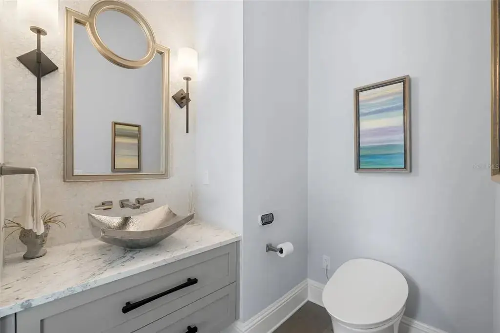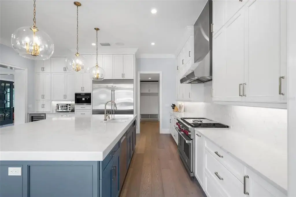 Nestled on one of the most picturesque streets in Beach Park, this custom Bayfair home—completed in 2020—offers timeless elegance, thoughtfully curated upgrades, and exceptional design. Situated on a high-and-dry lot with two-story block construction and a concrete tile roof, the home delivers both peace of mind and refined coastal living. For boating enthusiasts, the property includes a private dock constructed with durable Trex (composite) decking, featuring freshwater access and a 25,000-pound boat lift. The wide canal, dredged for 45’ boats, offers direct access to Old Tampa Bay, allowing you to enjoy the best of Tampa’s waterfront lifestyle with ease and speed. Upon entry, a marble-floored foyer welcomes you inside, opening to an intimate library with floor-to-ceiling built-in bookcases, box beam ceiling and gas fireplace. The spacious living room, lined with French doors, flows seamlessly to the covered patio, creating a natural transition to outdoor living. The formal dining room with custom built-in buffet and serene views out to the expansive backyard and water, connects directly to the heart of the home—an entertainer’s dream kitchen. The chef’s kitchen features a striking 3” quartz island with seating and professional-grade appliances, including a 48” Wolf dual fuel range with grill and griddle, double ovens, Wolf wall hood, Bosch dishwasher, Sharp microwave drawer, Sub-Zero 30" refrigerator and 30" freezer, and Miele built-in coffee system. A full butler’s pantry and oversized walk-in pantry provide additional prep and storage space, along with a U-Line dual zone wine fridge. Downstairs, two bedrooms offer flexibility: one with a walk-in closet and ensuite bath featuring a walk-in shower, and the other currently serving as a light-filled art studio. Additional smart home features on the first floor include a state-of-the-art Kohler Japanese toilet in a beautifully designed half bath, as well as Control4 automation, surround sound, integrated speakers, and automatic shades in the library, dining, and bedroom. Upstairs, the split-bedroom layout continues to impress. A spacious bonus room/game room includes a wet bar, wine fridge, walk-in closet, and dedicated AV closet. Two additional guest suites each offer private baths with marble flooring, elevated vanities, and tub/shower combinations. The owner's retreat is a sanctuary overlooking the water, featuring two walk-in closets, marble flooring, split vanities, marble counters and backsplash, a walk-in shower, soaking tub, and a luxurious Toto Japanese toilet. The upper-level laundry room is outfitted with custom built-ins and a utility sink for convenience. Throughout the home, high-end infrastructure and hand-selected details offer ease and elegance: a whole-home generator, central vacuum system, 4-stop elevator, 3 car garage, three-zone HVAC (2020), two electric tankless water heaters, water softener, Japanese toilets, and Control4 automation. Outside, the resort-style backyard is designed for true Florida living. A covered brick-paved patio and screened lanai with a built-in outdoor kitchen, Marvel beverage unit, and grill make entertaining effortless. The generous saltwater pool and spa are complemented by a separate seating area with a gas fire pit—perfect for evening gatherings. Your Florida Oasis is Now available for private showings.