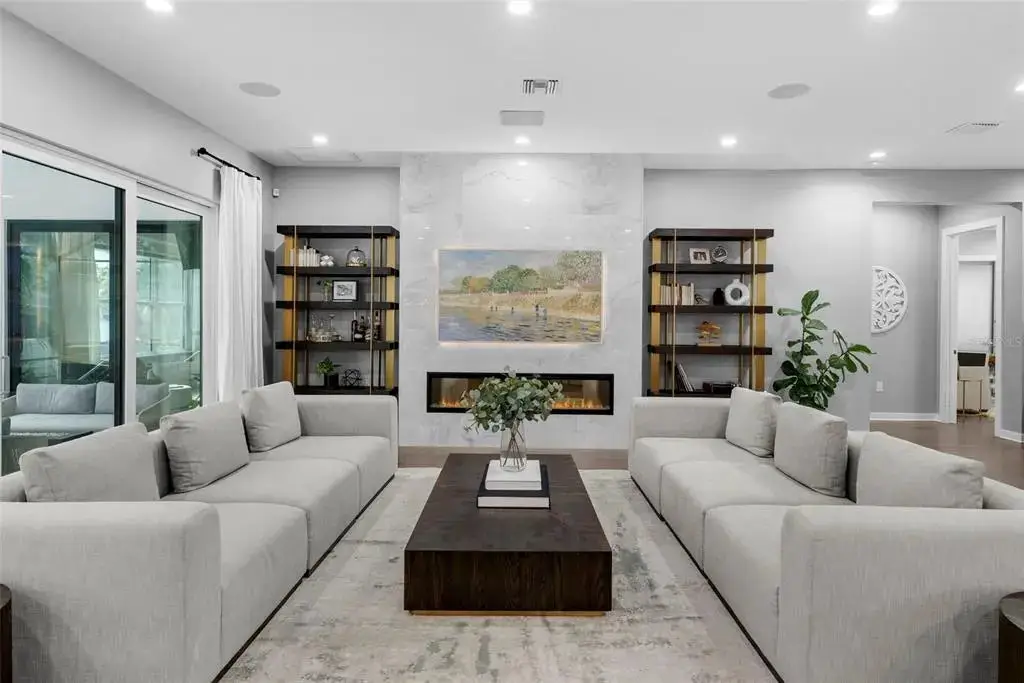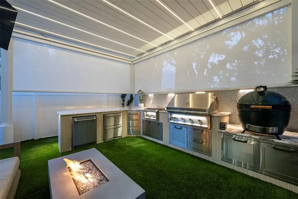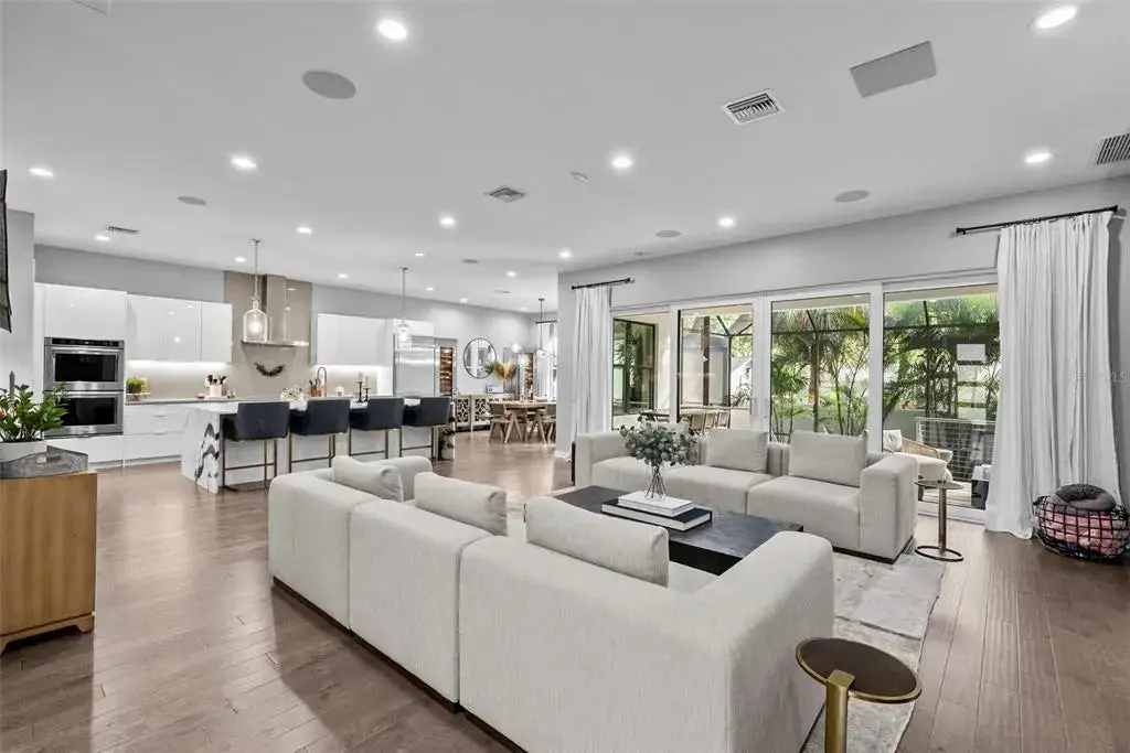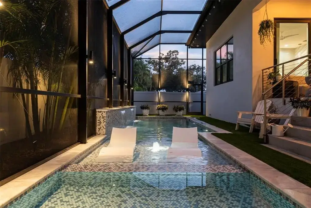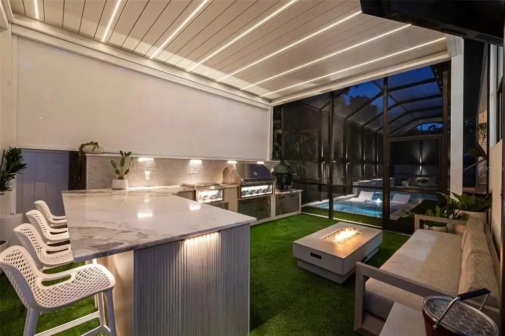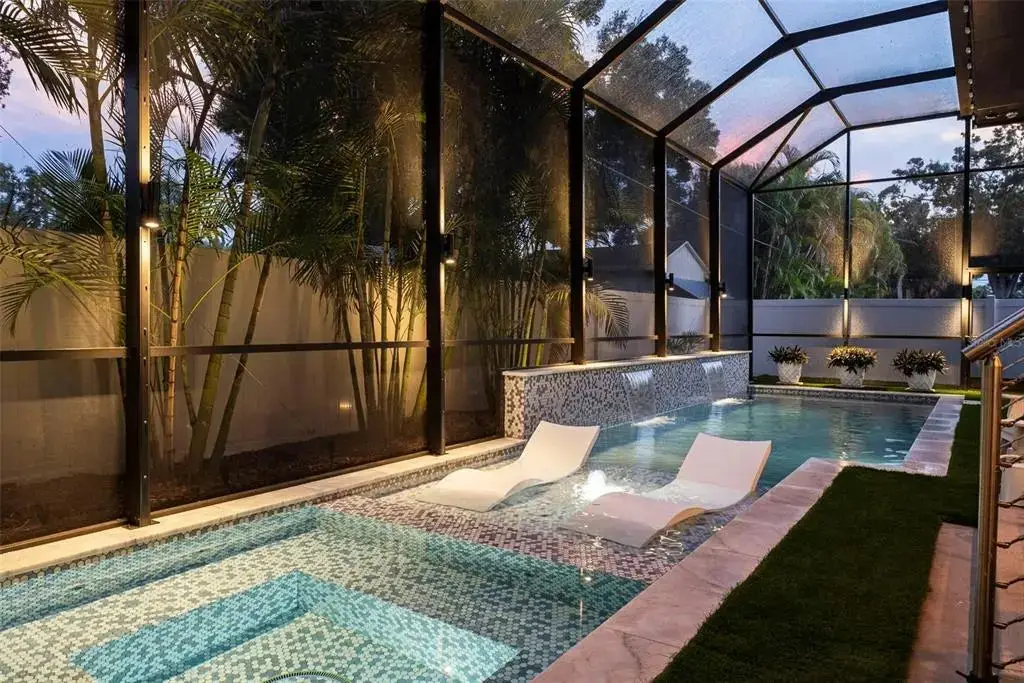 Welcome home to this 2019 Mid-Century Modern masterpiece by premier builder Ferncliff, Inc., perfectly positioned high and dry at 10.64ft in sought-after Bel Mar Shores within the coveted Mabry, Coleman, and Plant A+ school district. Designed for both casual elegance and modern living, this 5-bedroom plus office, 4.5-bath home offers over 4,150 square feet of thoughtfully designed space showcasing exceptional craftsmanship and the highest-quality finishes throughout. The open-concept great room impresses with soaring ceilings, abundant natural light, and expansive hurricane-rated sliding doors that flow seamlessly to the outdoor living areas. The chef’s kitchen is anchored by a dramatic waterfall Quartzite island and features imported Italian white lacquer cabinetry, Quartz countertops and backsplash, top-of-the-line stainless steel appliances, including a 5-burner induction cooktop with hood, double wall ovens, 42” built-in refrigerator, and dishwasher. A walk-in butler’s pantry, under-cabinet lighting, pendant fixtures, a wine bar with stainless sink and refrigerator, and a central vacuum system complete this exceptional culinary space. The first-floor owner’s suite is bright and serene, featuring a custom walk-in closet and a spa-inspired bath with a 6' x 14' walk-in shower with Kohler fixtures, Quartzite double vanity, freestanding soaking tub, and large-format porcelain tile floors. Completing the main level is a home office or playroom, a half bath, a mudroom with built-in storage, and a large laundry room. Upstairs, a striking open-tread staircase with stainless cable railing leads to a gallery landing with 13’ ceilings, three en suite bedrooms with walk-in closets, and a flexible bonus room perfect for a gym, office, or media space. The outdoor living area is a showpiece of its own, featuring a new pool and spa (completed Nov 2024) with color-changing LED lighting, and custom tilework, a 15x19 weatherproof pergola with auto louvers and integrated sun/wind shades, and a full Hestan outdoor kitchen with a 42” grill, 24” power burner, and refrigerator. The entire backyard is finished in lush turf for a clean, low-maintenance lifestyle. Additional highlights include a state-of-the-art whole-home solar power system that keeps electric bills around $15 per month, supported by smart backup batteries for seamless energy reliability (21.56kW system with 56 Meyer Burger 385W panels, 56 IQ8+ microinverters, and Anker Solix backup batteries with smart switch), Marantz surround sound system (living area, kitchen, and primary bath), 50-amp Tesla charger, water softener, custom primary closet built-ins, Dimplex fireplace wall, Swann security system, and new interior and exterior paint (Feb 2025). The oversized two-car garage offers 250 sq ft of elevated storage and a new epoxy floor (Feb 2025), with a ToughShed for additional storage on the southside. All windows and doors, including the garage, are hurricane-rated and high-security impact-grade, and the home includes dual-zoned 16 SEER HVAC, a smart DSC security system with app control, LED lighting throughout, in-wall pest tubes, and a Rainbird irrigation system. Located just minutes from Tampa’s best dining, shopping, and cultural attractions—and only seven miles from Tampa International Airport—this home perfectly blends architectural sophistication, energy efficiency, and the relaxed elegance of South Tampa living.