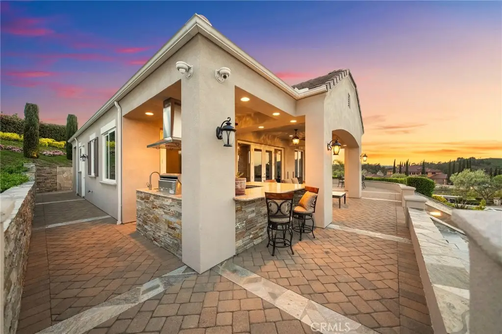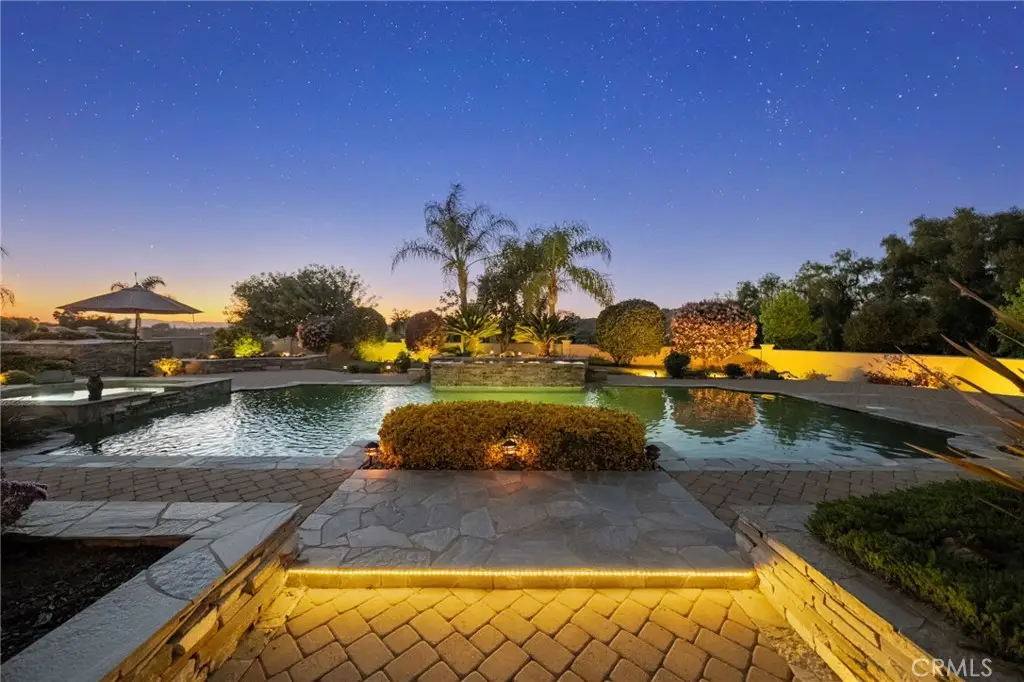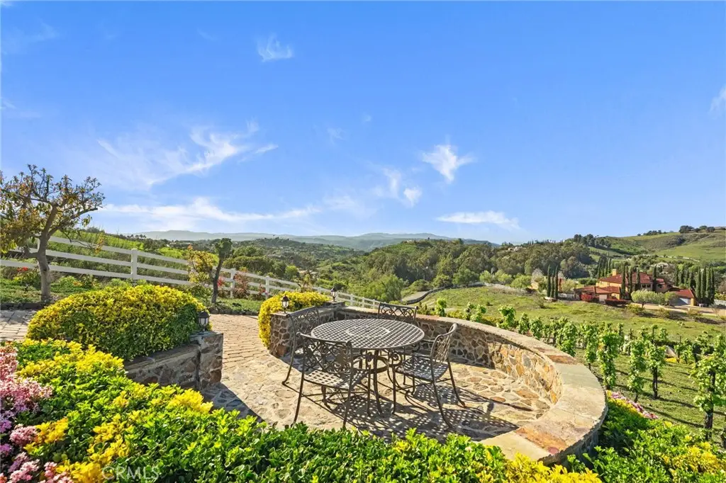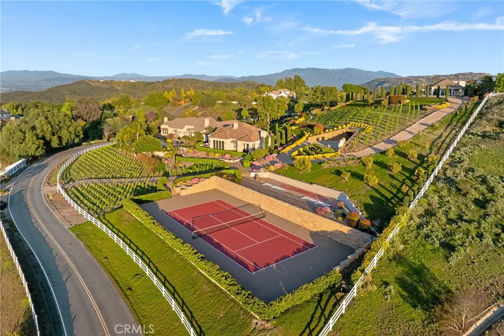 One-of-a-kind estate located just 5 minutes from the charm & culture of Old Town Temecula. Set behind 3 private gated entrances, this sprawling 4.19 acre compound features 3 separate single-story residences & an underground wine cellar all totaling approx. 6100 sq ft, masterfully positioned to capture breathtaking sunset views across rolling hills. The grounds truly set this estate apart; meticulously manicured landscapes framed by stately Italian cypress trees create an outdoor setting unlike any other. A dramatic stone stairway leads from the main home to the elevated studio residence. Entertain w/ ease and elegance w/resort style amenities; sparkling pool, two separate spas, water features, outdoor fireplaces, 2 putting greens, a sports court, & a post-tensioned tennis court w/ breathtaking views. Plus 2 built-in BBQ islands & pizza oven. Approx. 30,000 sq ft of stone pavers weave through the property. The main residence is approx. 3,275 sq ft w/ travertine flooring & architectural arches. It features 3 bedrooms, office, & 3.5 baths. The gourmet kitchen complete with granite countertops, 2 sinks, stainless steel appliances, built-in refrigerator, walk-in pantry, wine fridge, butler's pantry, & bar seating-all flowing seamlessly into the family room w/ views of the pool & gardens. The primary suite offers a private retreat w/ its own fireplace & French doors leading to the amazing pool & spa. The guest house offers approx. 1,600 sq ft of luxury living w/ 2 bdrms, 2 baths, a chef's kitchen, & fully retractable glass doors opening to commanding views of the surrounding countryside. At the estate's highest point, the studio offers approx. 600 sq ft of open-concept living, complete with an elevated desk area, curved wine bar, a built-in spa, putting green, rooftop lounge, ATV-sized garage, & unmatched panoramic vistas. A 600 sq ft stand-alone reinforced concrete wine cellar is the perfect sanctuary for wine-making enthusiasts - complemented by approx. 1,000 wine grapevines and 21 table grapevines, as well as approx. 100 avocado trees, and various fruit trees. Additional features include upgraded mahogany garage doors, extensive landscape lighting, whole house & outdoor sound systems, multiple whole-house fans for year-round comfort, & a comprehensive security system. Perfect for a multigenerational compound, vineyard retreat, or entertainer's paradise, this Temecula estate redefines California luxury living with a setting that must be seen to be believed.