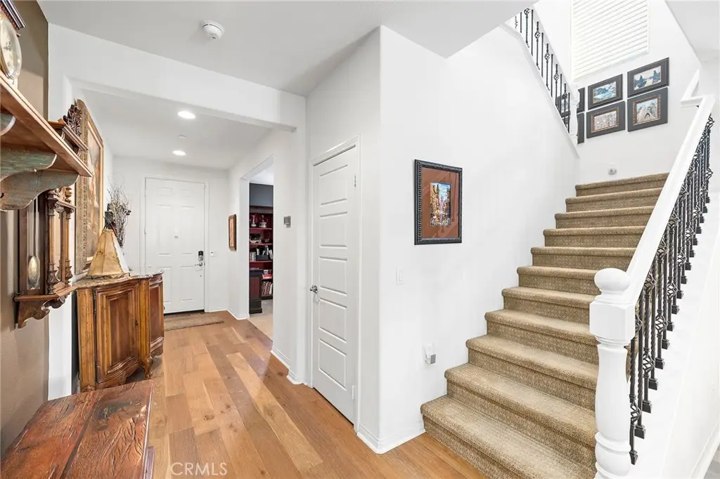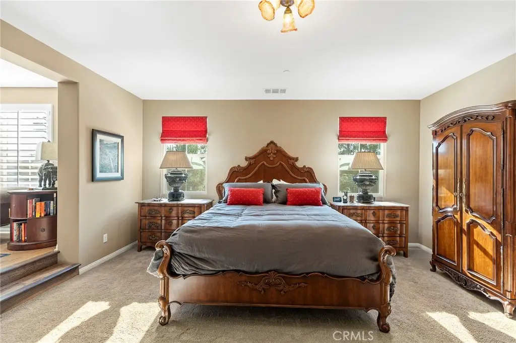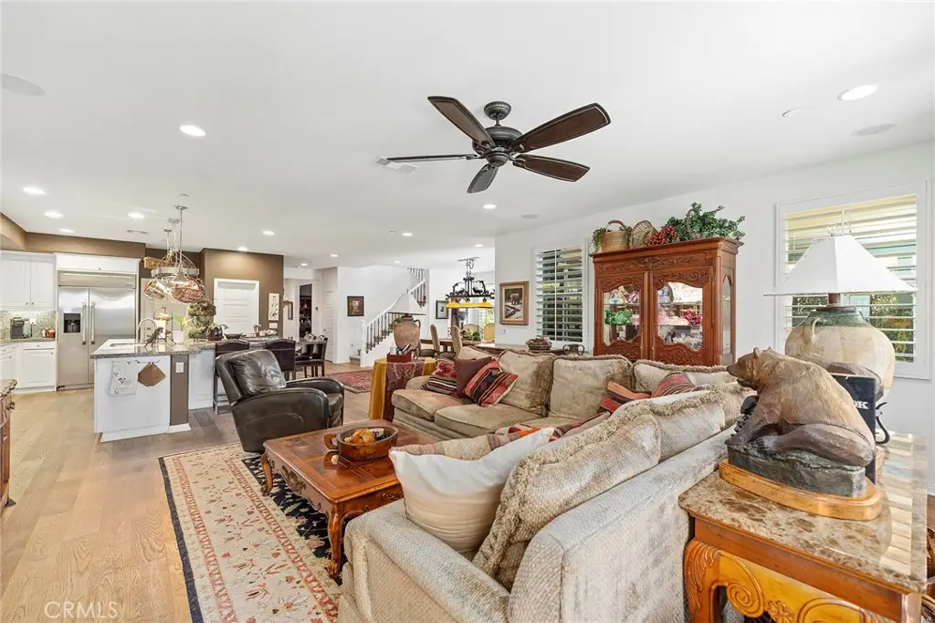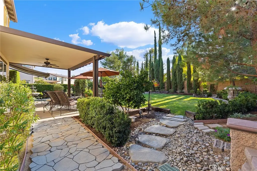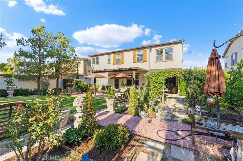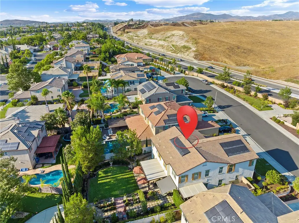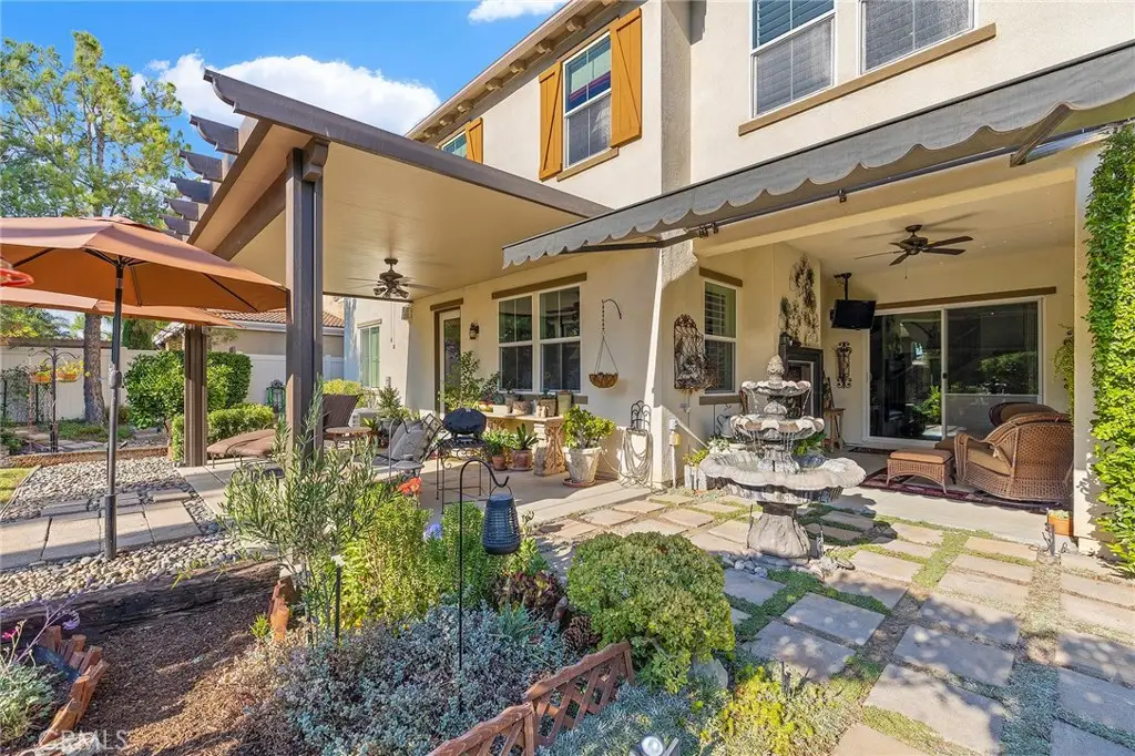 Absolutely the best in the beautiful Belle Maison community of Temecula! Located immediately adjacent to the Temecula Wine Country - this spectacular home boasts top quality upgrades and decorating in every corner, a spacious open floor plan with 5 bedrooms, 3 baths, plus office and loft, and a huge yard with two covered patios and an outdoor fireplace! The floor plan features one bedroom and full bath downstairs. There is a huge Formal Dining Room with large custom rustic chandelier, spacious open Great Room with a cozy fireplace, and Gourmet Kitchen with center island, built-in Breakfast Island attached, built-in stainless GE Monogram refrigerator and appliances, walk-in pantry, white cabinets, and more. Downstairs there is also a formal living room or office option. The stairs are lined with a wrought iron railing, and upstairs you will find a huge main suite with a large workout area/sitting room, a media room/loft at the top of the stairs, and three other bedrooms. One of the bedrooms is currently used as an office, and the office furniture is available to stay. Carpeting is absolutely the best, hardwood oak flooring and quality tile, all with a Neutral pallet, plantation shutters, custom draperies, custom lighting add to the ambiance. In the elegant backyard, you will find two covered patios, one with a fireplace, many fruit trees, flowering shrubs, cypress and pine trees, and walkways creating a private oasis. A 3-car garage with many overhead storage racks, immaculate epoxy flooring, Tesla Batteries are included, and the leased solar system provides discounted electric costs. All Televisions are included, and some of the furnishings such as the desk in the office could be available.