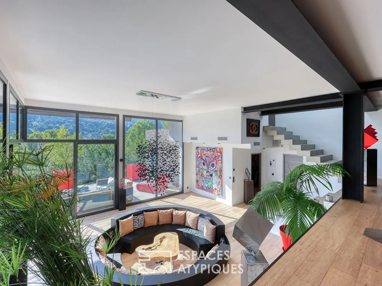 Villa contemporaineIn a green setting just 10 minutes from the sea between Toulon and Hyeres in the Var region, this modern contemporary architecture house skillfully unfolds over 345 sqm offering a unique living experience, combining spectacular volumes, natural light, and design.Upon entering, the eye is drawn to the immense bay windows and high ceilings that give the whole an impression of space and elegance.The architecture plays with the inside-outside boundary, letting nature generously invite itself thanks to large sliding windows and concrete caps. Perspectives, materials, and colors respond to each other in a bold harmony.The large-format villa extends over a fully landscaped and automated plot of approximately 2,000 sqm, where each space has been designed to offer a rare and convivial quality of life. As if taken from a Kubrick film, the sunken living room offers a panoramic view of the exterior and stands out as a unique living space.The theatrical dining room harmoniously complements the living room, connected to a fitted and equipped kitchen, ingeniously designed for entertaining with its counter.The true heart of the house, this ensemble creates a warm and unique atmosphere. It opens widely onto an elegant set of sheltered terraces and a heated infinity pool, facing the hills and the sea. The serenity of the place is reinforced by lush, carefully maintained vegetation, which envelops the property in a feeling of intimacy and well-being. On the night side, the villa offers five bedrooms, including two suites, all designed with noble and custom-made materials.he generous volumes and numerous storage spaces testify to a successful design.On the lower floor, an art gallery-style home office reveals itself as a confidential space, ideal for working. The atmosphere continues in a room dedicated to evenings, where billiards, pinball, fireplace and sofas create a convivial setting.Outside, a bowling alley in the shade of the trees evokes the Mediterranean art of living.Fully controlled by home automation, it combines modernity, comfort and current standards. A wine cellar, annexes, a garage and parking for several vehicles complete this free-form property.A rare architectural work in the Var, designed for lovers of atypical spaces where design, conviviality and nature meet near the sea.ENERGY CLASS: A / CLIMATE CLASS: A Estimated amount of annual energy expenditure: between EUR1,207 and EUR1,392 (2021 price reference)Information on the risks to which this property is exposed is available on the Georisques website: www.georisques.gouv.frEspaces AtypiquesREF. 13327Additional information* 8 rooms* 5 bedrooms* 3 shower rooms* 4 floors in the building* Outdoor space : 2000 SQM* Parking : 5 parking spaces* Property tax : 4 000 €Energy Performance CertificatePrimary energy consumptiona : 47 kWh/m2.yearHigh performance housing*47kWh/m2.year1*kg CO2/m2.yearA*B*C*D*E*F*GExtremely poor housing performance* Of which greenhouse gas emissionsa : 1 kg CO2/m2.yearLow CO2 emissions*1kg CO2/m2.yearA*B*C*D*E*F*GVery high CO2 emissionsEstimated average annual energy costs for standard use, indexed to specific years 2021, 2022, 2023 : between 1289 € and 1745 € Subscription IncludedAgency feesThe fees include VAT and are payable by the vendorMediatorMediation Franchise-Consommateurswww.mediation-franchise.com29 Boulevard de Courcelles 75008 Paris