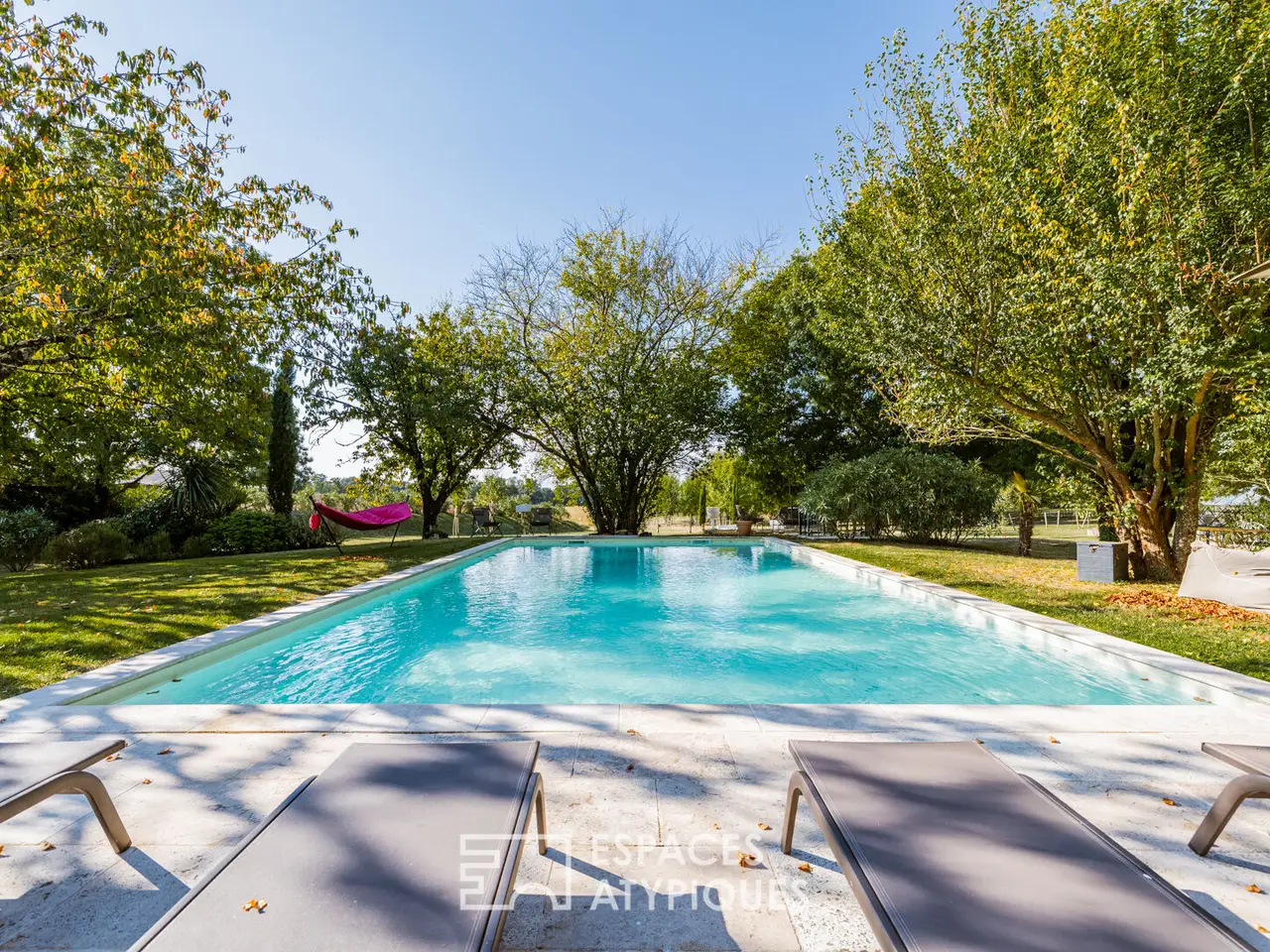 Located just 10 minutes from Saintes, this former wine-growing residence dating from 1700 has been carefully renovated with high-quality materials, offering an elegant and warm living environment. Nestled away from prying eyes, the long tree-lined driveway leads to the property. As soon as you enter, the magnificent stone staircase sets the tone. The steps, bearing the traces of time, bear witness to the history and authentic character of this residence. The comfortable living room invites you to relax in a cozy atmosphere, enhanced by a fireplace preserving the spirit of the place. On the opposite side, a dining room or a second living room naturally leads in its continuity to the kitchen. This spacious and modern living room, with neat finishes, is ideal for entertaining. The house has a functional linen room and boiler room. On the same level, an intimate cinema room promises special moments, while a gym and a hammam invite you to take care of yourself. Upstairs, a large landing, ideal for an office bathed in light, leads to four bedrooms, two of which have their own private bathroom. A bathroom and toilet complete this level. This property stands out for its vast outdoor space, a true haven of peace. The heated swimming pool is accompanied by its pool house perfectly fitted out as a bar and a summer kitchen. Independent, a bedroom and its bathroom enjoy a pleasant view of the pool and nature. This outdoor ensemble perfectly complements the bucolic setting and the high-end services of this exceptional residence. This property offers three gites offering multiple possibilities, developing a seasonal rental activity or enjoying independent spaces for guests, these gites being real assets. Each accommodation has been tastefully furnished and integrates harmoniously into the entire property, while ensuring total independence for the occupants. Note, a nice surprise to discover during the visit which will not fail to seduce the most epicureans. ENERGY CLASS: C / CLIMATE CLASS: C. Estimated average amount of annual energy expenditure for standard use, established from 2021 energy prices: between EUR5,400 and EUR7,380. REF. EALR2054 Additional information * 20 rooms * 10 bedrooms * Floor : 1 * Outdoor space : 20825 SQM * Property tax : 2 777 €