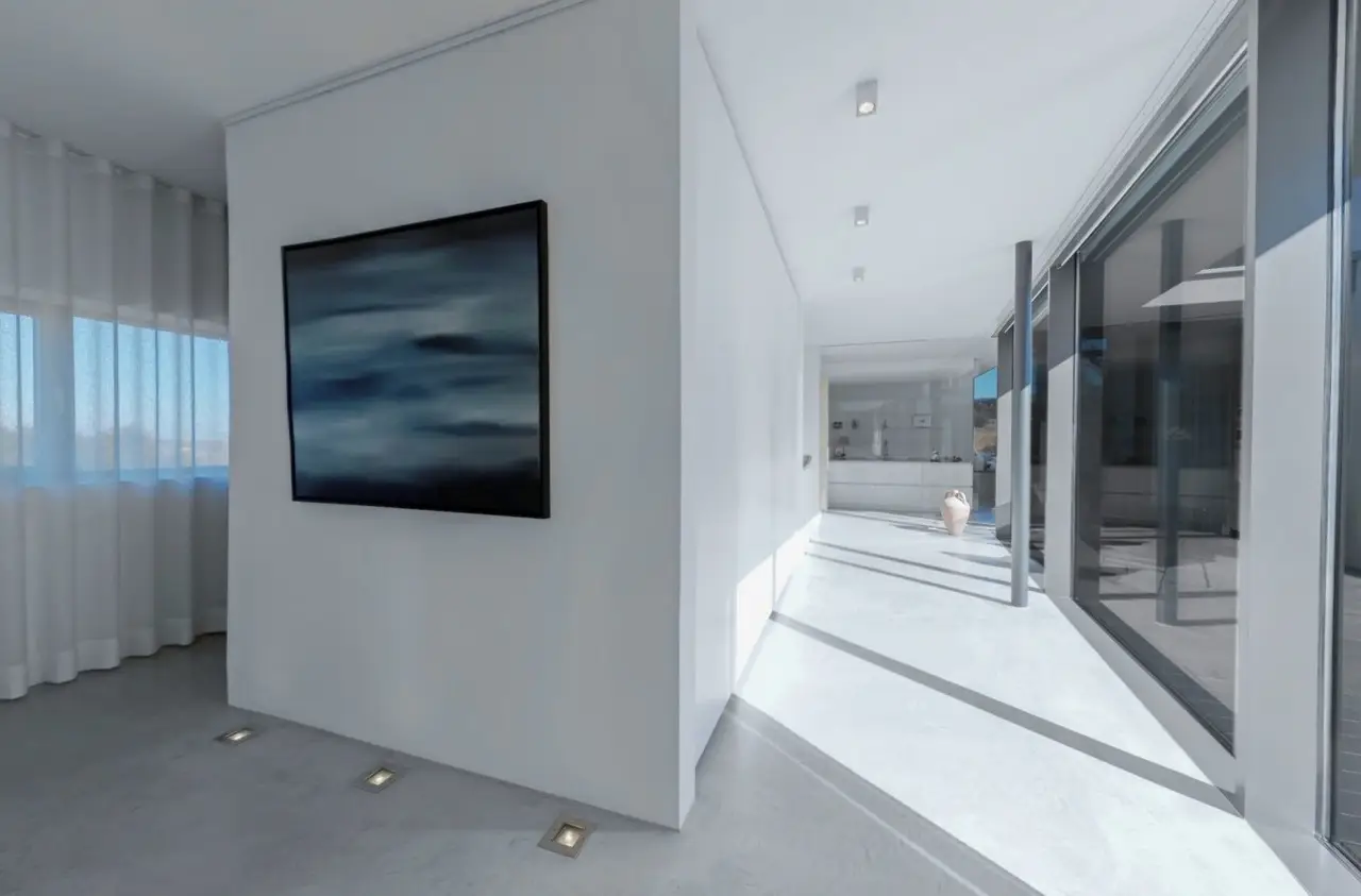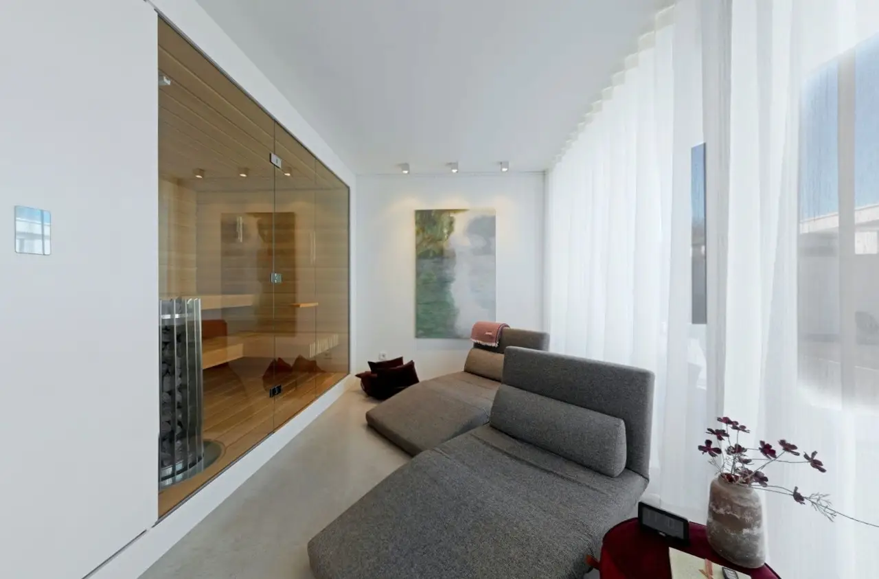 Property with a "conscience" A spacious and luxuriously furnished villa is for sale, which was built in 2006/2007 and has been extensively optimized time and again. It is technically and qualitatively up to date and ready to move into. As soon as you enter the house, you immediately get a feeling of lightness, openness and privacy. This is created by the atrium design combined with extensive window areas, which ensure a natural flood of light and room heights that are extraordinarily generous by local standards (dining area up to 3580 mm, remaining ground floor 2640 mm). Embedded in the "U" of the Atrium house on the ground floor is the beautiful pool surrounded by a large terrace area, which can also be variably extended by a walk-on cover. This is complemented by an integrated barbecue station and an adjacent pond. On the garden level, there is a further terrace area along the living room and bedrooms as well as a beautiful large green area with trees, which offers space for children to play and run around. Last but not least, the attractive kitchen with dining area should be mentioned as the focal point of the house, which invites you to enjoy cooking for yourself as well as "cooking up" with guests. It blends in exceptionally harmoniously with the overall living concept and is superbly equipped. This area is spacious and open to the dining area. A closed fireplace, glazed on two sides, rounds off the overall picture and creates a feel-good atmosphere. The directly adjoining living room can be directly integrated or separated by a floor-to-ceiling sliding door (inside the wall). The entire house is generously equipped with high-quality built-in wardrobes on both the ground floor and the garden level. The plot area is 700 m2. The clever integration of the house into the gentle slope, the garden-side window façade open to nature and the optimal garden design create a unique connection with the directly adjacent natural surroundings. The garden was designed in collaboration with a garden architect. The garden is equipped with a modern, fully automatic irrigation and sprinkler system for all beds and lawns as well as a lighting system controlled by motion detectors. Interested? We would be happy to provide you with a detailed exposé with further information on request. We would be happy to arrange a viewing and present this outstanding property to you in person. Get in touch with us!