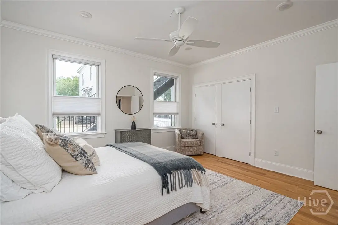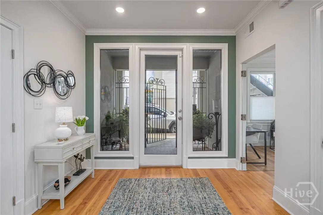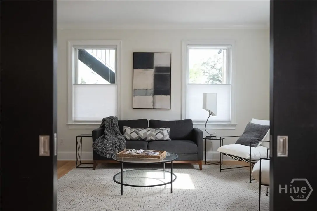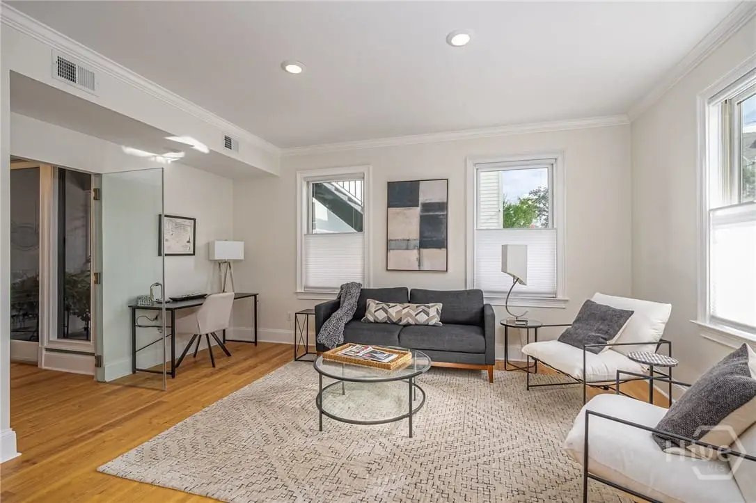 Rare single-level garden condominium in Savannah’s Landmark Historic District offering over 2,000 square feet of luxury living with a coveted private garage. One of only four residences in an impeccably maintained building, this stair-free home features designer details, sophisticated finishes, soaring 9-foot ceilings and has been completely renovated in the last few years. The large, open floor plan centers on an expansive living area and showstopping kitchen with waterfall quartz island, three ovens, pot filler, custom vent hood, and hidden coffee/bar stationperfect for entertaining. Flexible bonus rooms provide options for office, den, or third bedroom. The owner's suite offers a dressing area, oversized walk-in closet, and spa-style bath with double vanities and walk-in shower. A serene shared courtyard connects to secure garage parking. Just steps from celebrated restaurants, shops, and cultural attractions.