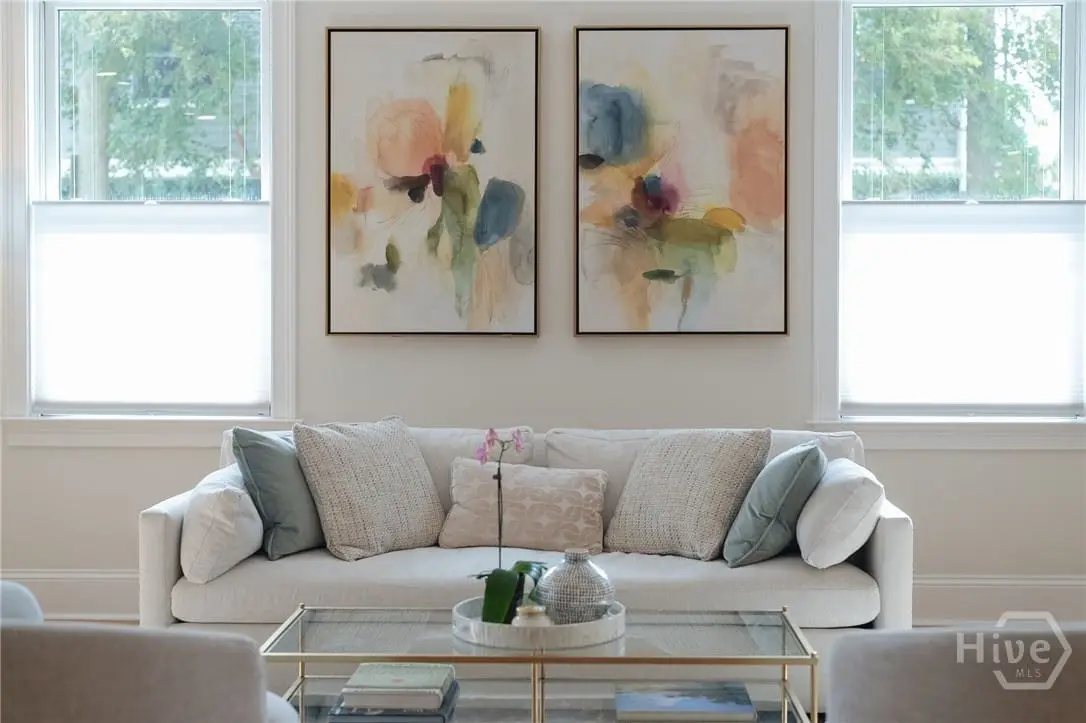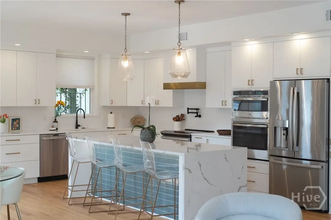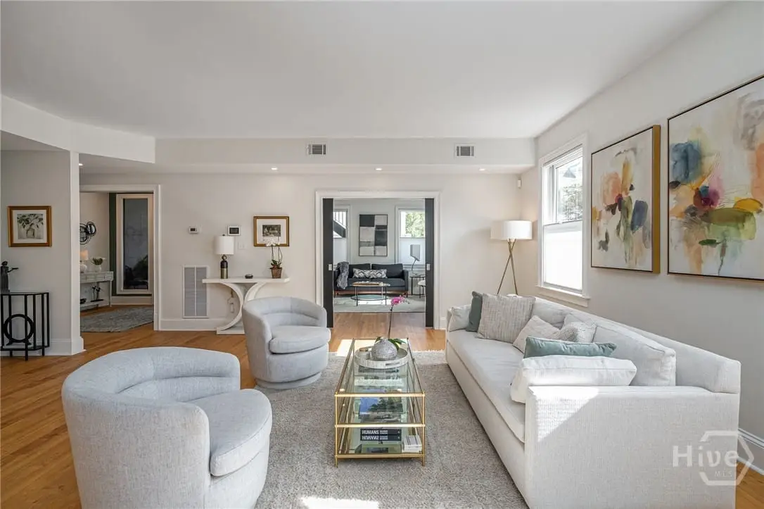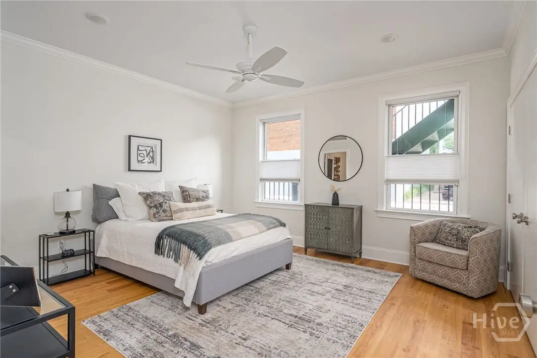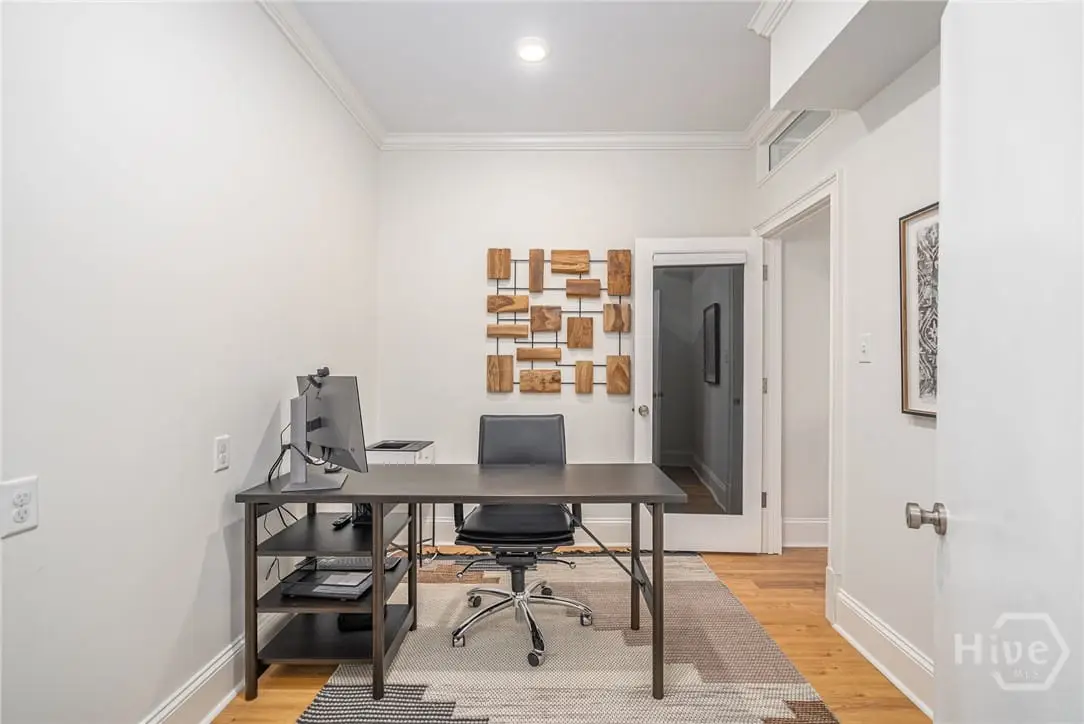 Rare single-level garden condominium in Savannah’s Landmark Historic District offering over 2,000 square feet of luxury living with a coveted private garage. One of only four residences in an impeccably maintained building, this stair-free home features designer details, sophisticated finishes, soaring 9-foot ceilings and has been completely renovated in the last few years. The large, open floor plan centers on an expansive living area and showstopping kitchen with waterfall quartz island, three ovens, pot filler, custom vent hood, and hidden coffee/bar stationperfect for entertaining. Flexible bonus rooms provide options for office, den, or third bedroom. The owner's suite offers a dressing area, oversized walk-in closet, and spa-style bath with double vanities and walk-in shower. A serene shared courtyard connects to secure garage parking. Just steps from celebrated restaurants, shops, and cultural attractions.