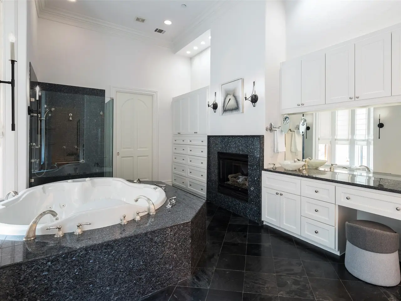 Stately traditional highlighted by timeless elegance in this handsome custom-built home in the rarely available Estates section of guard gated Lake Forest. Sited on a nearly .3 acre lot in the highly coveted exclusive enclave with only 19 residences, this home enjoys serenity and privacy. A gracious double door entry leads to a grand foyer with vaulted ceilings and generously sized formal dining area. Well designed layout with open floorpan framed by walls of windows, high ceilings and exquisite moldings. The expansive great room with fireplace is open to the kitchen and breakfast area with a massive center island, custom built-ins, double ovens, built-in range, wet bar and butler's pantry. The downstairs primary suite boast a sitting area with fireplace and custom built-ins, luxurious separate his-her baths and two custom finished walk-in closets. An additional guest suite is located on the first floor for convenience. Upstairs provides stunning views of the private lake and encompasses three additional bedrooms and a generous sized game room with wet bar. Beautiful features and amenities for everyday living and entertaining including a marble floored temperature controlled wine cellar, elevator, and three fireplaces. This elegant retreat offers security, luxury, privacy, and amenities galore! Lake Forest is comprised of 170 acres of park-like grounds with green spaces, lakes, and towering oaks. Residents enjoy walking trails, community pool, tennis & pickle ball courts, and dog parks.