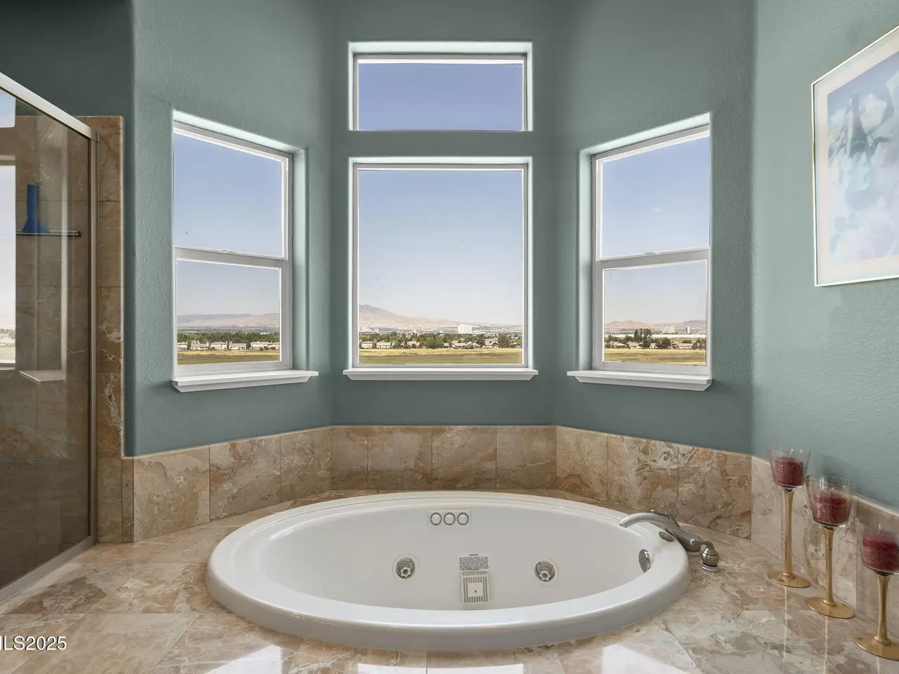 Welcome to one of Rosewood Lake Estates' most captivating homes—perched on a hill with panoramic city and mountain views that will take your breath away. From sunrise to sunset, nearly every window frames a picture-perfect view, offering a daily reminder of why this is one of Reno's most desirable areas. Just down the street from Hidden Valley Golf Course and Country Club, this residence blends refined comfort with thoughtful design and effortless access to both Reno and Sparks. Step inside to find a meticulously maintained interior, intentionally crafted for both energy efficiency and beauty. Expansive windows flood the home with natural light, while dual-zone heating and cooling keep every space perfectly comfortable year-round. The engineered hardwood floors run seamlessly throughout, complementing the finishes and recent updates. The heart of the home is the kitchen—featuring brand-new appliances (all included), central vacuum system, and ample workspace for everyday cooking or entertaining. The formal dining room sets the stage for memorable gatherings, and the living room's gas log fireplace offers a cozy focal point. The spacious primary suite is a true retreat, offering sweeping views, a custom built-in closet system, a large jetted tub. An additional ensuite bedroom on the main level provides flexibility for guests or multi-generational living, while the remodeled bathrooms throughout the home add a fresh, modern feel. An oversized 26-foot, three-car garage with EV charging station offers plenty of space for vehicles, storage, or hobbies. Additional features include instant hot water with dual tanks, extra parking with a gated concrete pad for an RV or trailer, and a storage shed in the backyard. The HOA provides excellent amenities—including a pool, spa, clubhouse, tennis and basketball courts, a private park, and a walking trail. Grocery shopping, dining, and everyday conveniences are less than a mile away. This is more than a home—it's a lifestyle of comfort, convenience, and unmatched views, all in a location that perfectly balances privacy with accessibility.